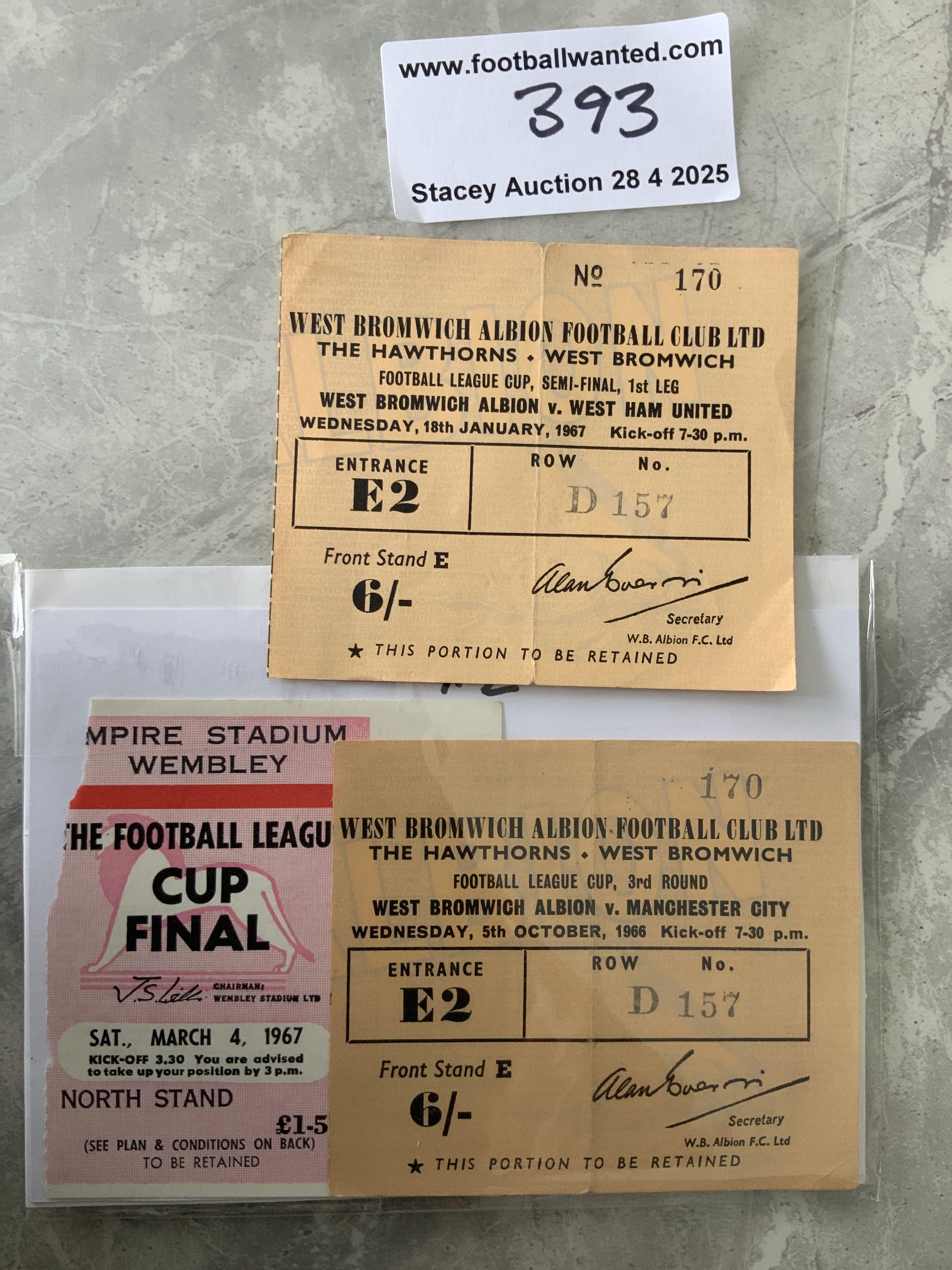 West Brom 1960s League Cup Programmes + Tickets: 1966 League Cup Final programme in good condition. C/W from the following seasons league cup run Man City and West Ham semi final programmes and tickets which have score to cover all played at West Brom.
