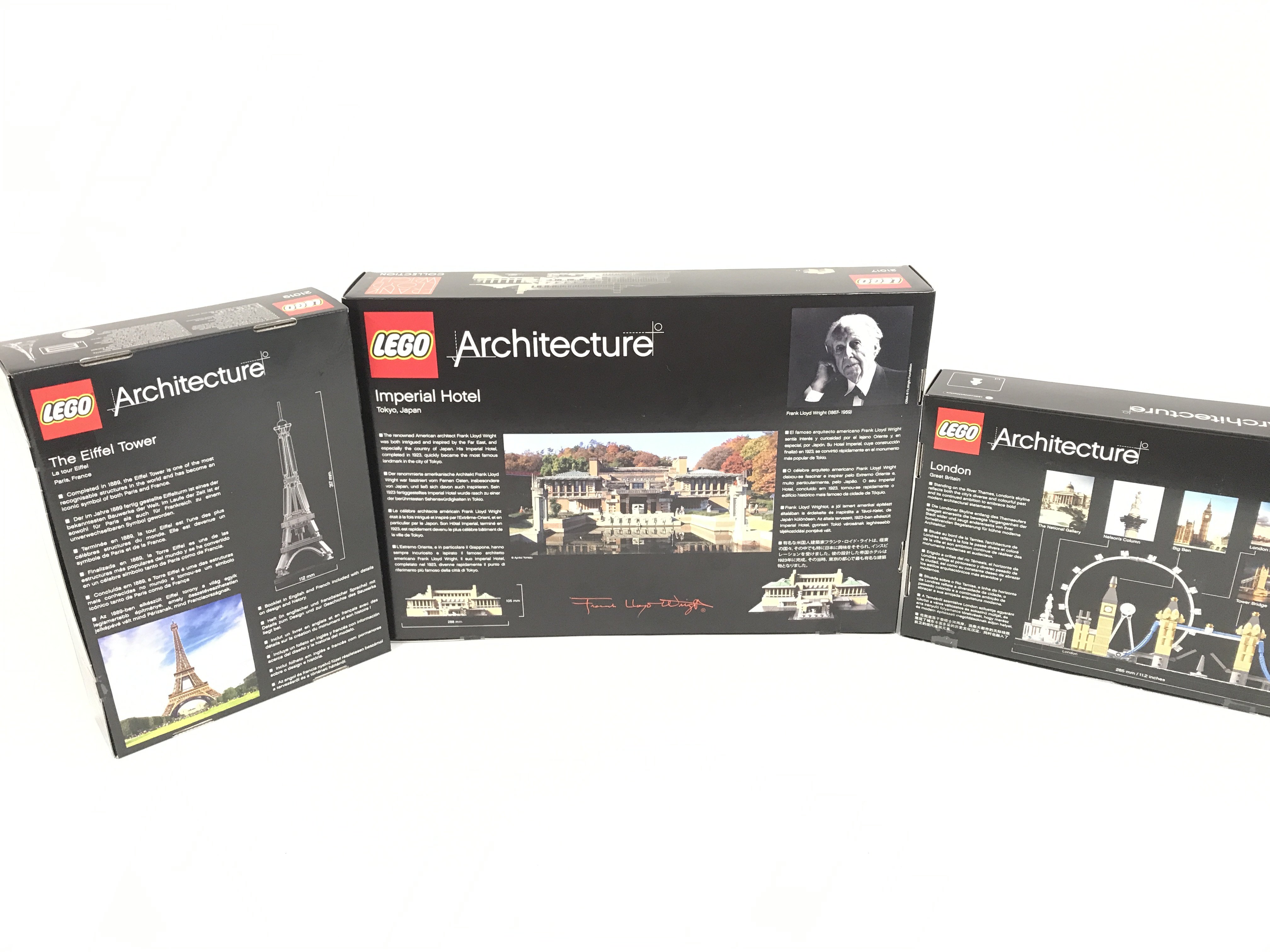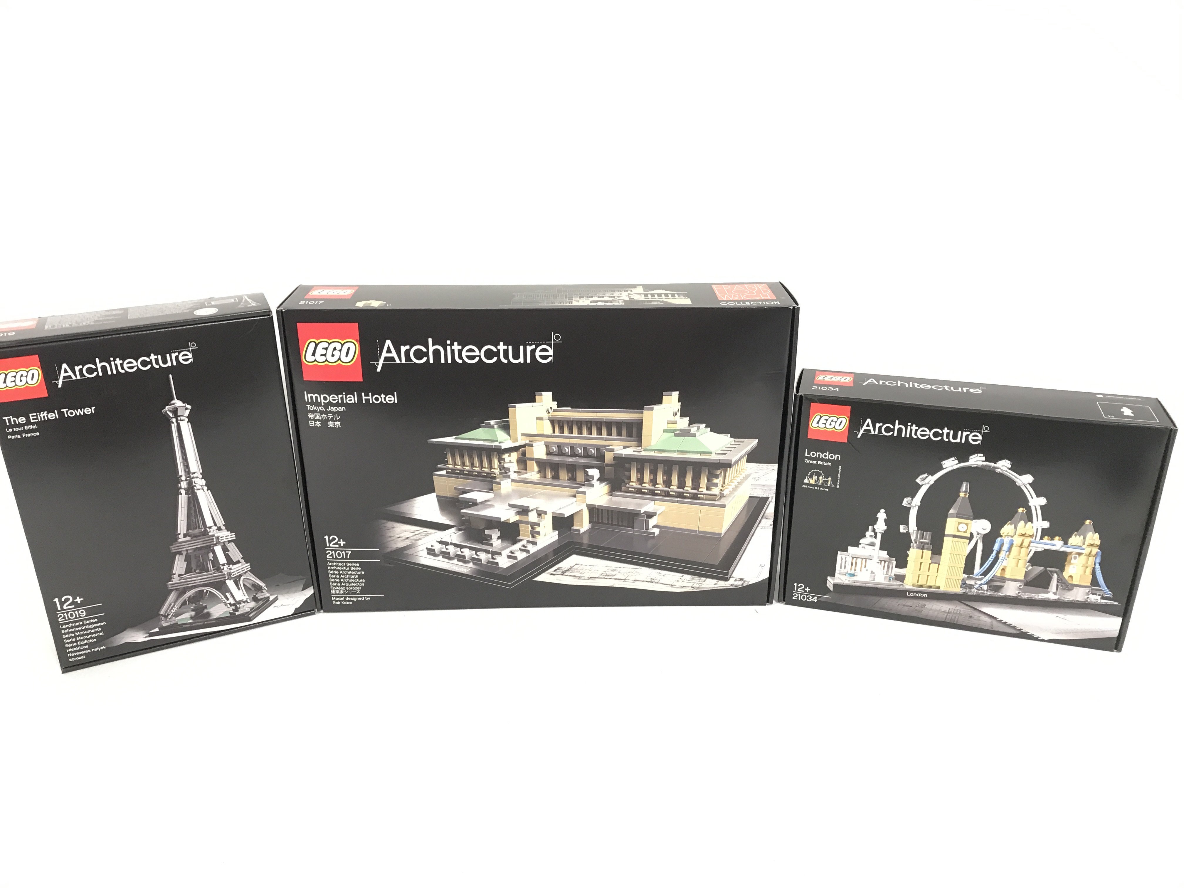 3 boxed and sealed Lego Architecture sets to include London 21034, Imperial Hotel 21017, Eiffel Tower 21019. No reserve.