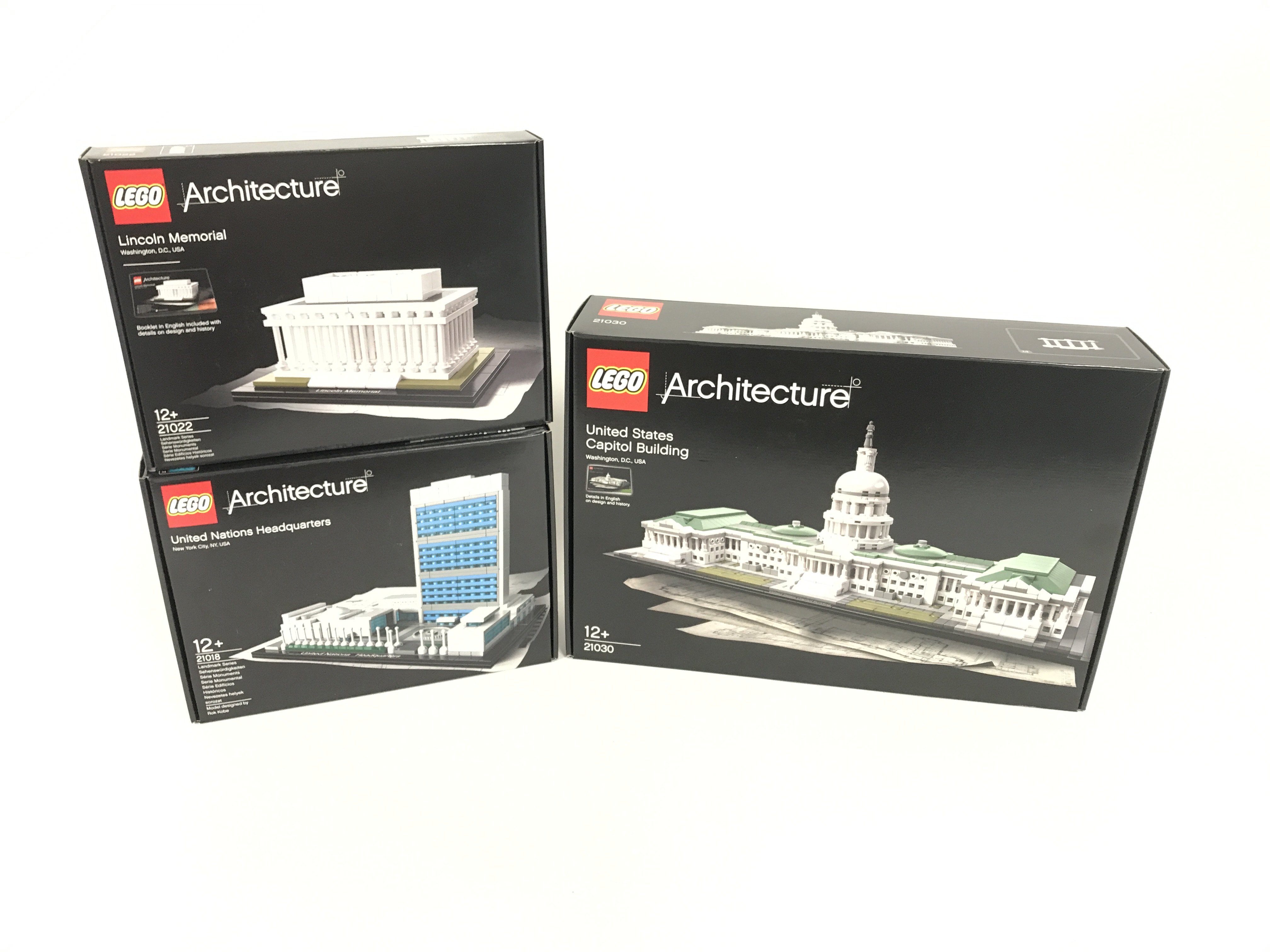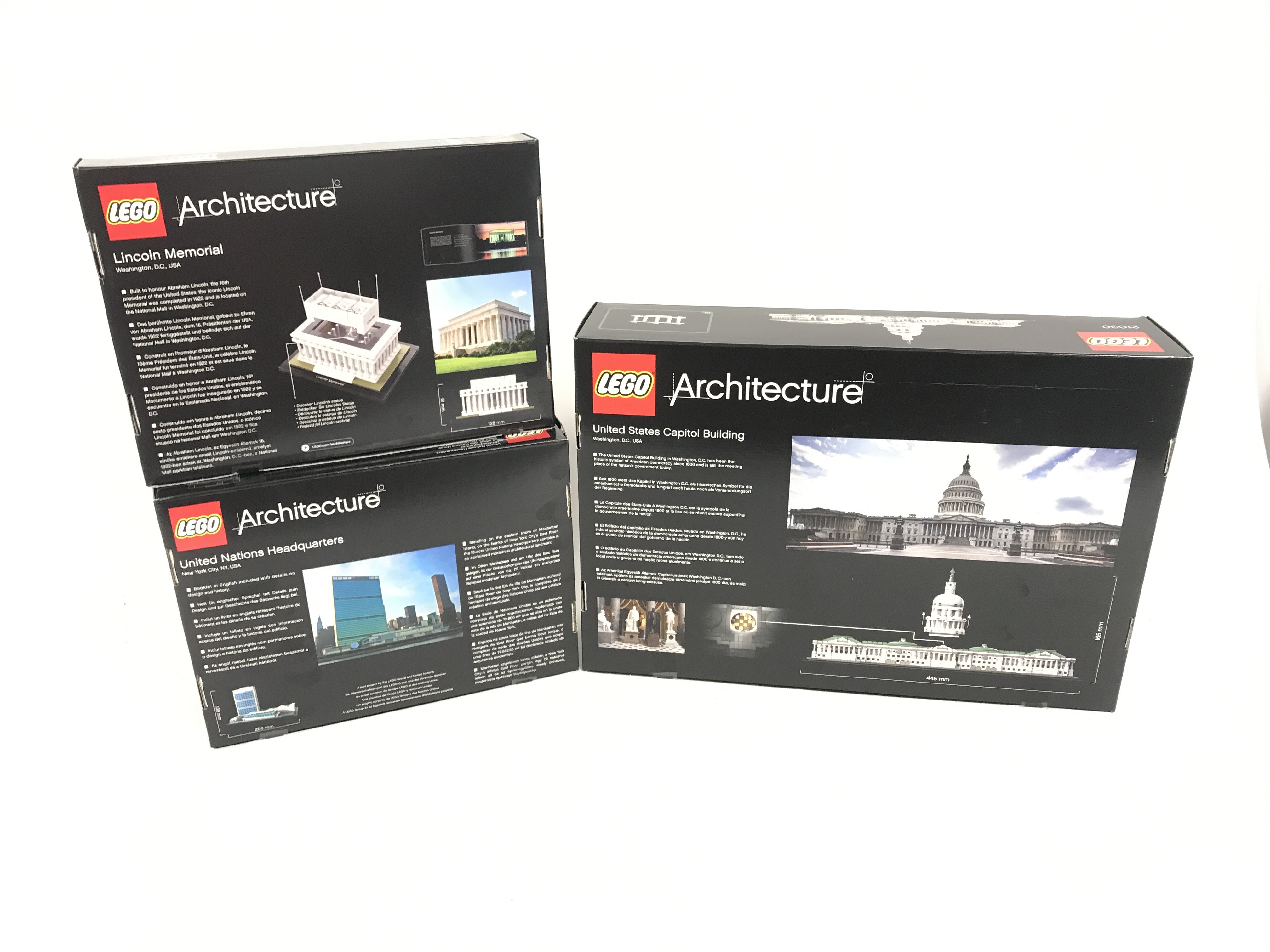 3 boxed and sealed Lego sets, to include United States Capitol Building 21030, United Nations Headquaters 21018 , Lincoln Memorial 21022. No reserve.