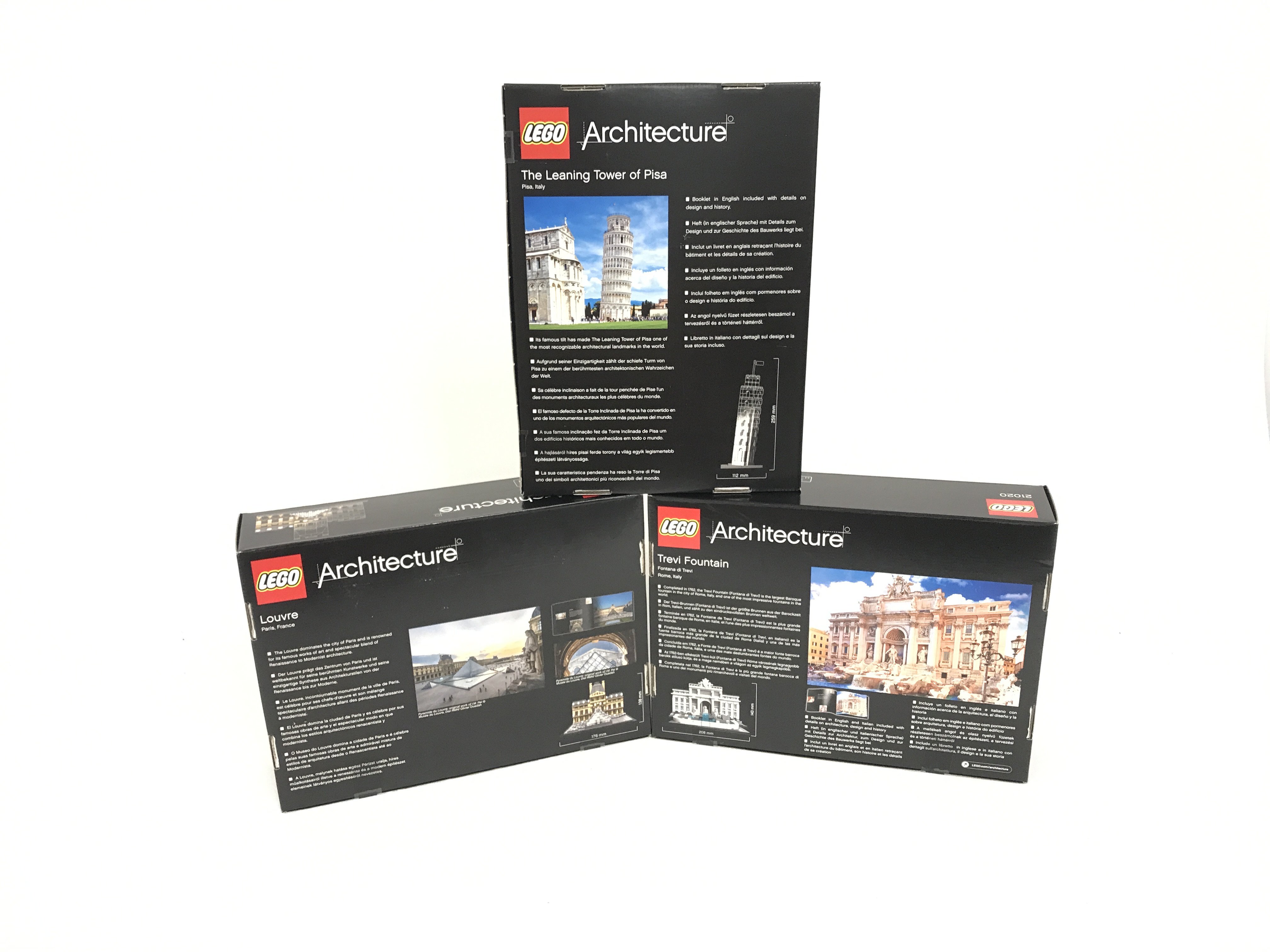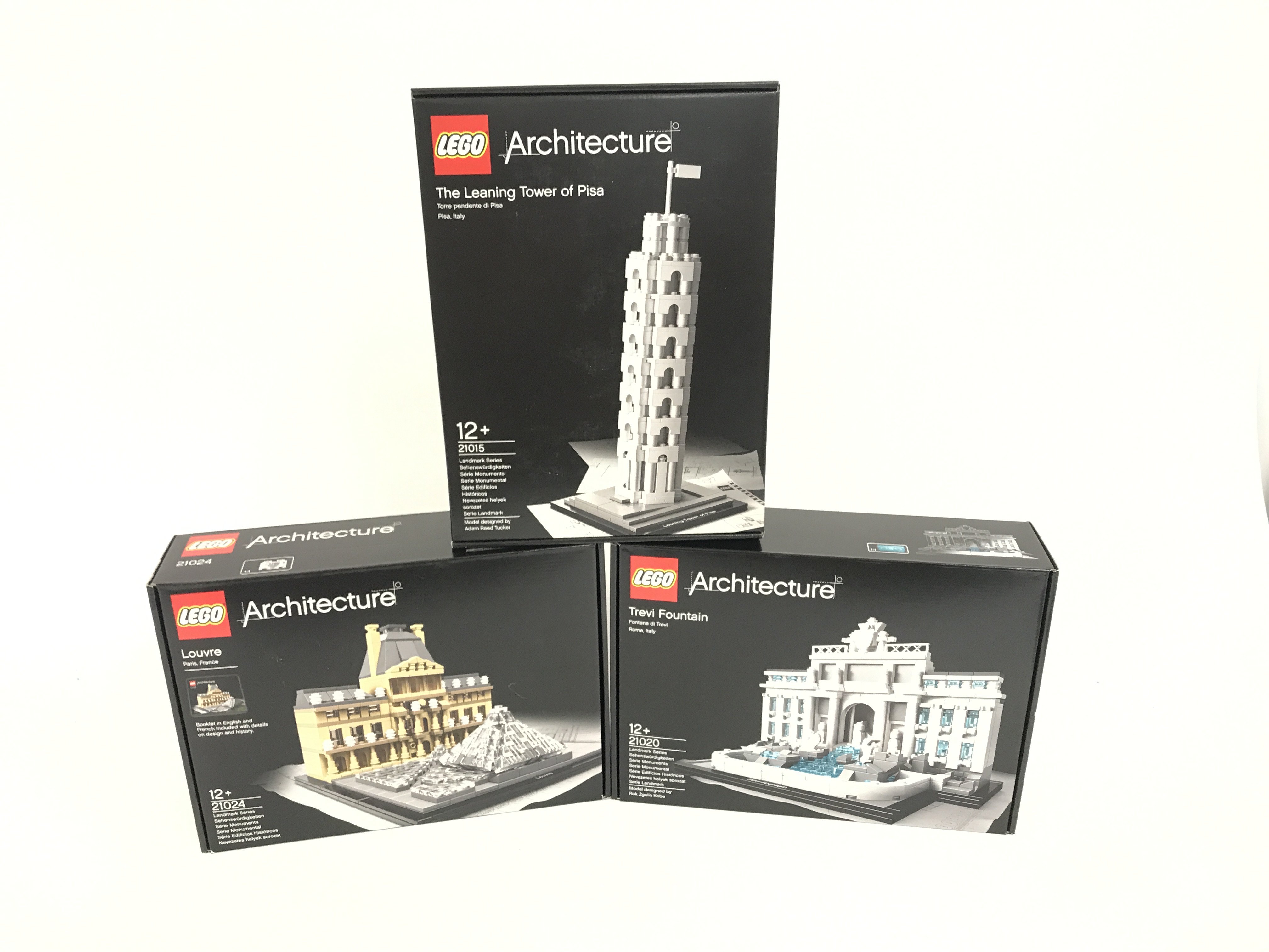 3 boxed and sealed Lego sets, to include Trevi Fountain 21020, Leaning Tower of Pisa 21015, Louvre 21024. No reserve.