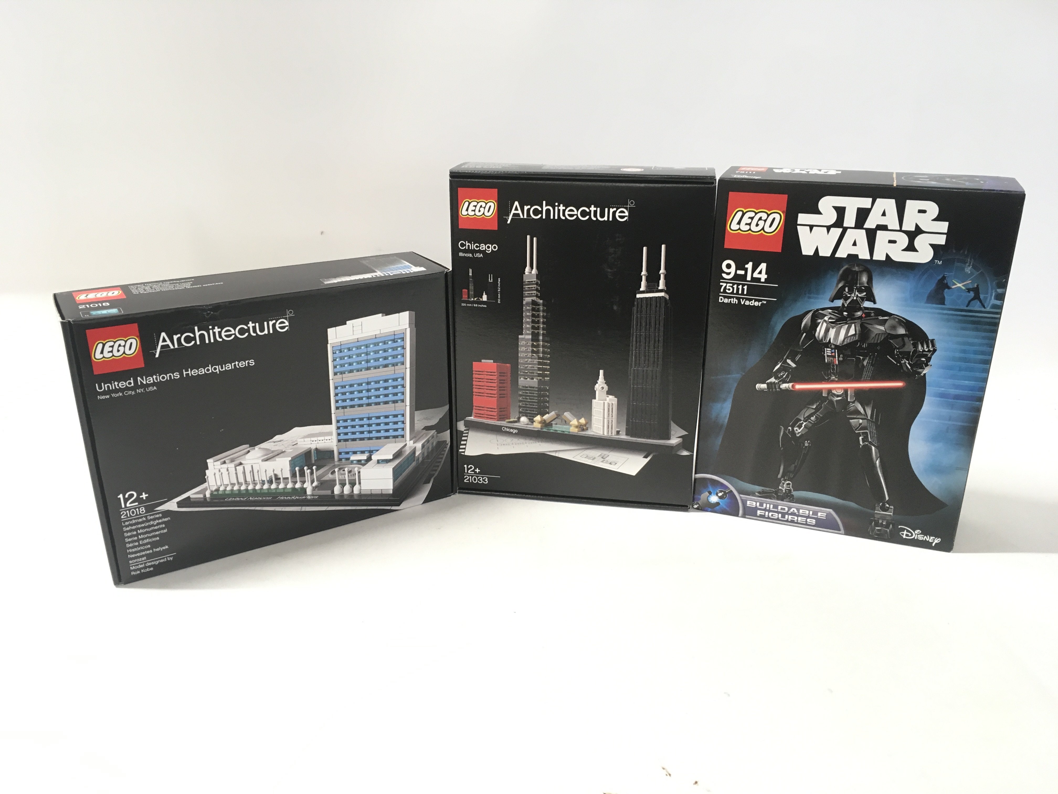 3x sealed boxed Lego sets including Architecture #21018 United Nations Headquarters # 21033 Chicago. Also Star Wars # 75111 Darth Vader. No reserve