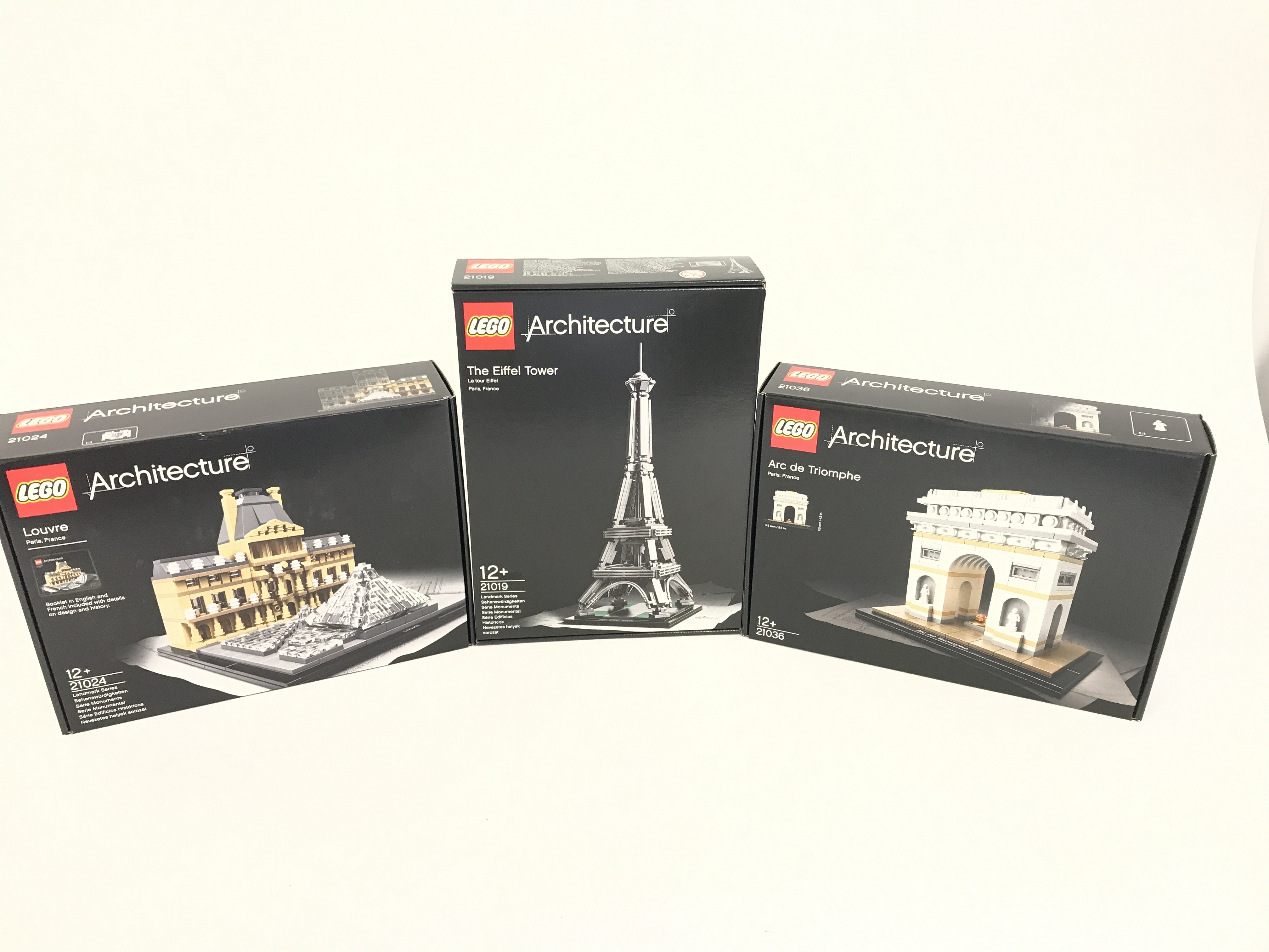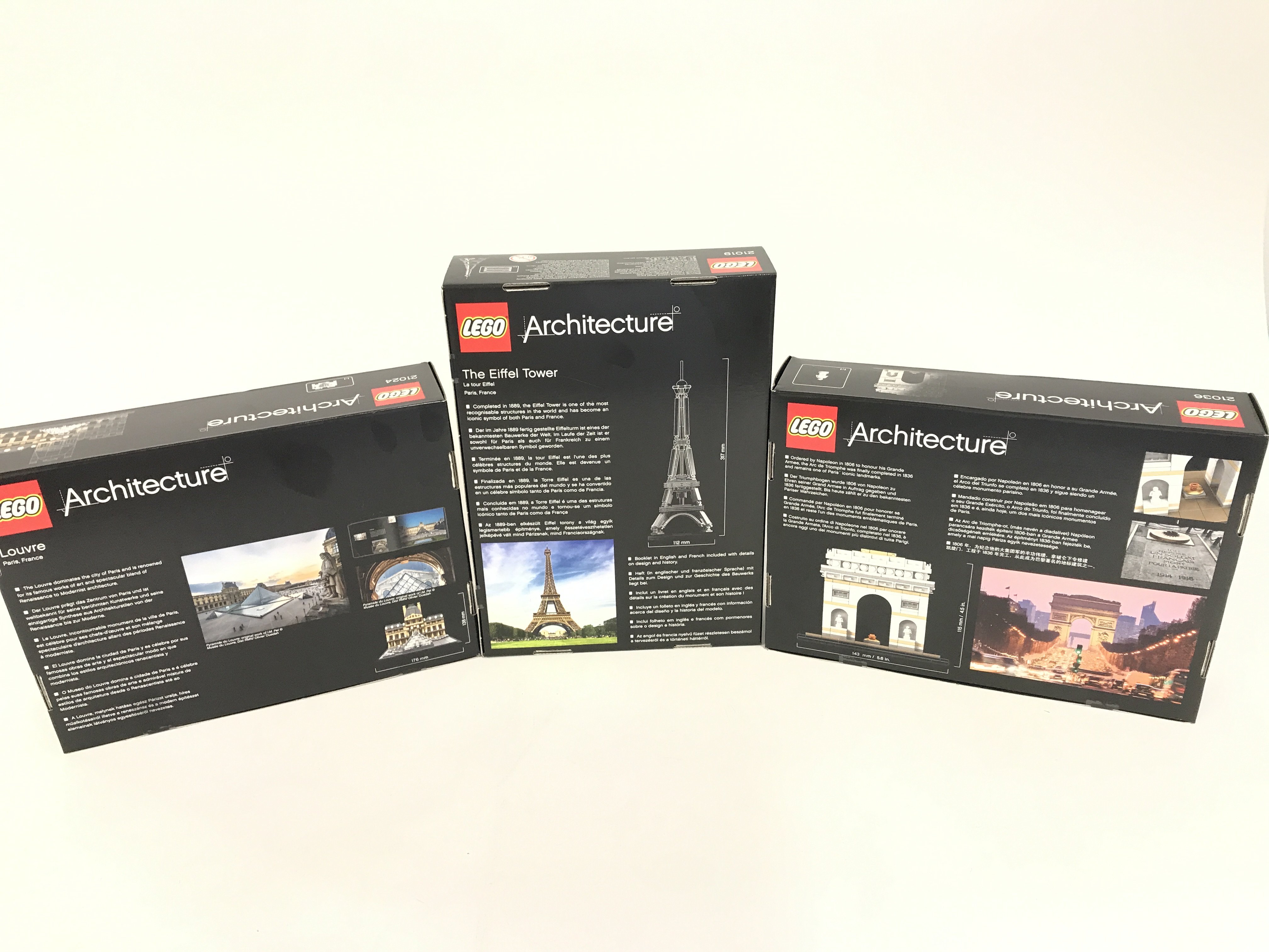 3 boxed and sealed Lego sets. To include Arc De Triomphe 21036, Eiffel Tower 21019, Louvre 21024. No reserve.