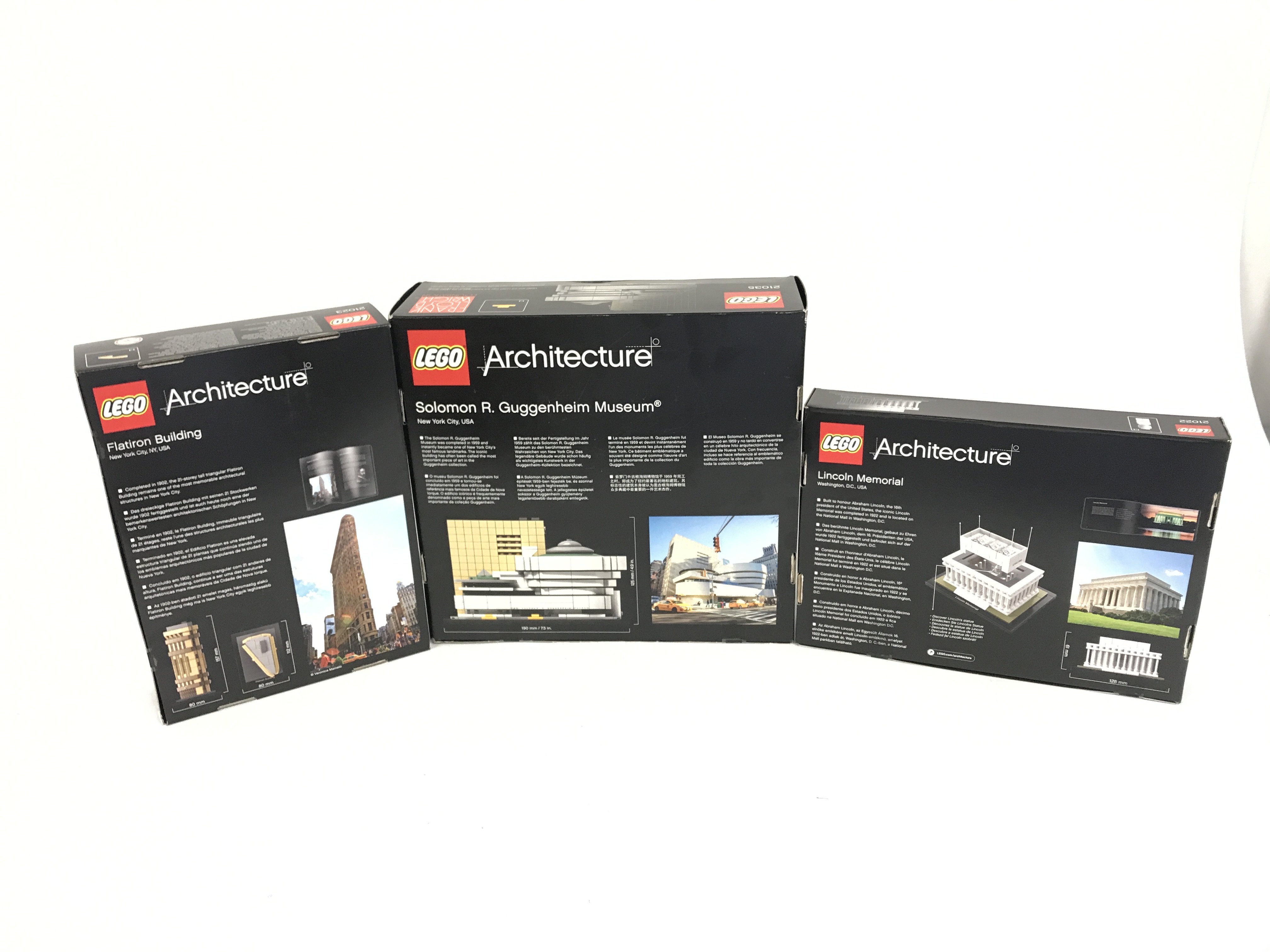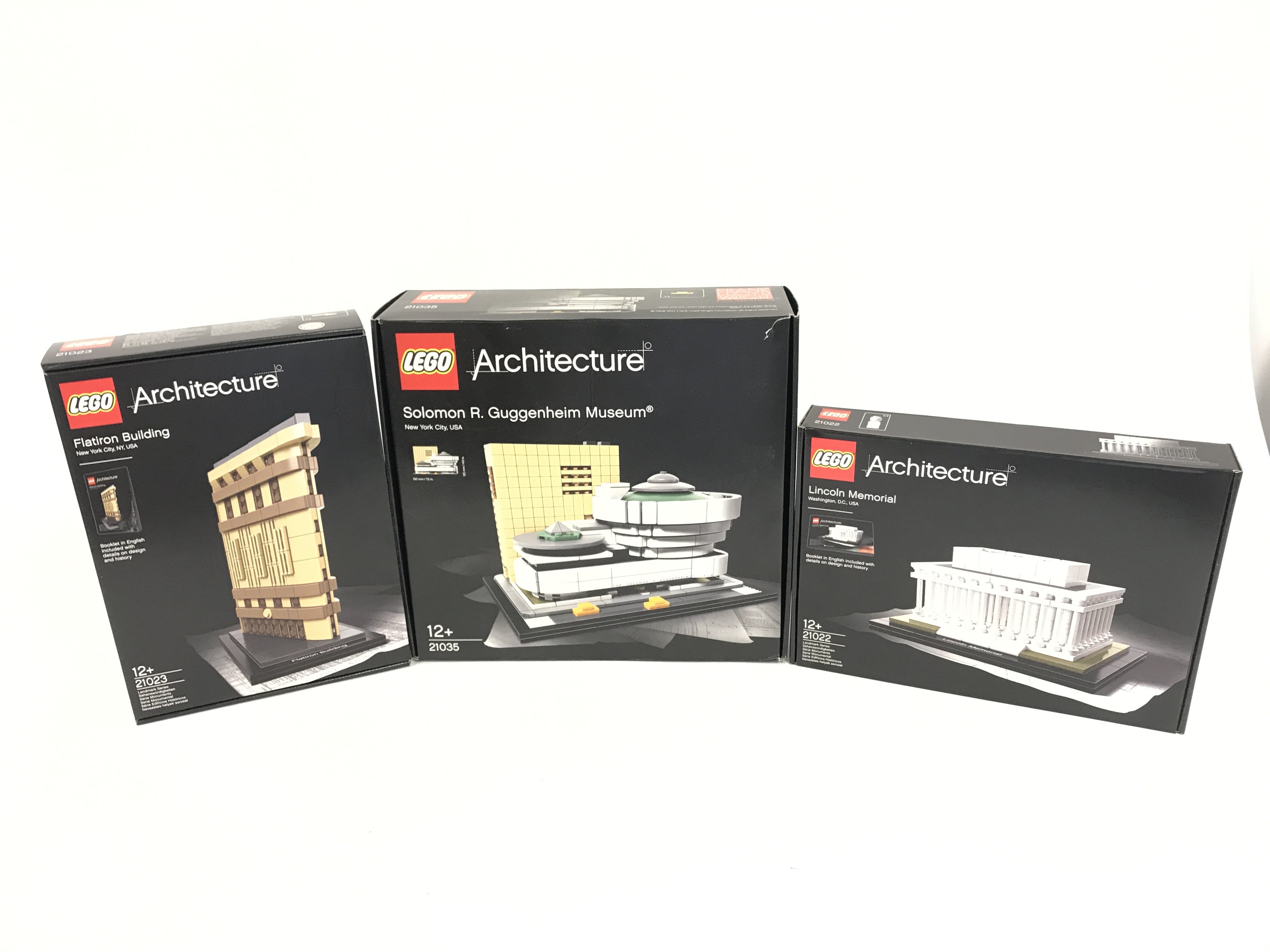 3 boxed and sealed Lego sets, to include, Lincoln Memorial 21022, Solomon R.Guggenheim Museum 21035, Flatiron Building 21023. No reserve.