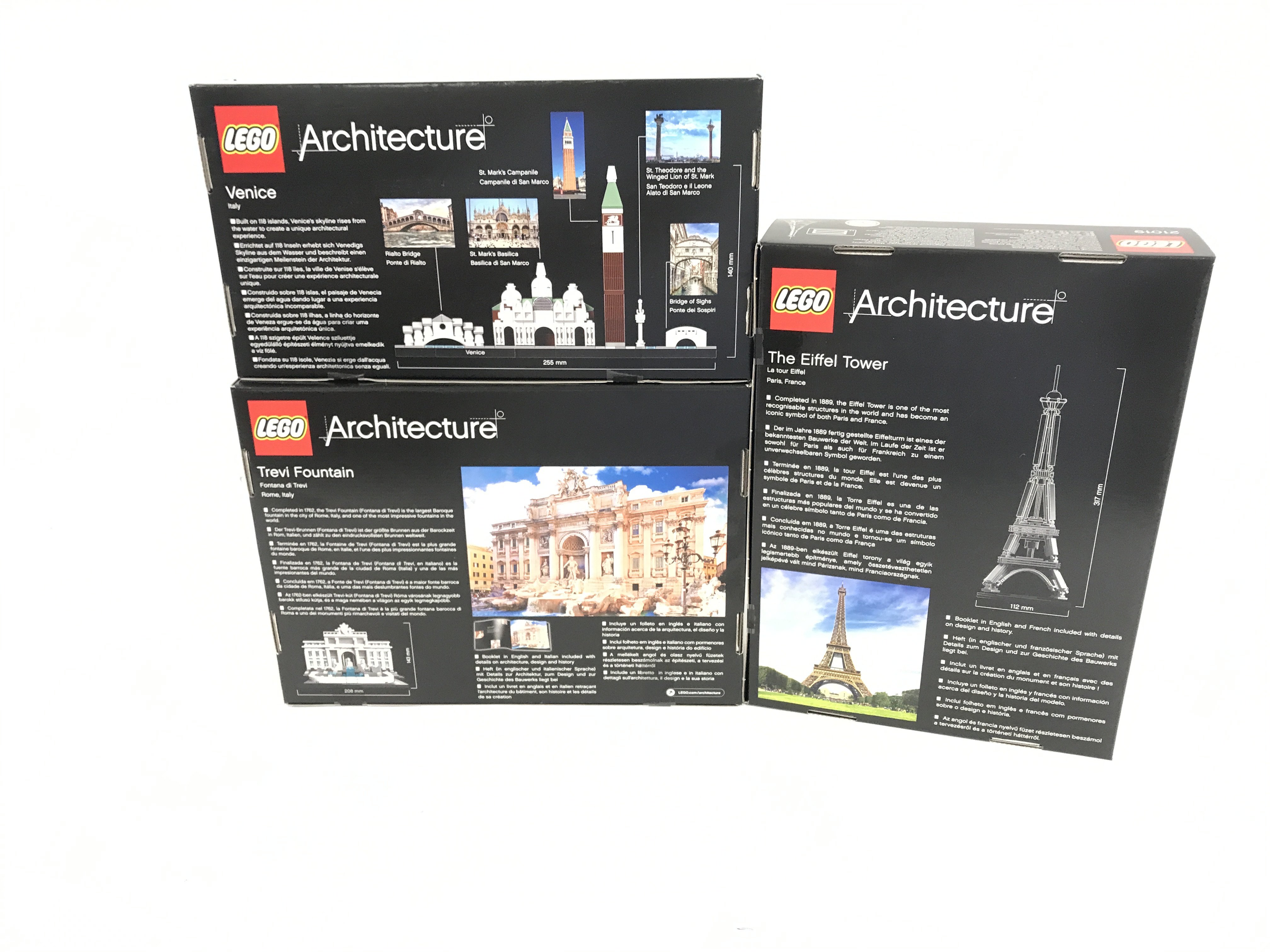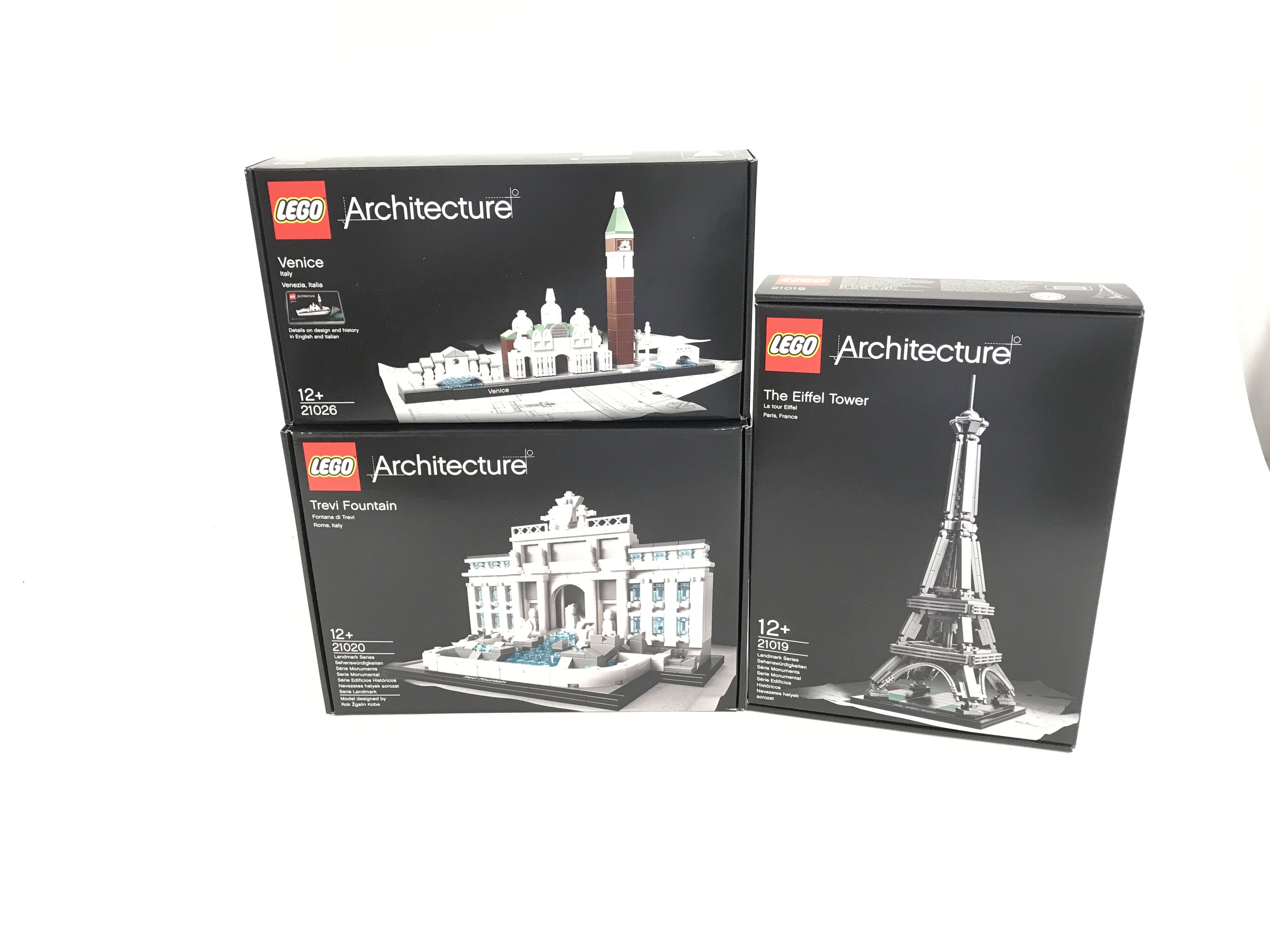 3 boxed and sealed Lego sets, to include, Eiffel Tower 21019, Venice 21026 , Trevi Fountain 21020. No reserve.