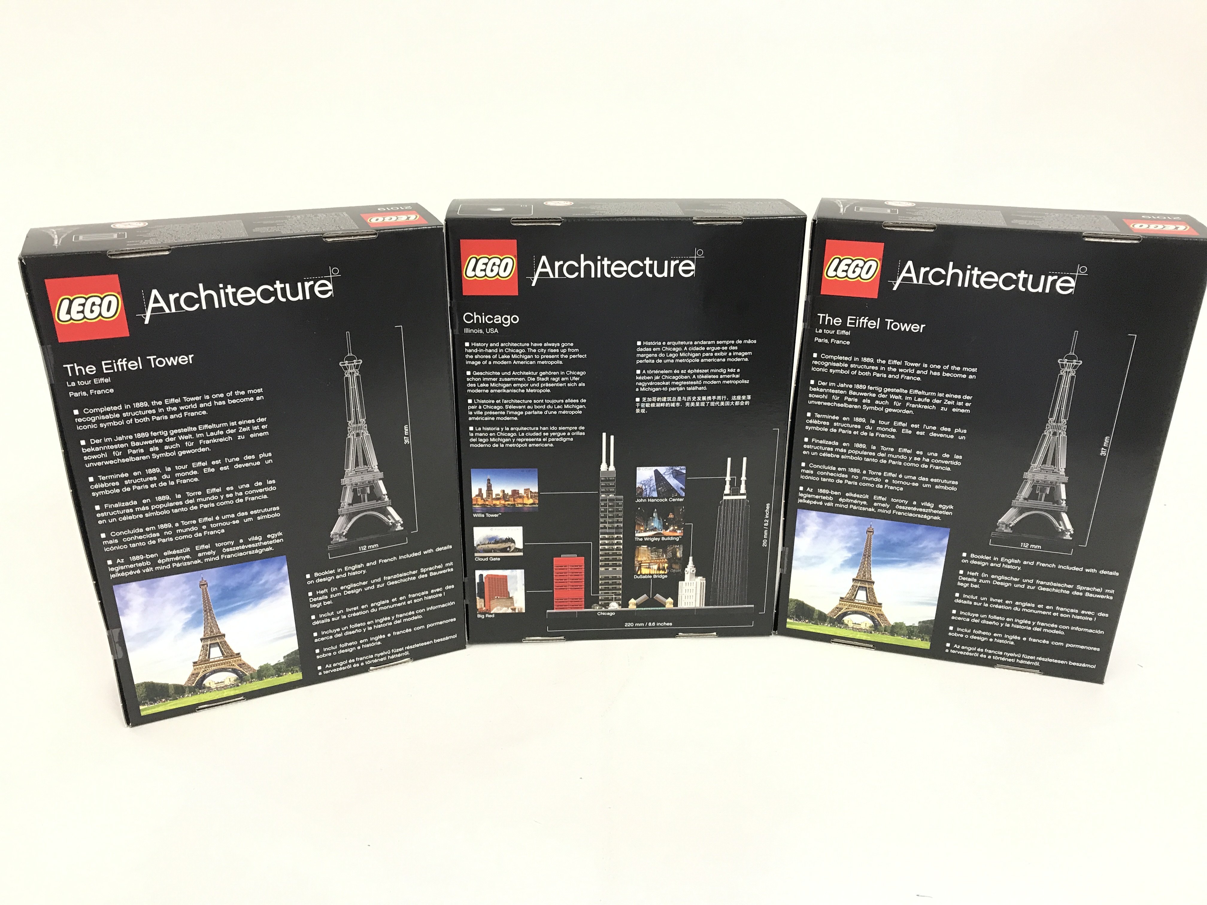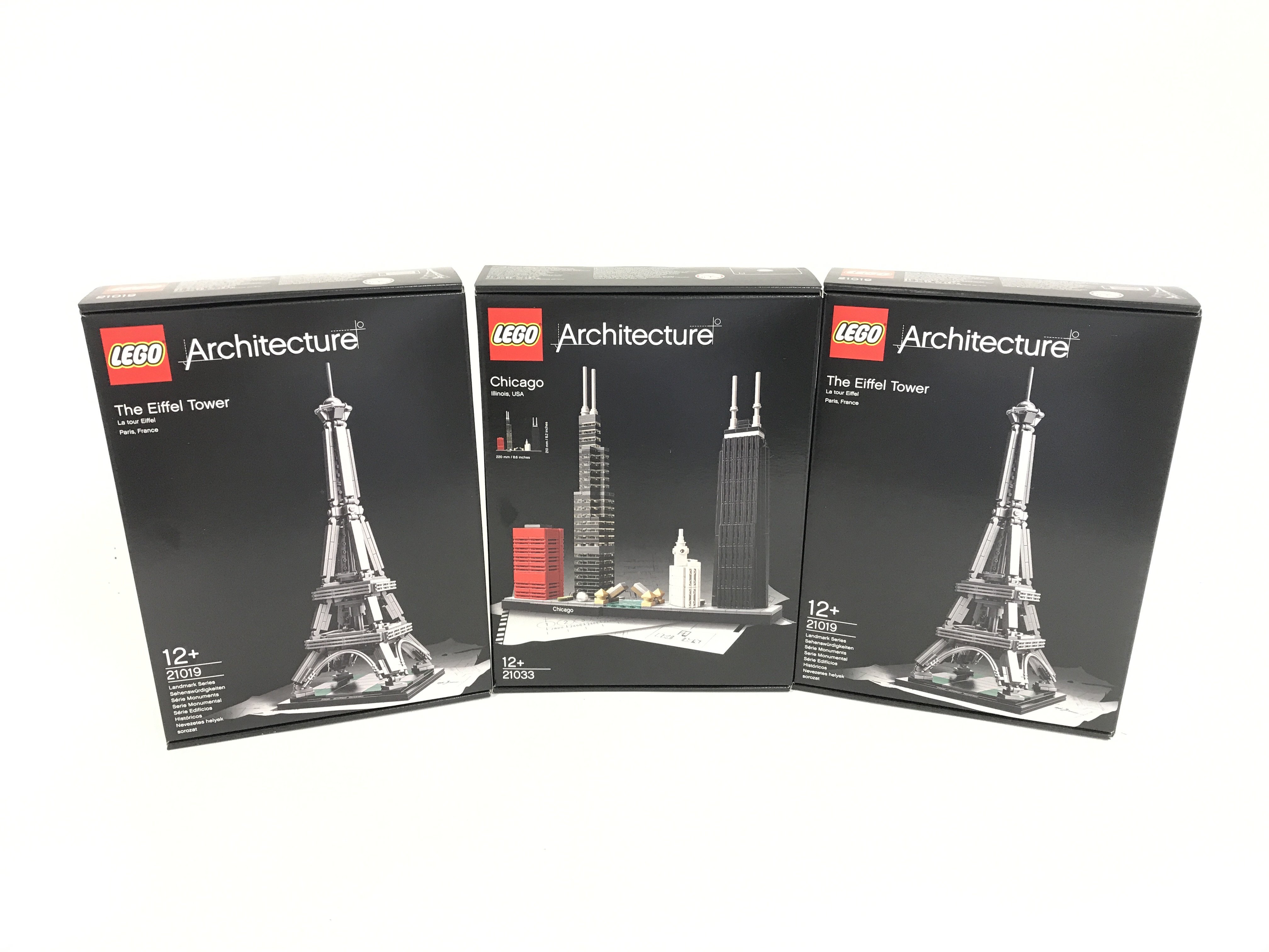 3 boxed and sealed Lego sets, to include, Chicago 21033 and 2 Eiffel Tower 21019 sets. No reserve.