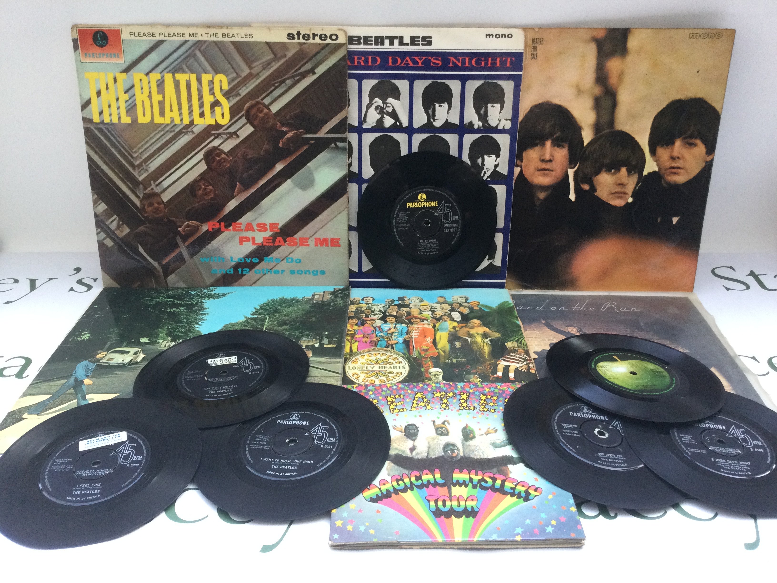 A collection of Beatles and related LPs, EPs and 7" singles including early UK pressings comprising a stereo 'Please Please Me' (not black and gold labels), 'Sgt Pepper', 'Abbey Road' and others.
