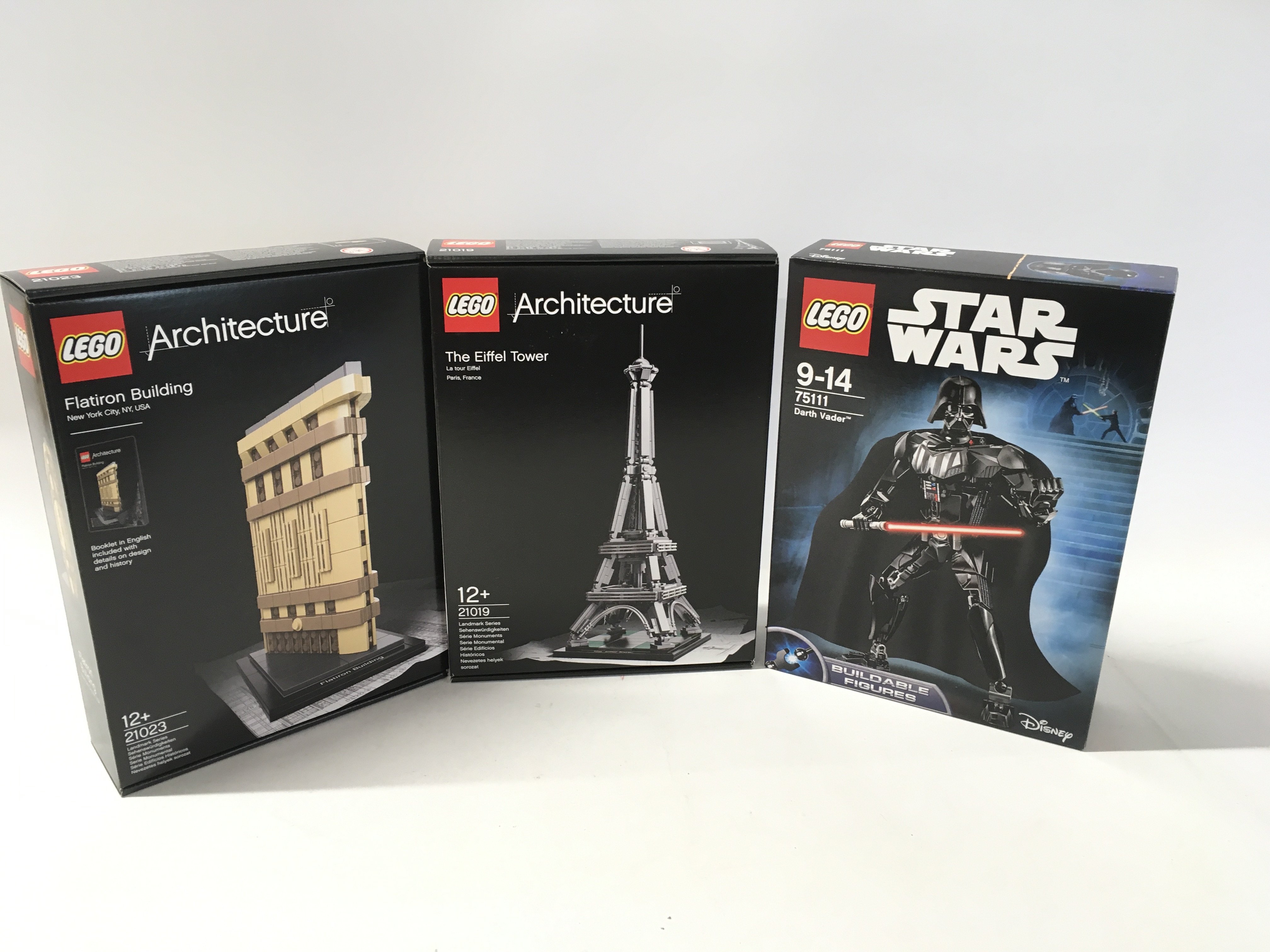 3x sealed boxed Lego sets including 2x ARCHITECTURE. # 21023 Flatiron Building …# 21019 The Eiffel Tower… also Star Wars # 75111 Darth Vader. No reserve