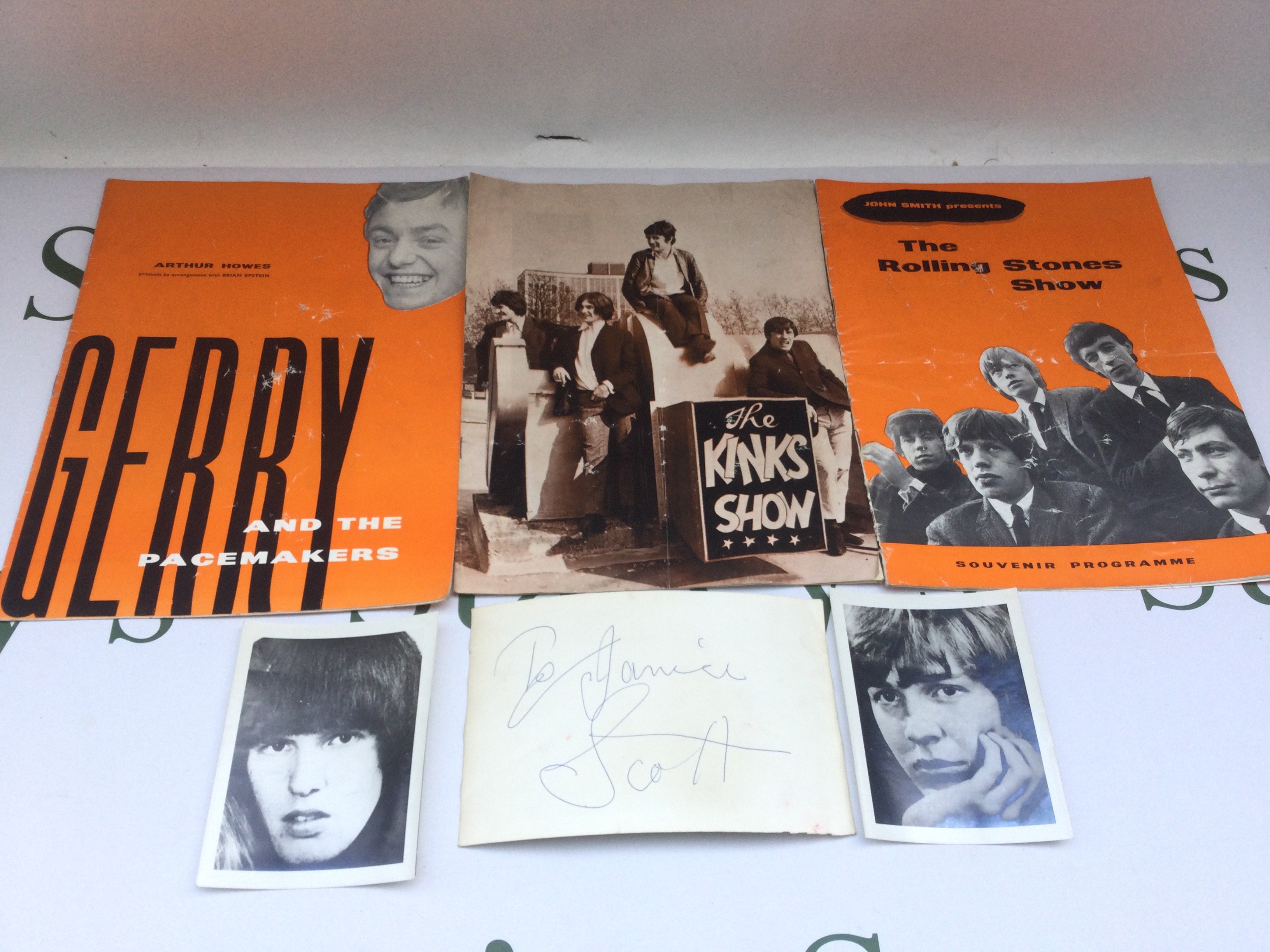 A Scott Walker signed photograph plus two other Walker Brothers photos plus three 1960s programs for The Rolling Stones, The Kinks and Gerry & The Pacemakers.
