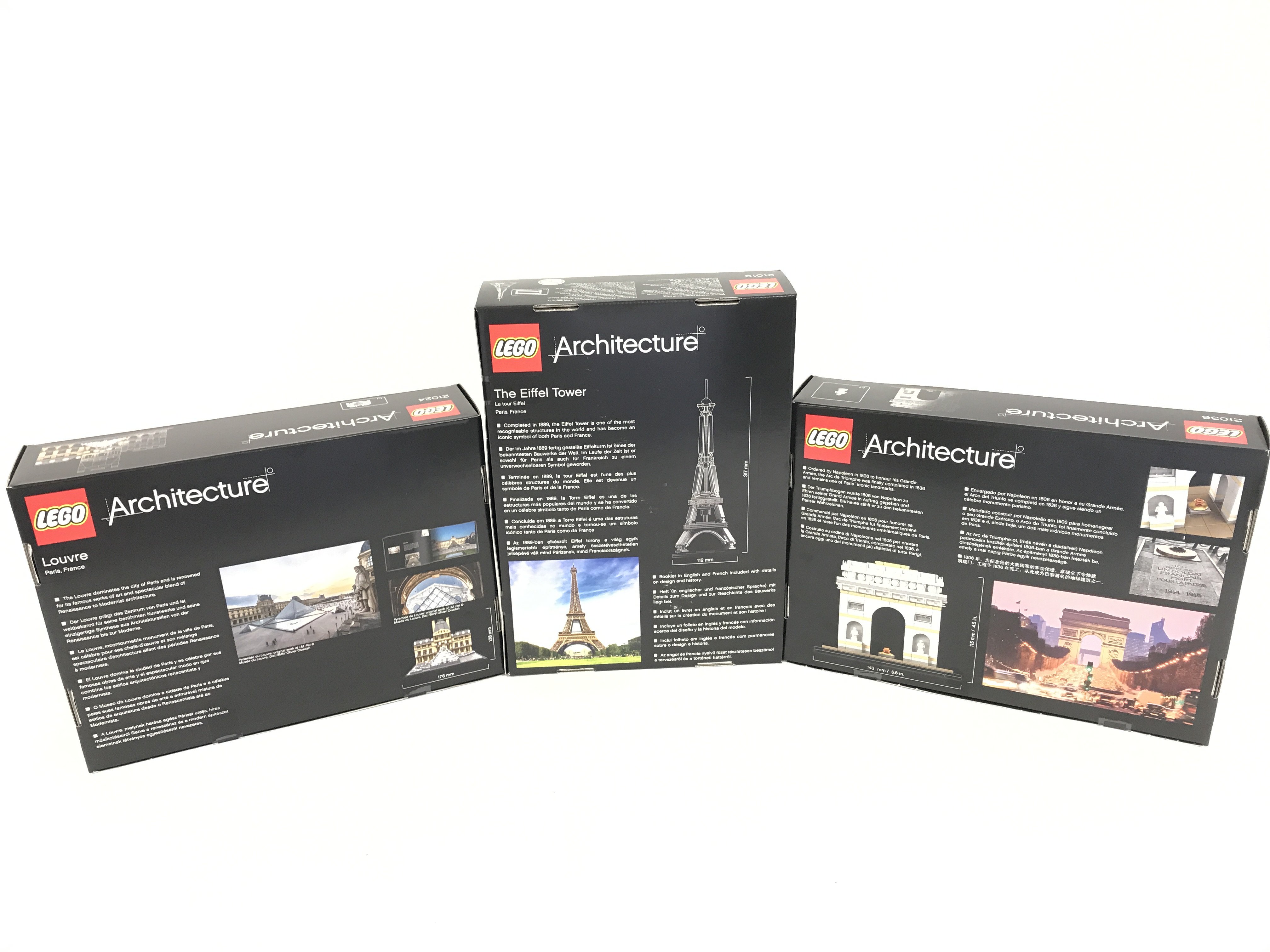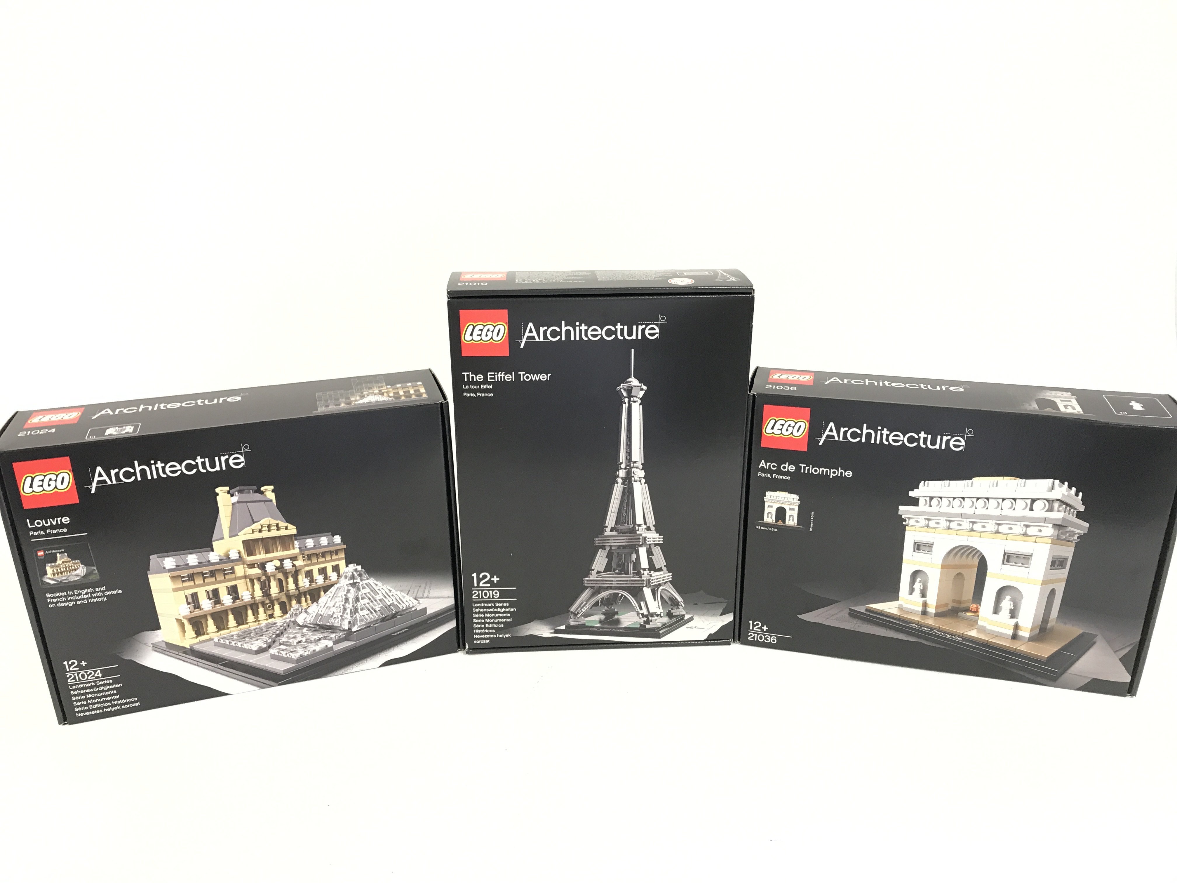 3 boxed and sealed Lego sets. To include Arc De Triomphe 21036. Eiffel Tower 21019. Louvre 21024. No reserve.