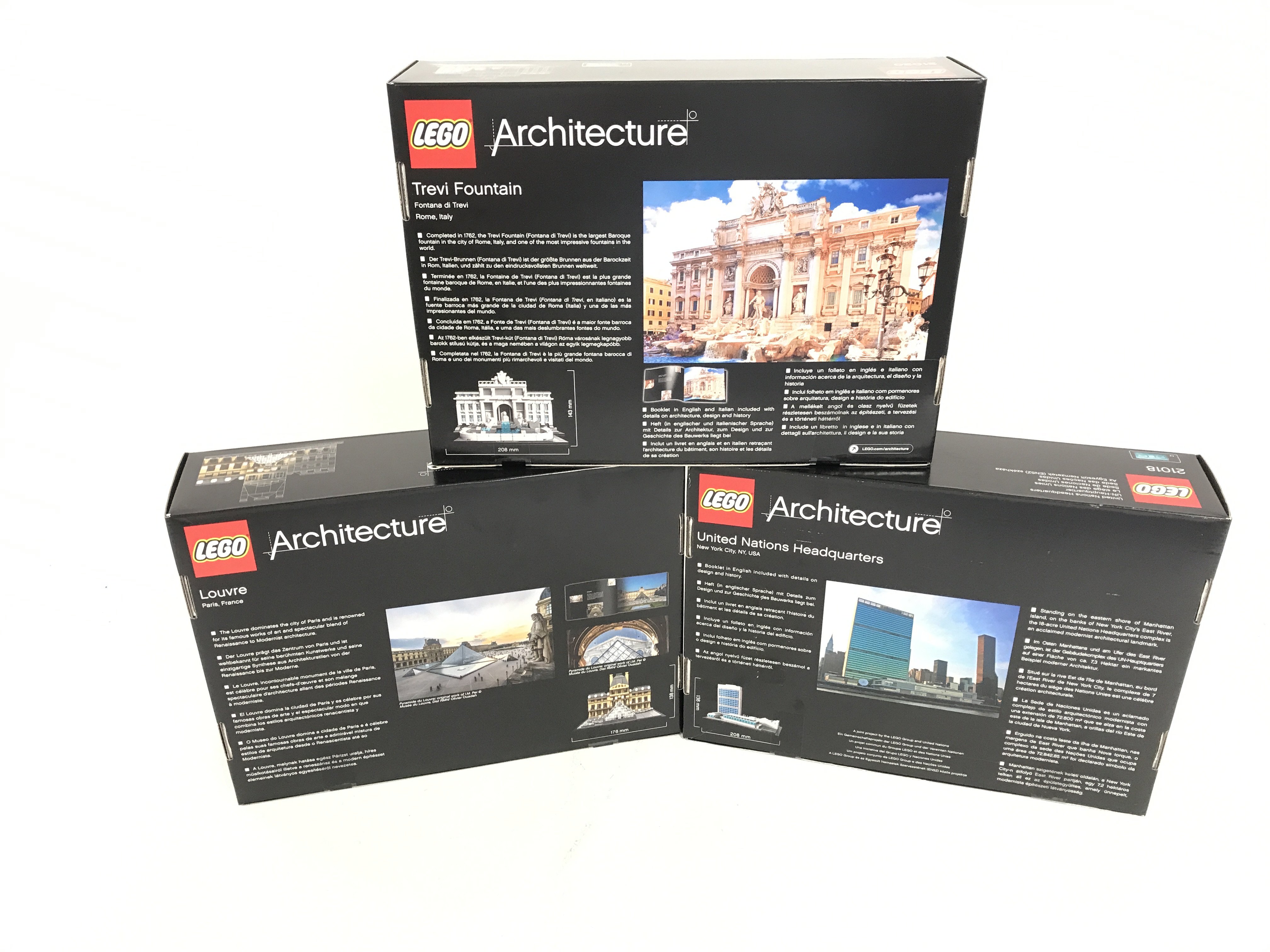 3 boxed and sealed Lego sets. To include United Nations Headquaters 21018. Louvre 21024. Trevi Fountain 21024. No reserve.