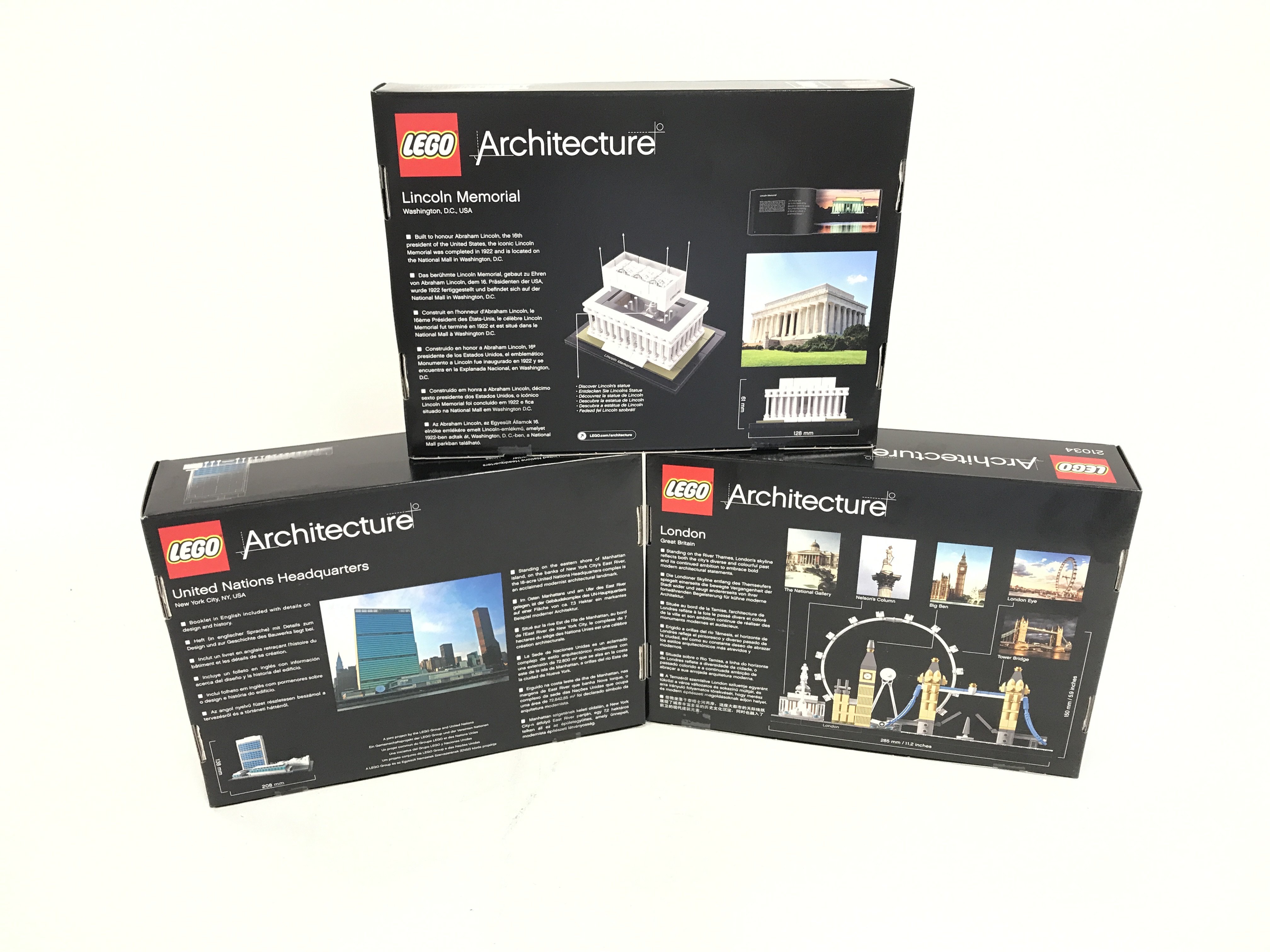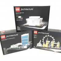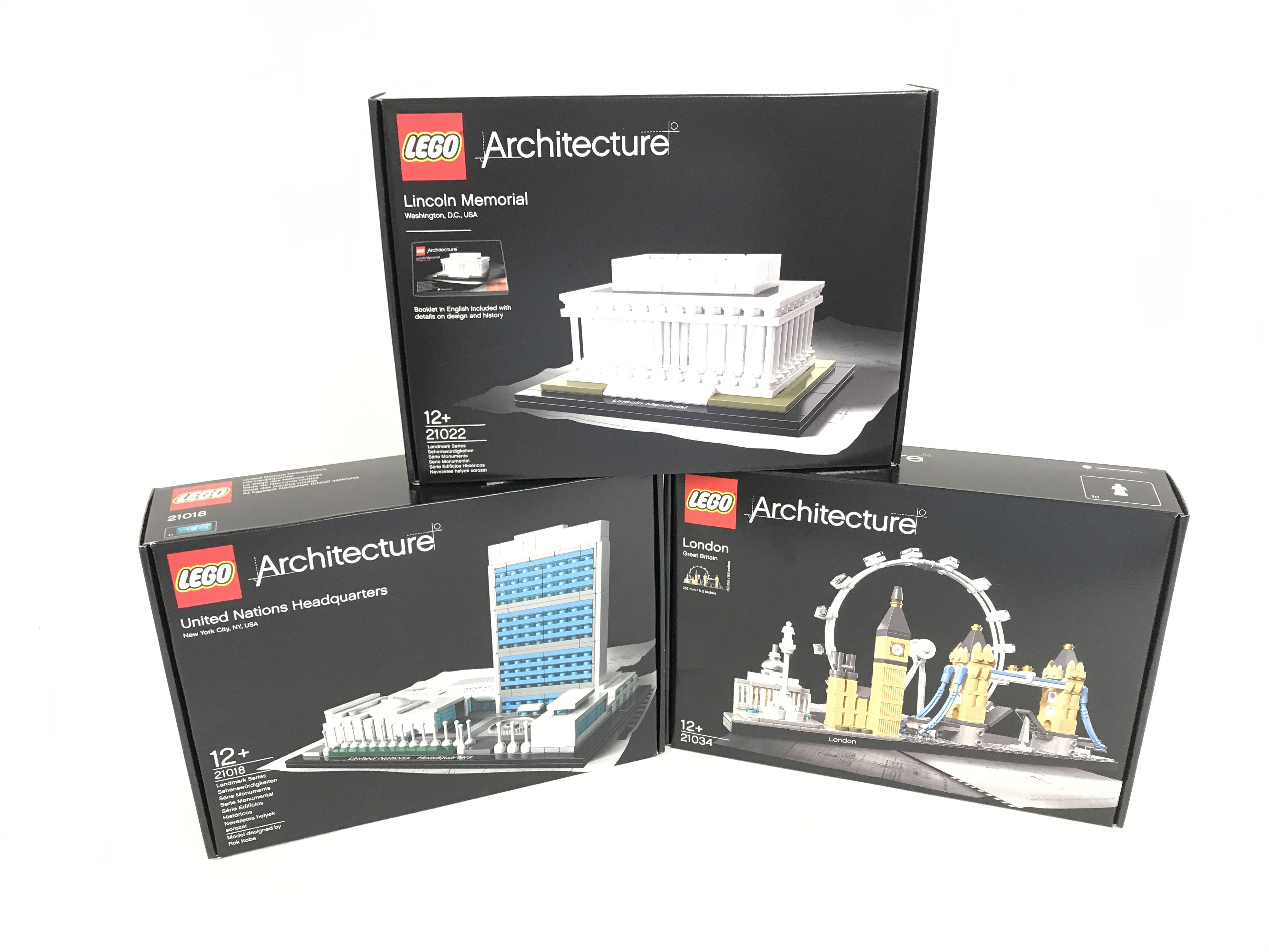 3 boxed and sealed Lego sets. To include London 21034. United Nations Headquaters 21018. Lincoln Memorial 21022. No reserve.