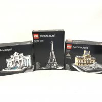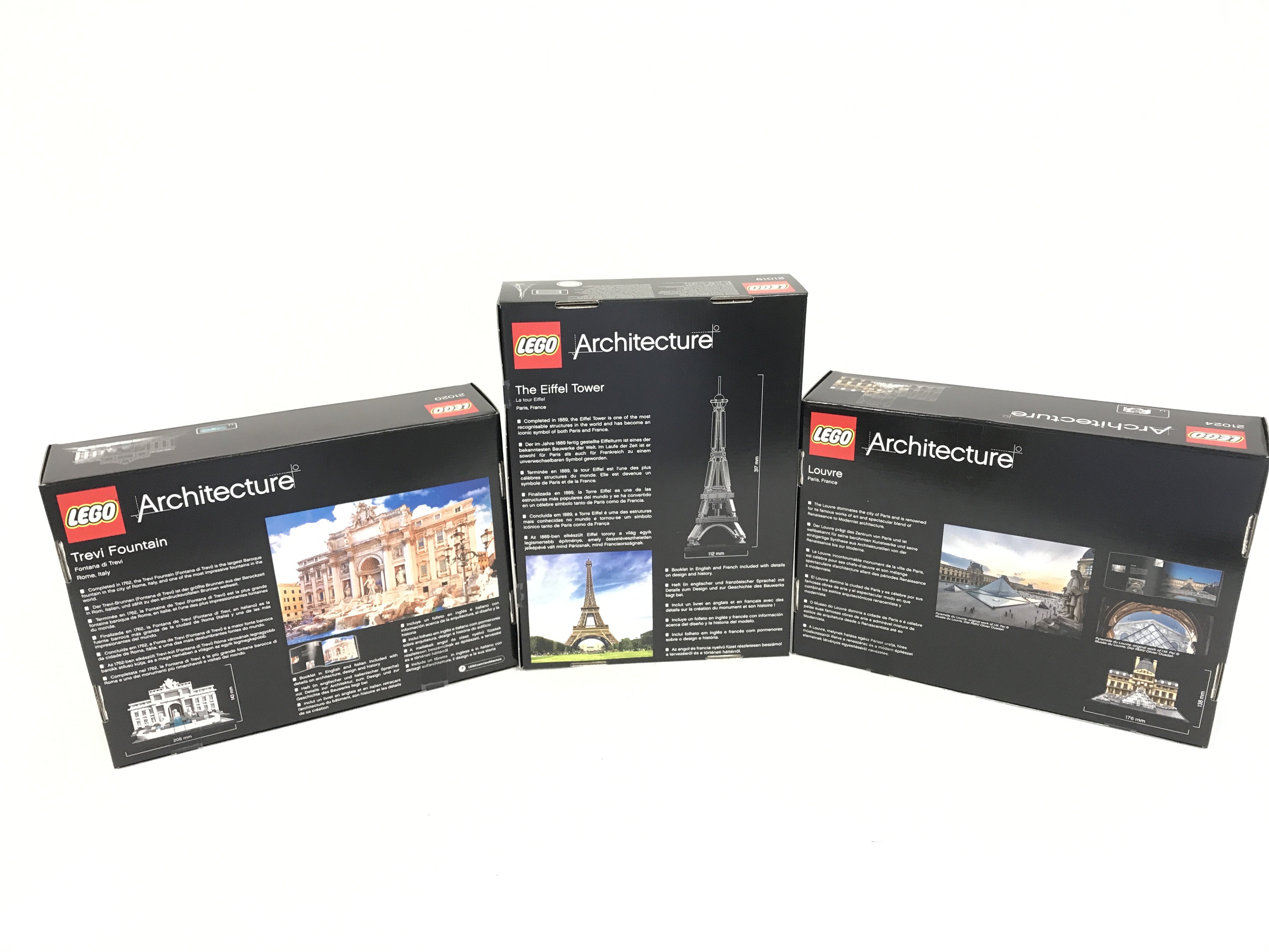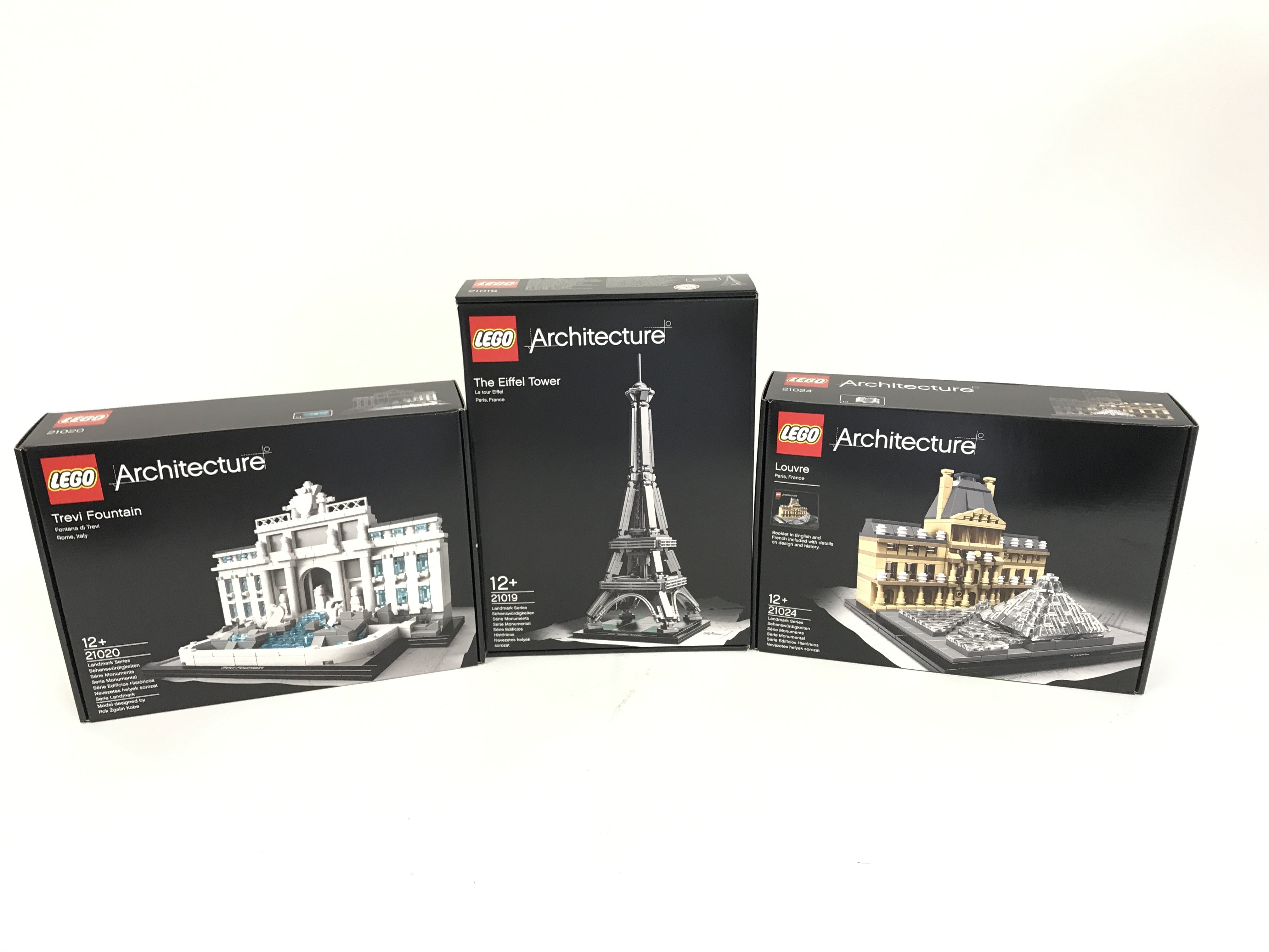 3 boxed and sealed Lego sets. To include 21020 Trevi Fountain . 21019 Eiffel Tower. 21024 Louvre. No reserve.