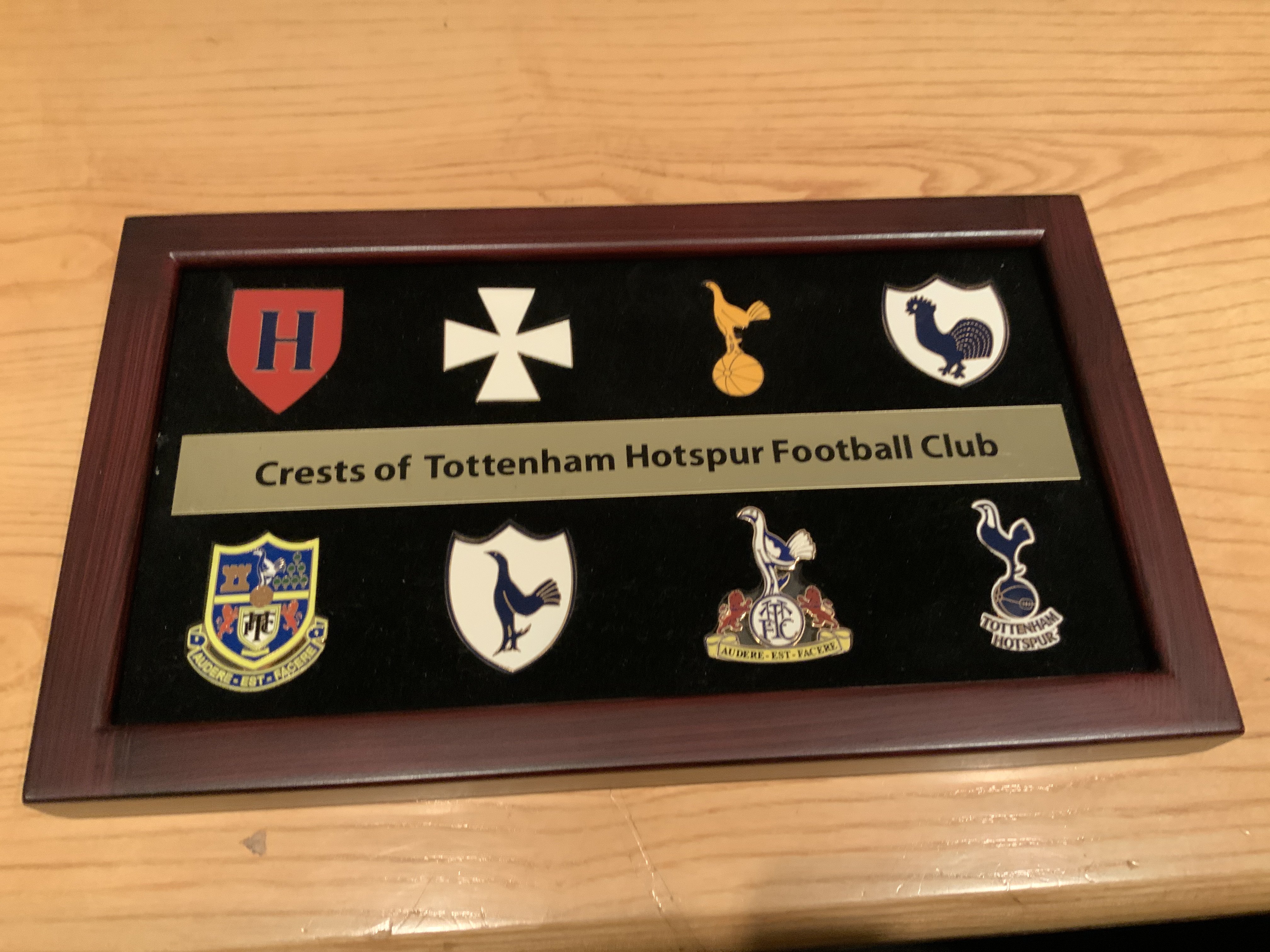 Tottenham 1961 Double Team Signed Framed Photo: 18 x 14 inch framed photo of the 1961 team hand signed by Marchi Baker Allen Jedwin Norman Dyson and Jones. C/W framed 8 historic crests of Spurs. (2)