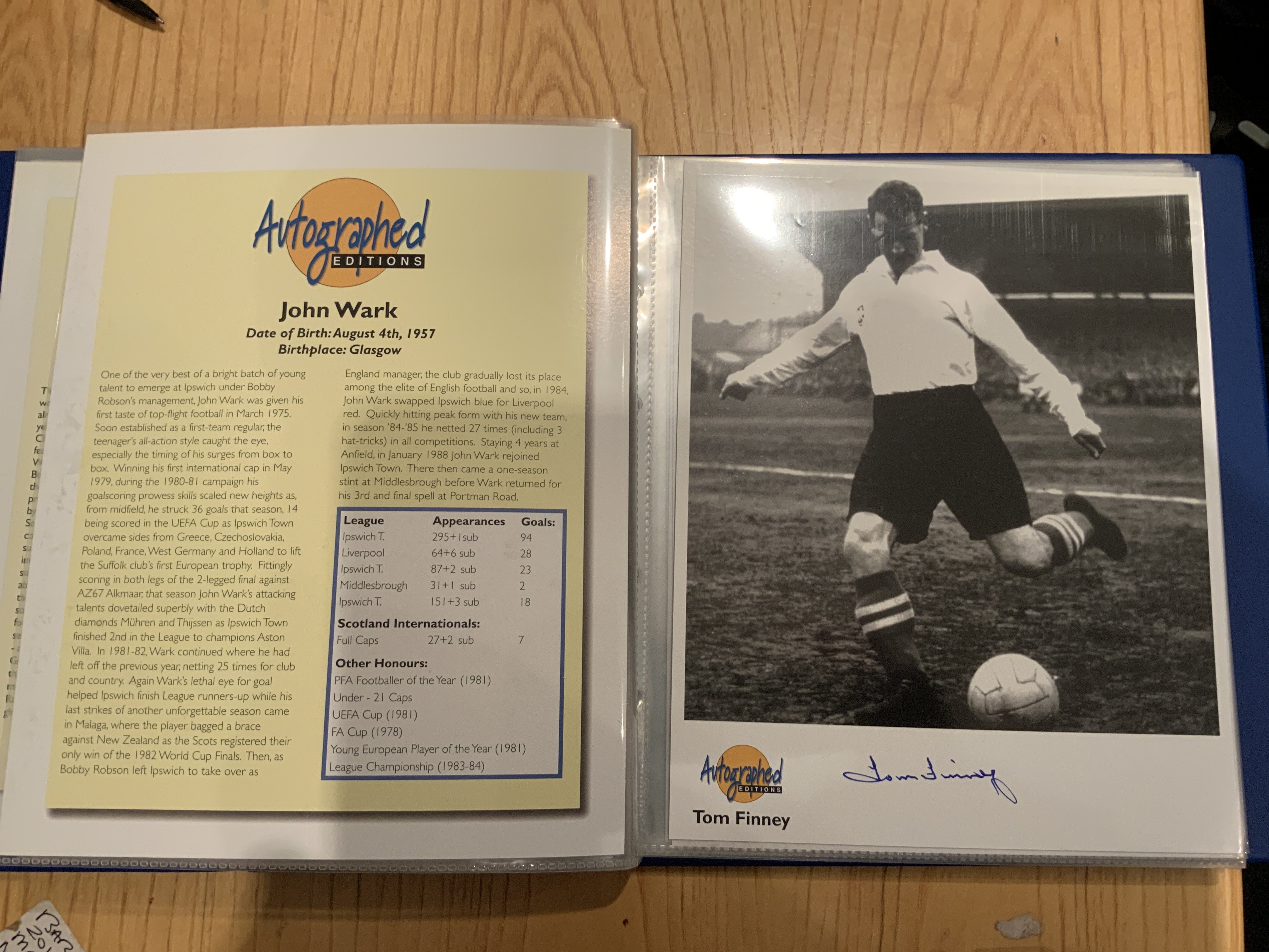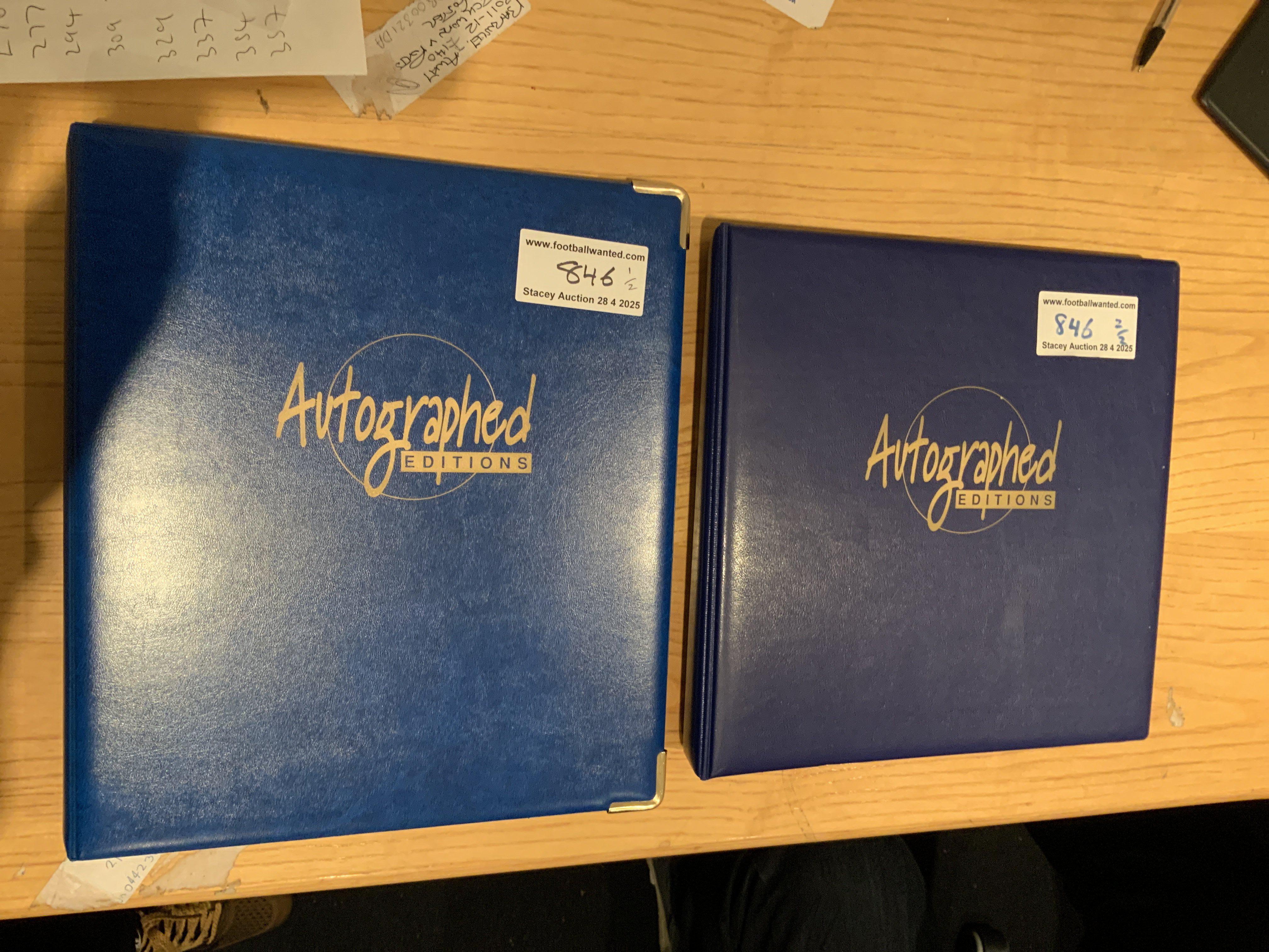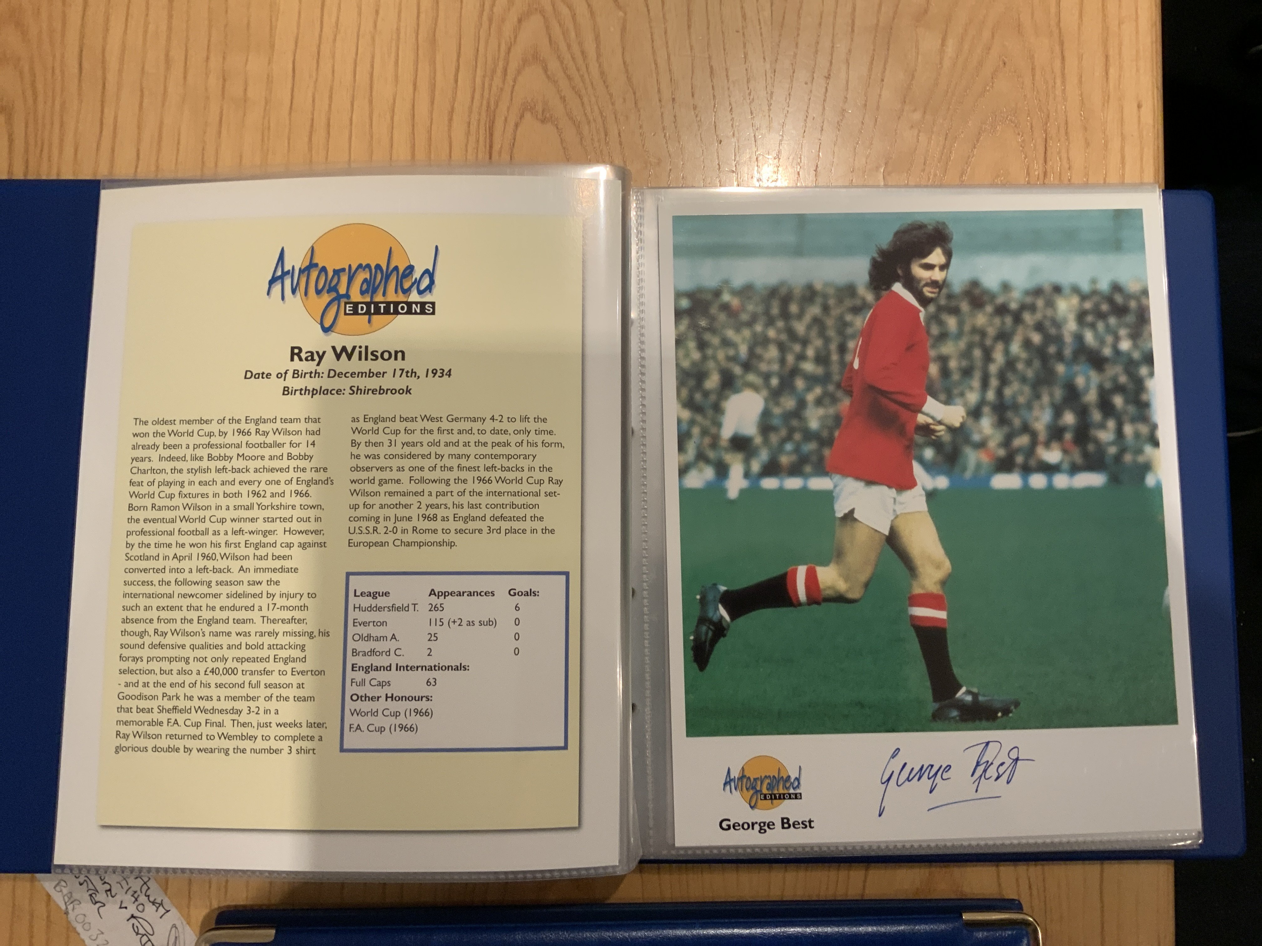 Autographed Editions Signed Football Photo Collection: Genuinely nice card photos with players details to rear in two blue official folders. Hand signed by George Best Gordon Banks, Ray Wilson, Nobby Stiles, Norman Hunter, Rodney Marsh, Derek Dougan, George Cohen and Ian St John. (50)