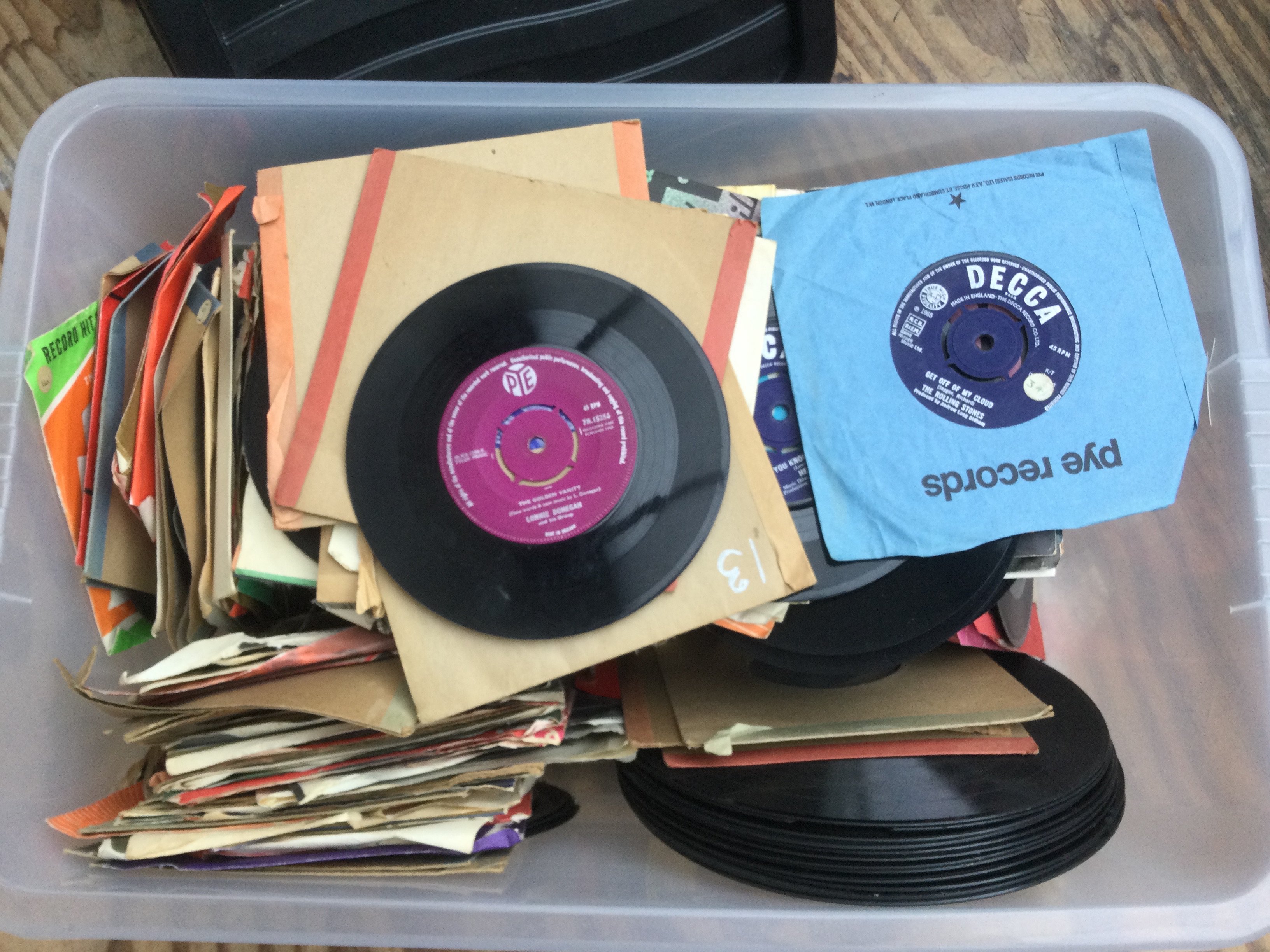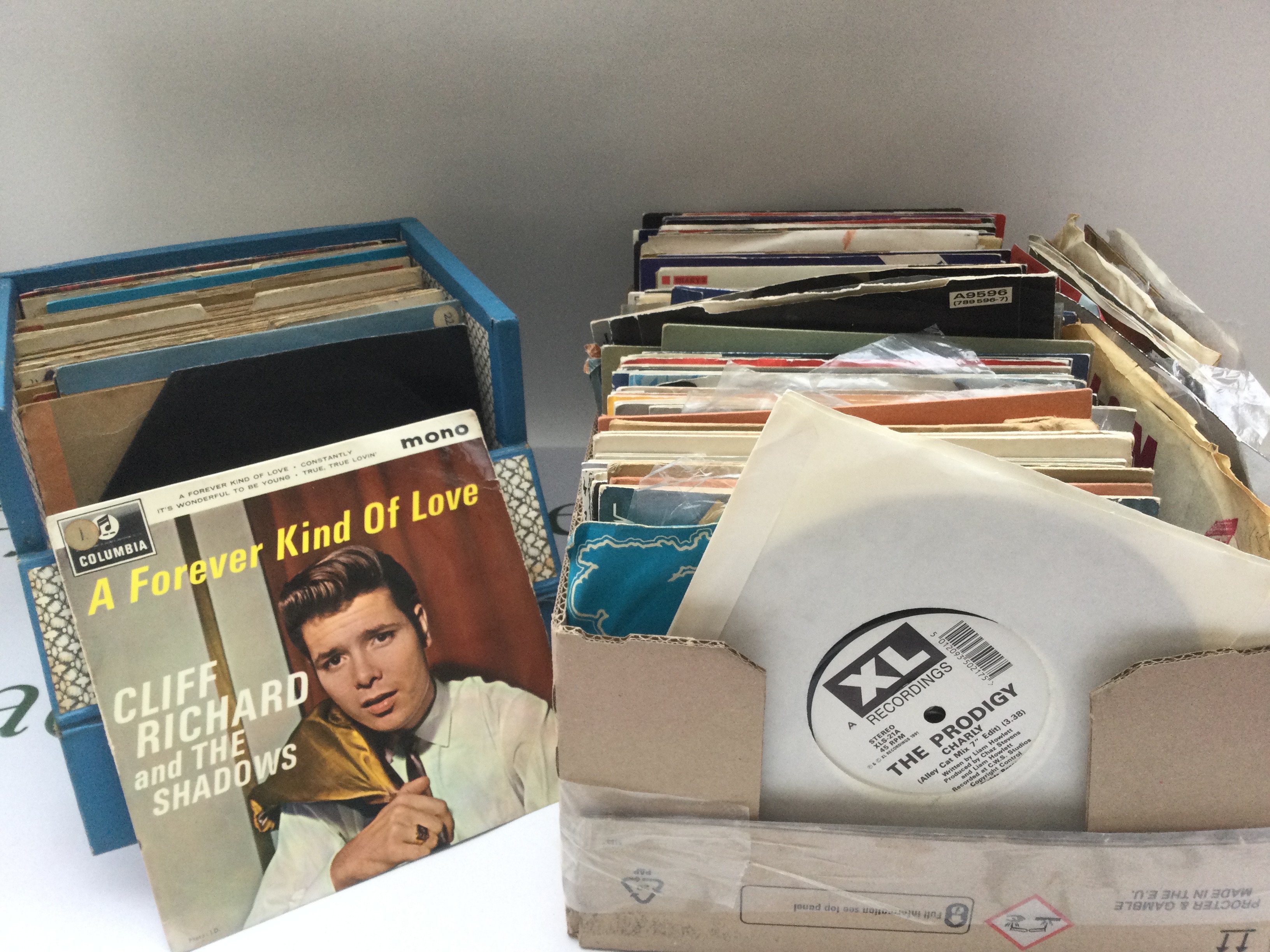 Two boxes and a record case of 7" singles, EPs and 78s by various artists from the 1950s onwards.