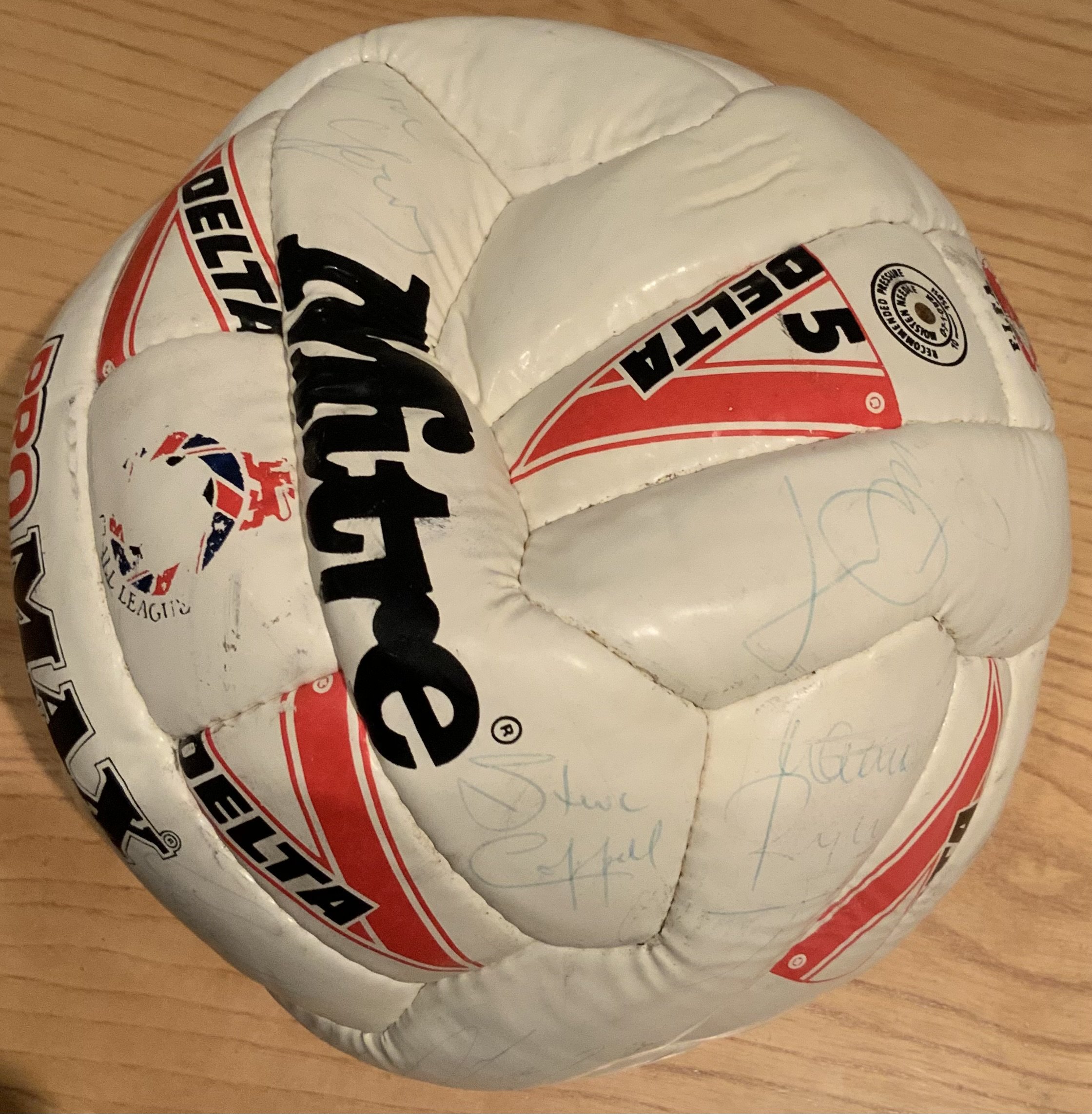 91/92 Luton v Crystal Palace Signed Football: Match ball given to sponsor signed by both teams. Includes autographs of Southgate Campbell Coppell Richards and many more.