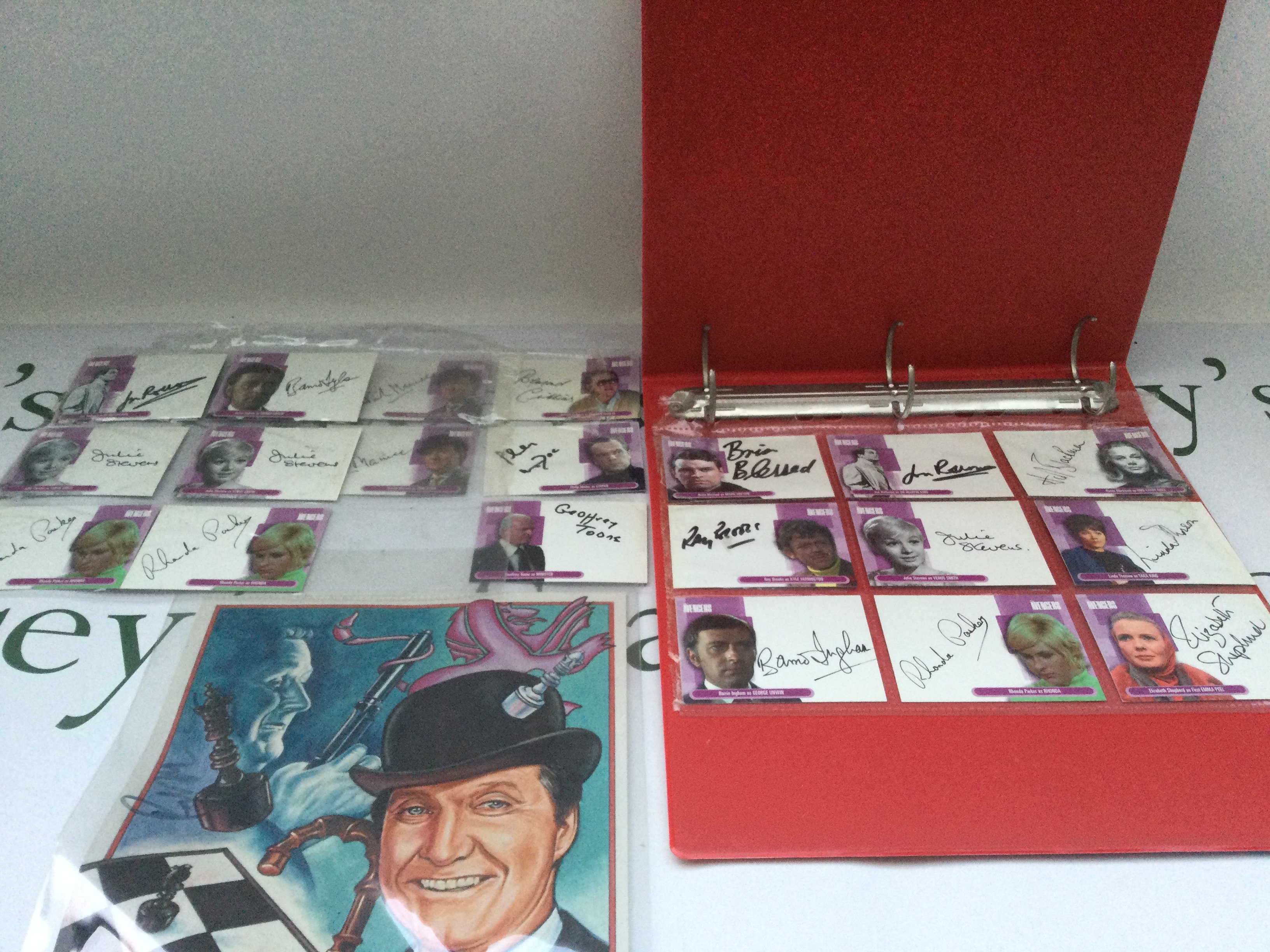 A collection of signed The Avengers trading cards plus a Patrick Macnee signed picture. Other names include Brian Blessed, Honor Blackman, Bernard Cribbins etc.