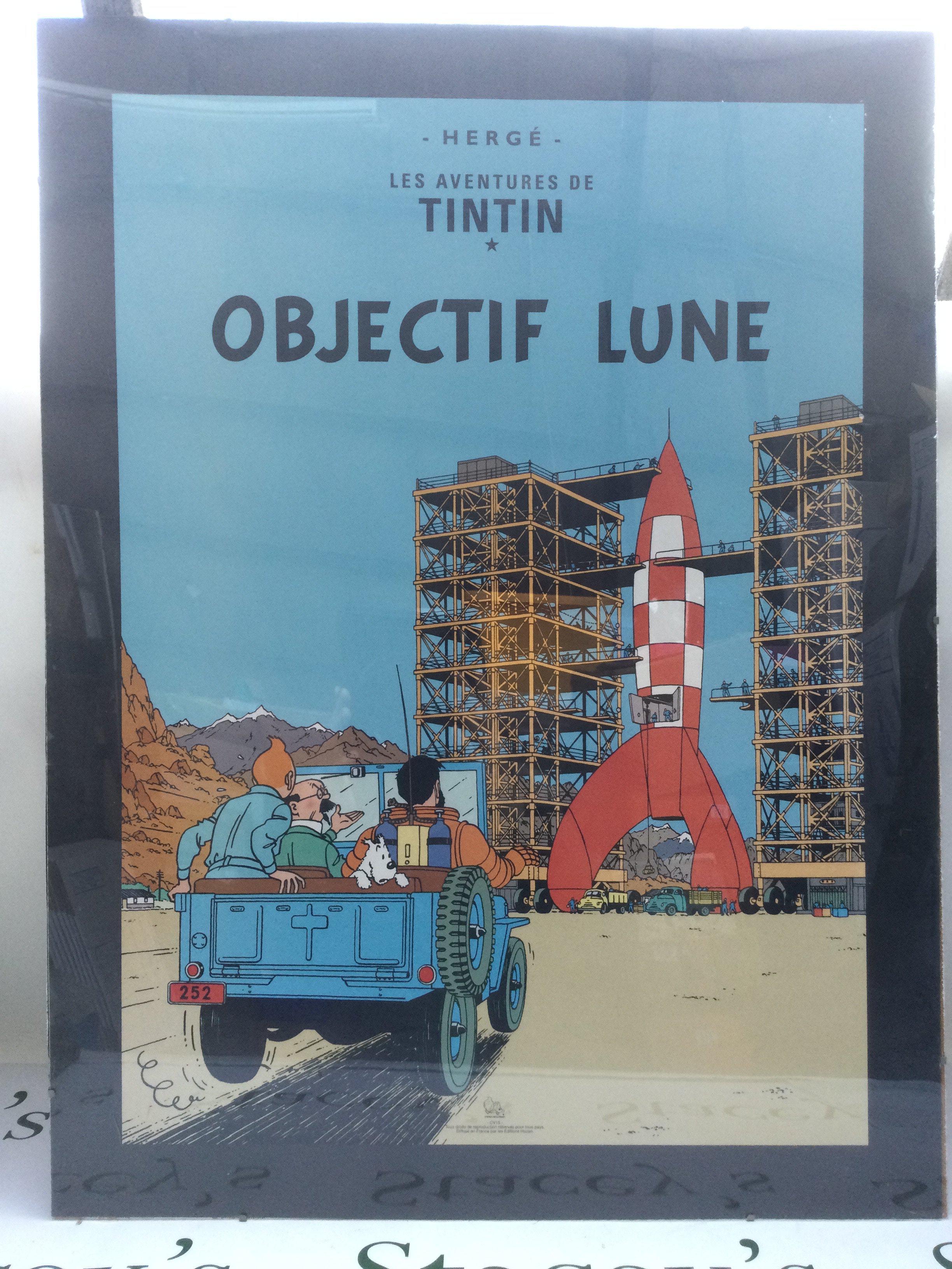 A framed Tintin poster for Destination Moon, approx 60cm x 80cm including frame.