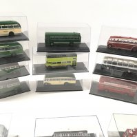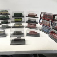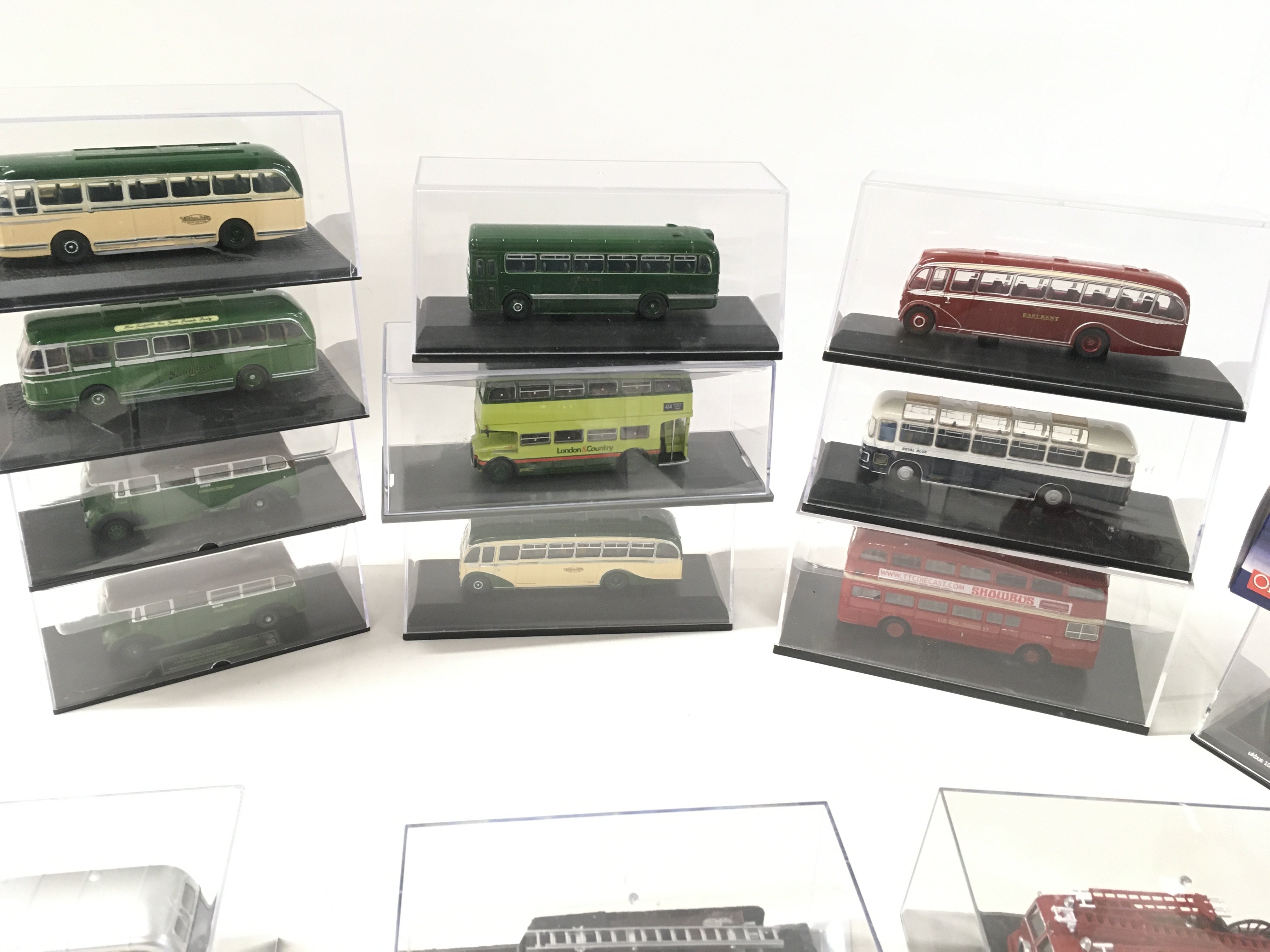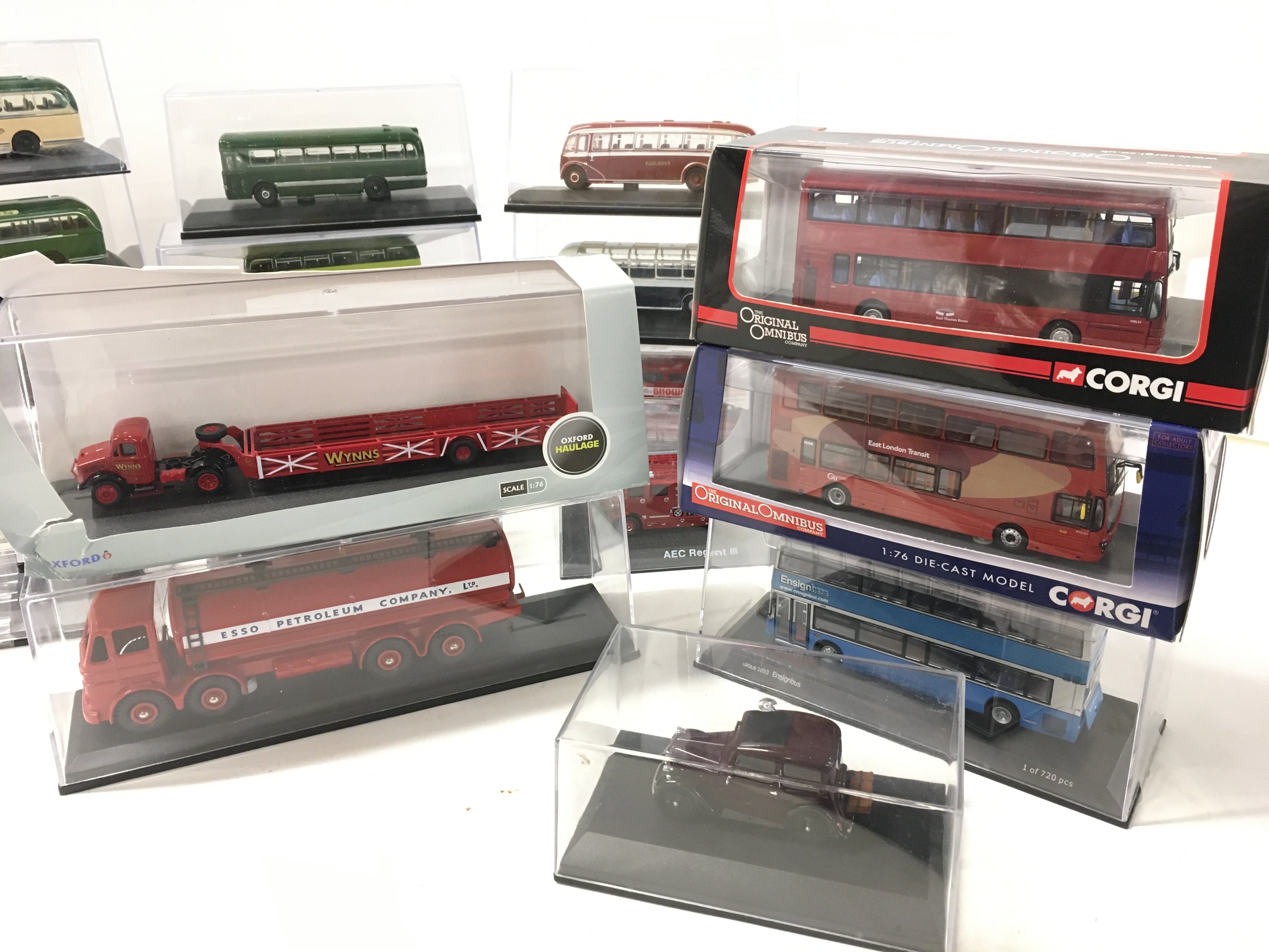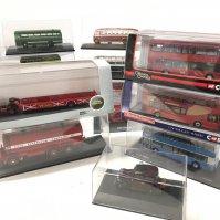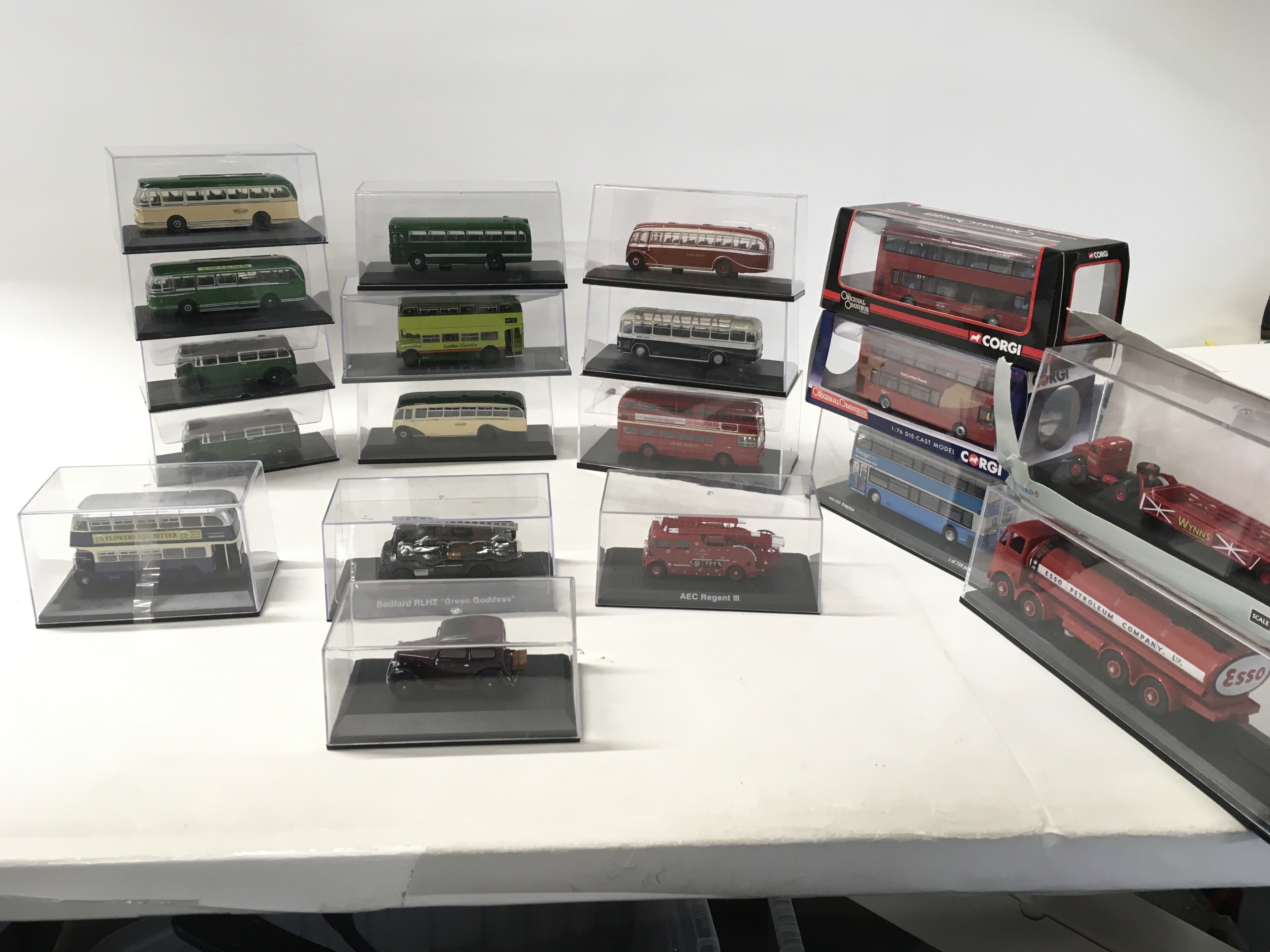 A collection of 19 diecast model vehicles in display boxes featuring buses..fire engines..tanker etc. manufacturers include Corgi..Oxford etc. no reserve