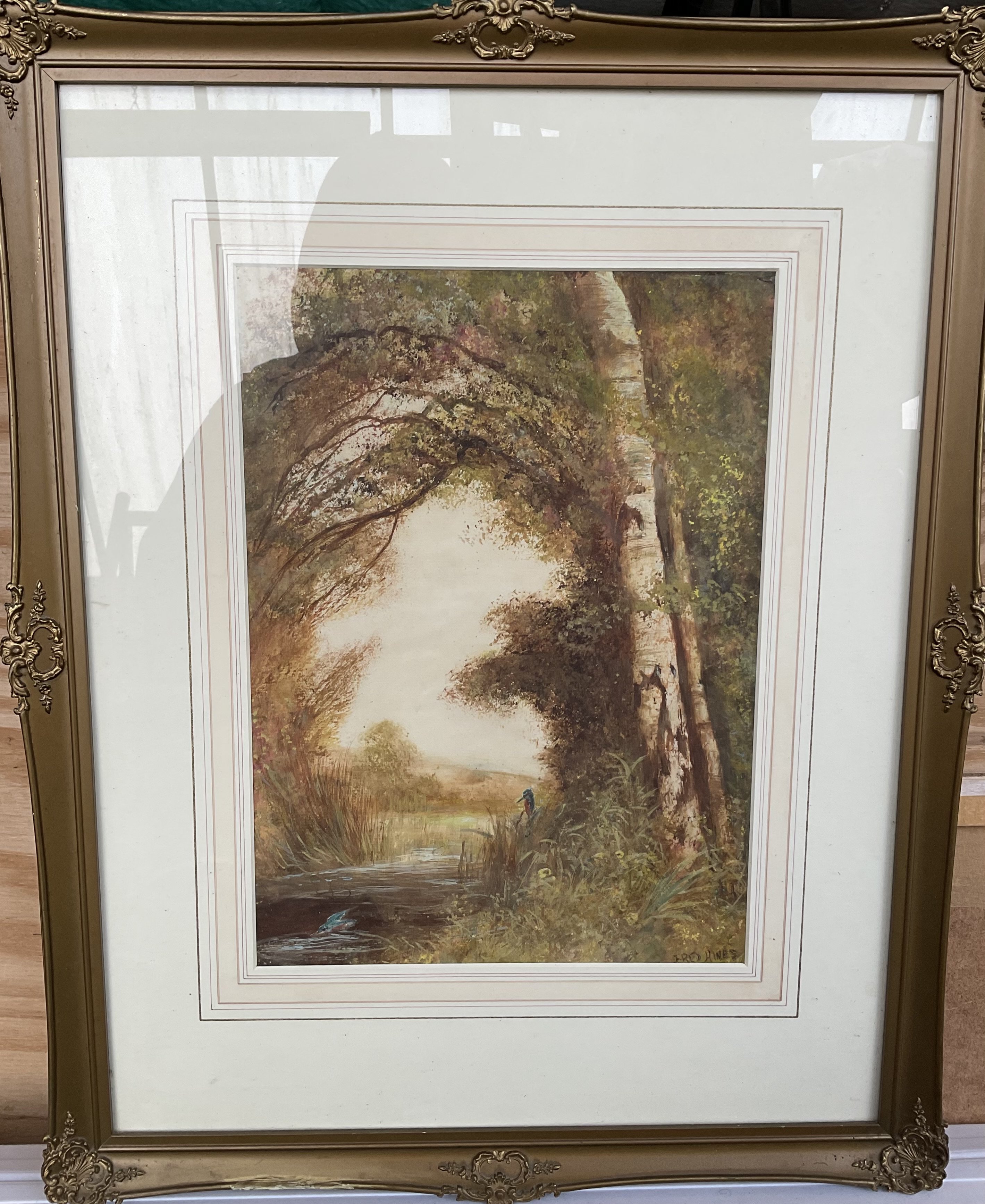 A Frederick Hines forest and river bank watercolour. Approx size 49x61cm.