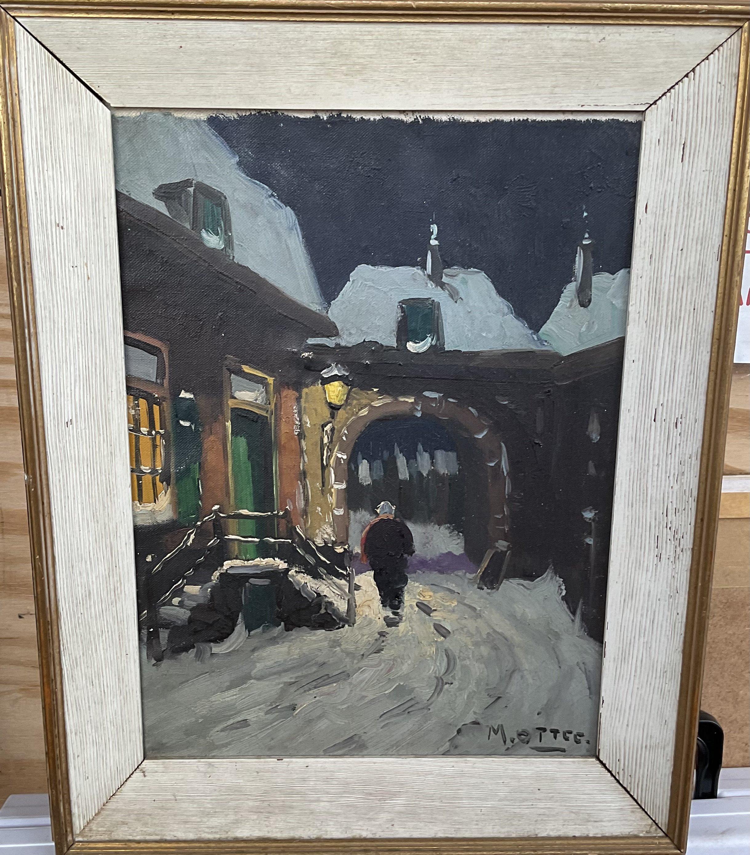 A Marc ottee oil painting of a figure walking through a snow covered town. Approx size 39x50cm.