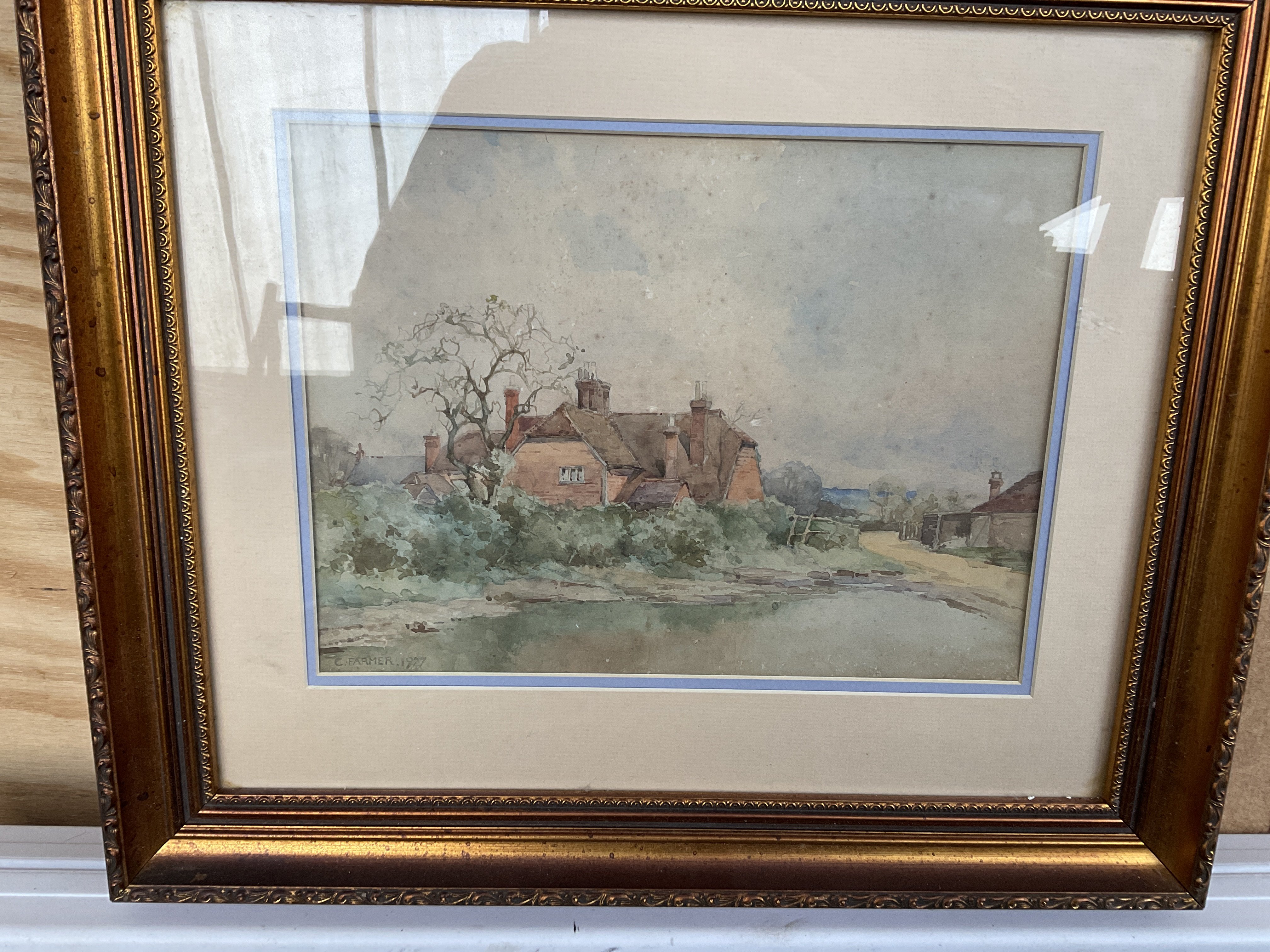 A farmhouse watercolour painting signed C.FARMER.1927. Approx size 51.5x44.5cm.