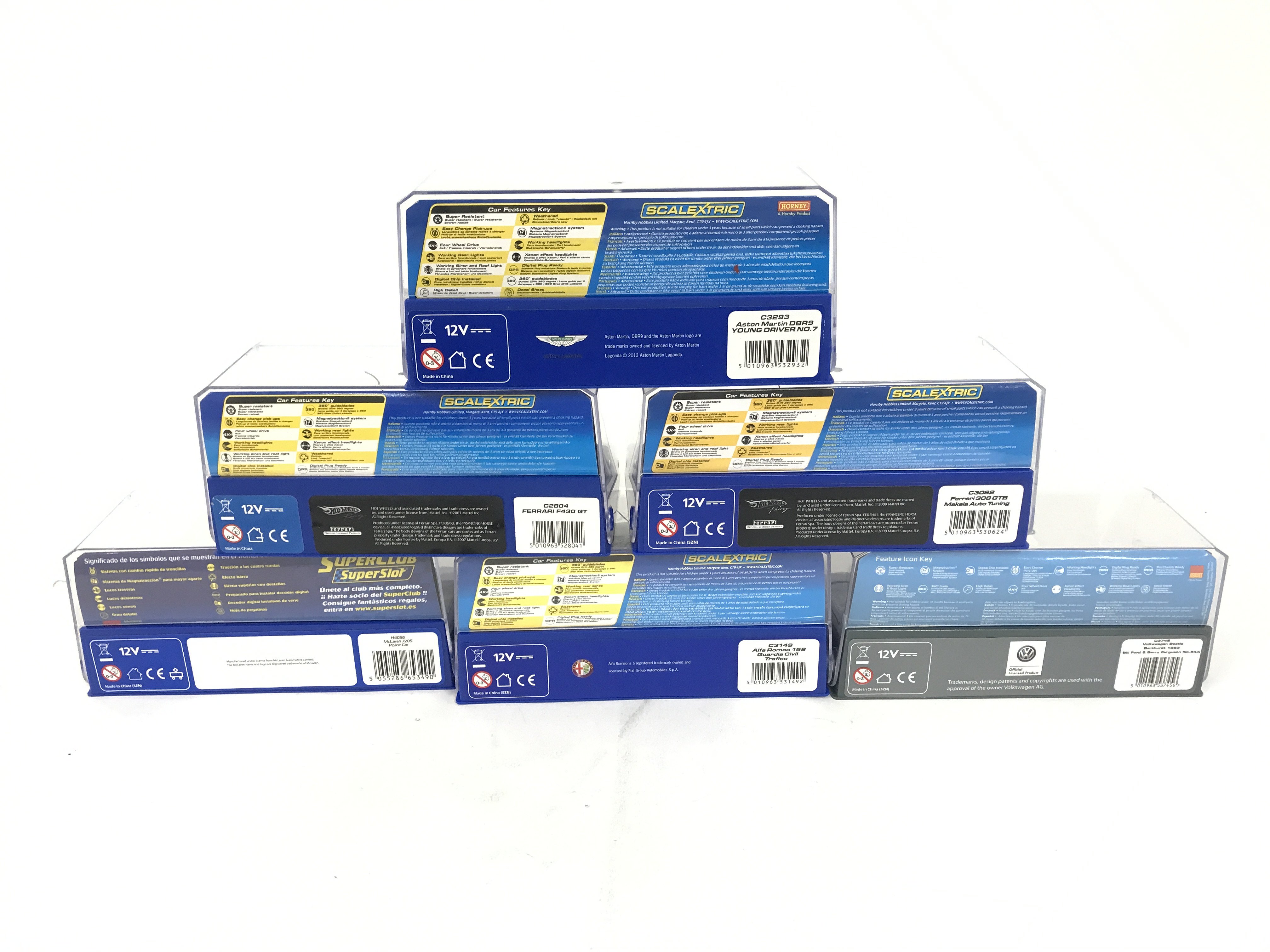 6 boxed Scalextric cars, to include Aston Martin DBR9.Ferrari 308. Ferrari F430. Volkswagen Beetle. Alfa Romeo 159. McLaren 720s Police car. No reserve.