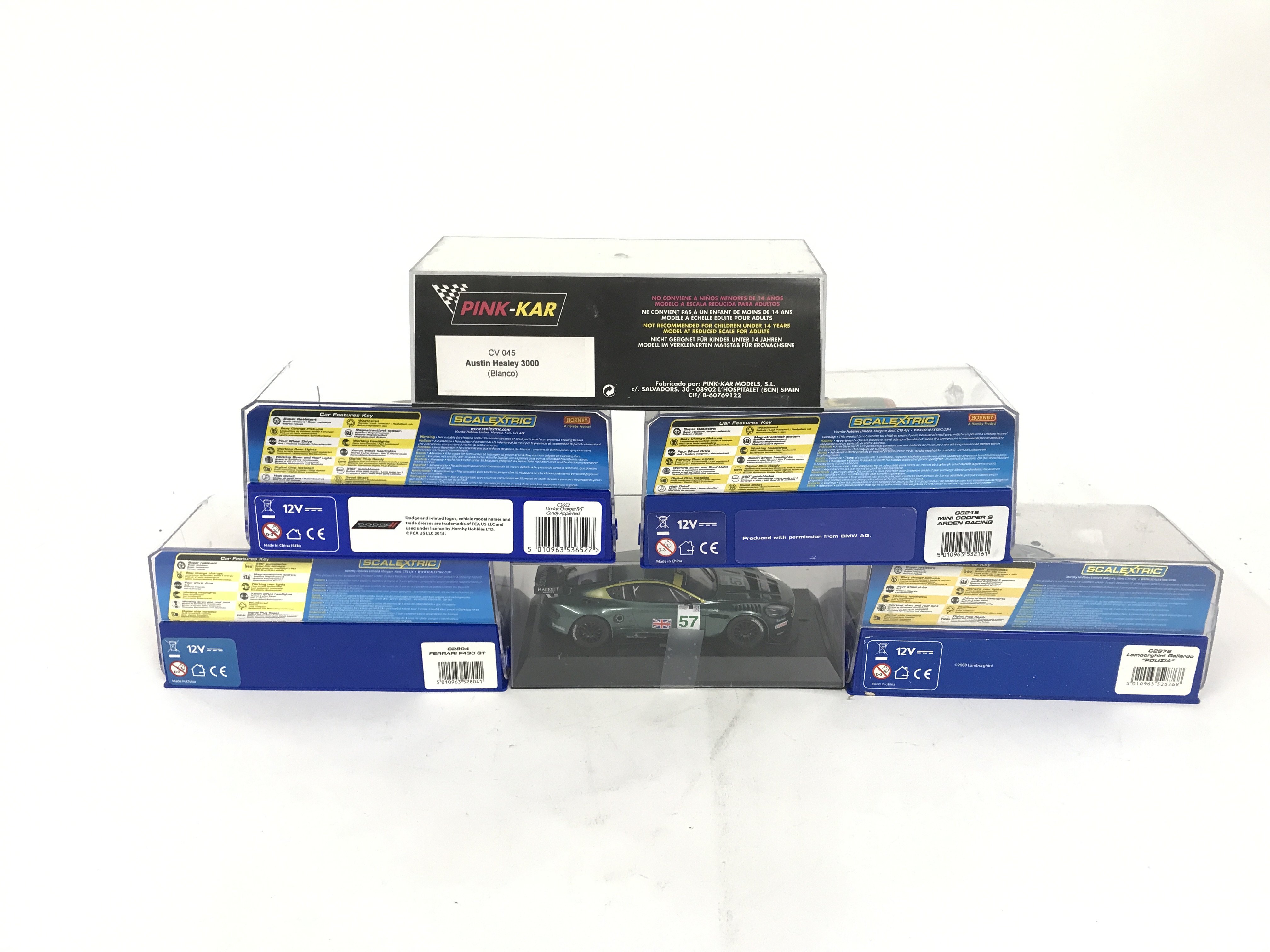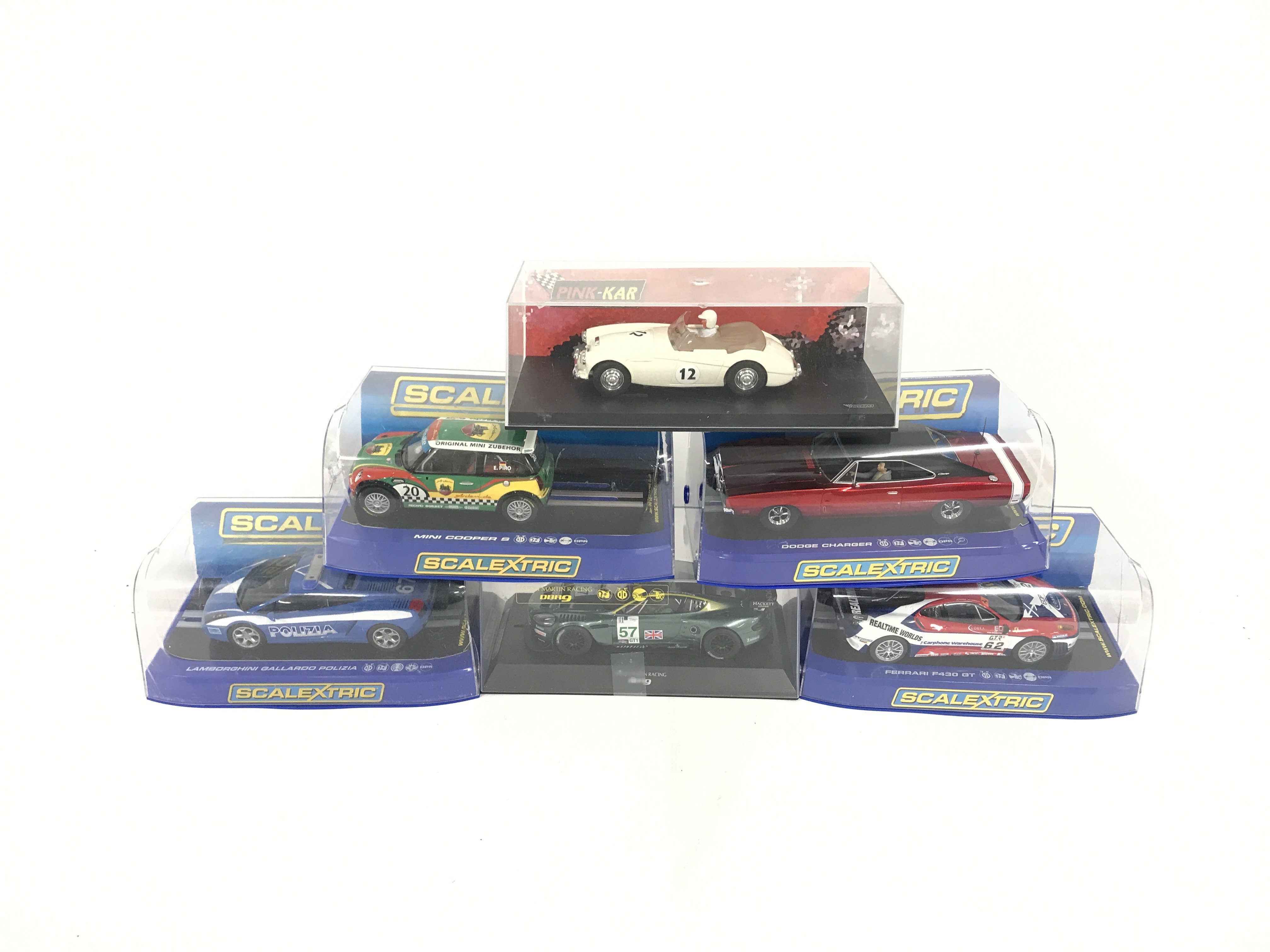6 boxed Scalextric cars. To include Ferrari F430. Aston Martin DB9. Lamborghini Gallardo. Mini Cooper s. Dodge Charger. Austin Healey. No reserve.