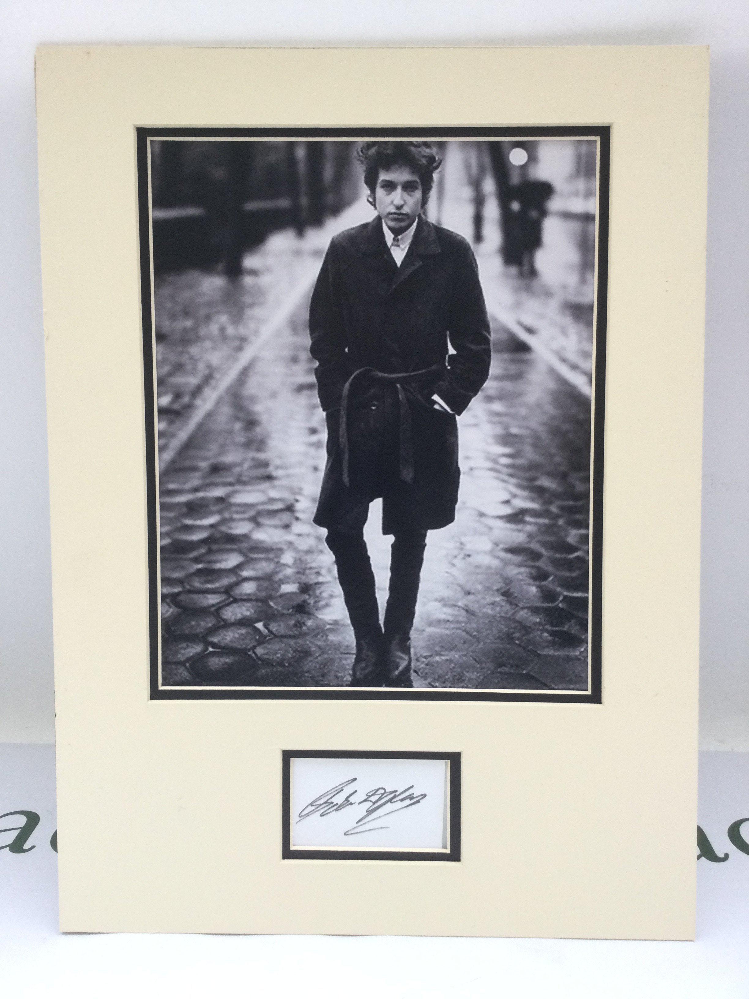 A Bob Dylan signed photo display. No COA. Please note that we are not experts in this field and can offer no guarantees that these signatures are genuine and will not be held responsible should they prove otherwise.