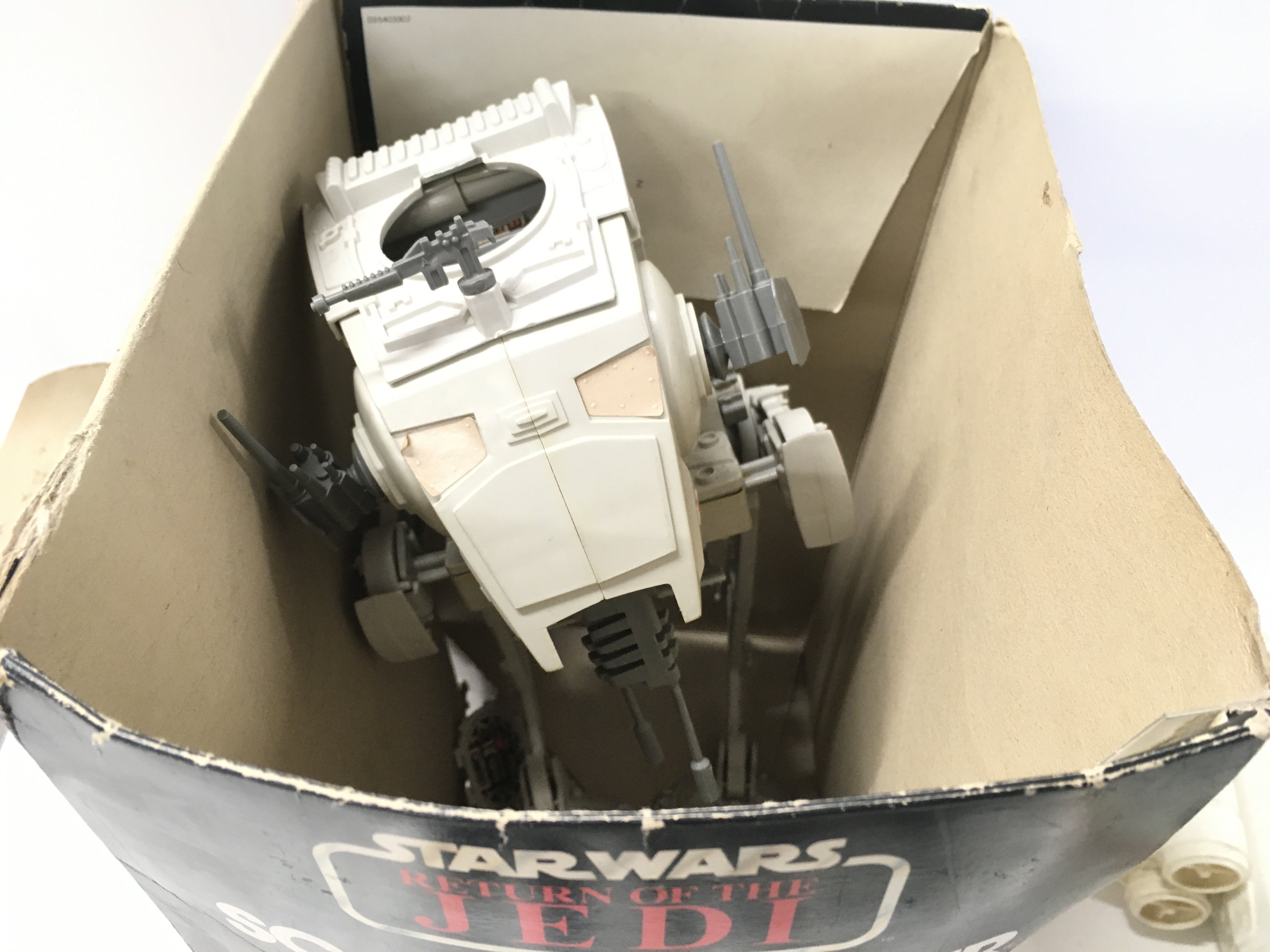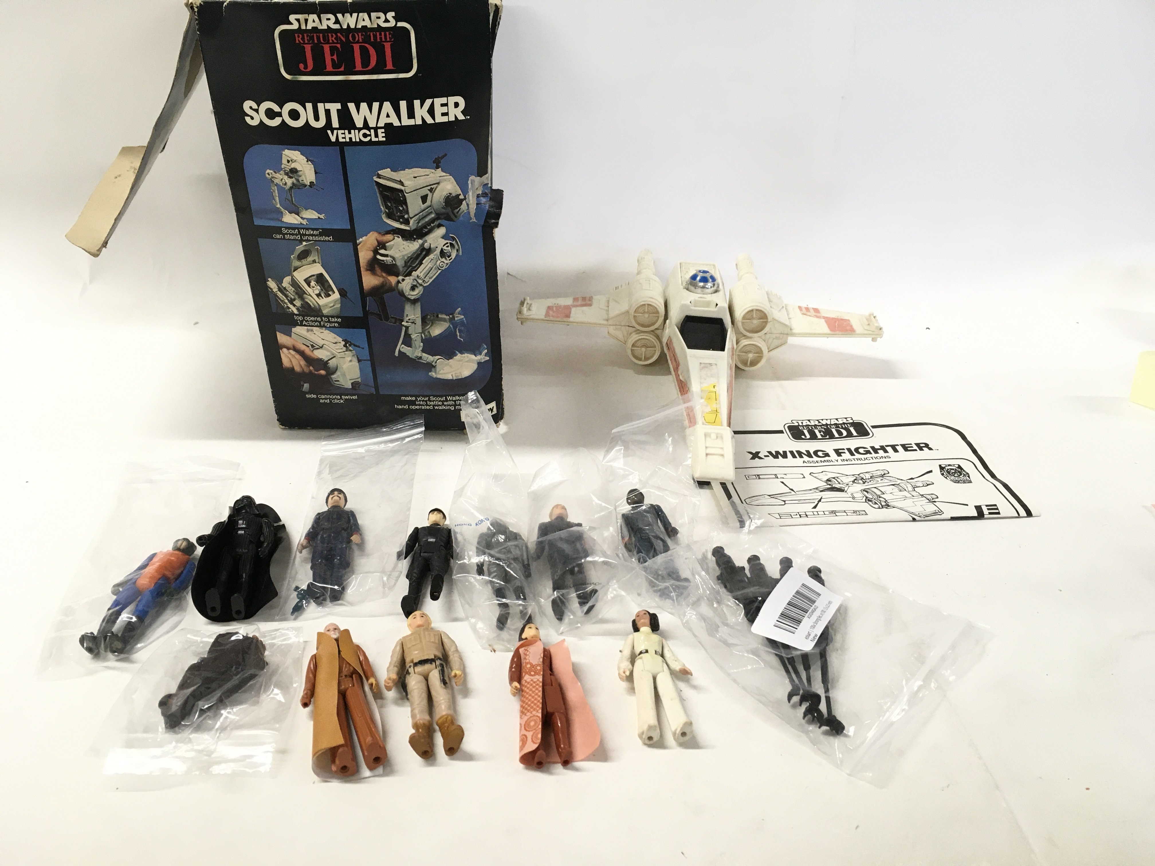 A collection of vintage Star Wars figures and vehicles including a scout Walker with box.