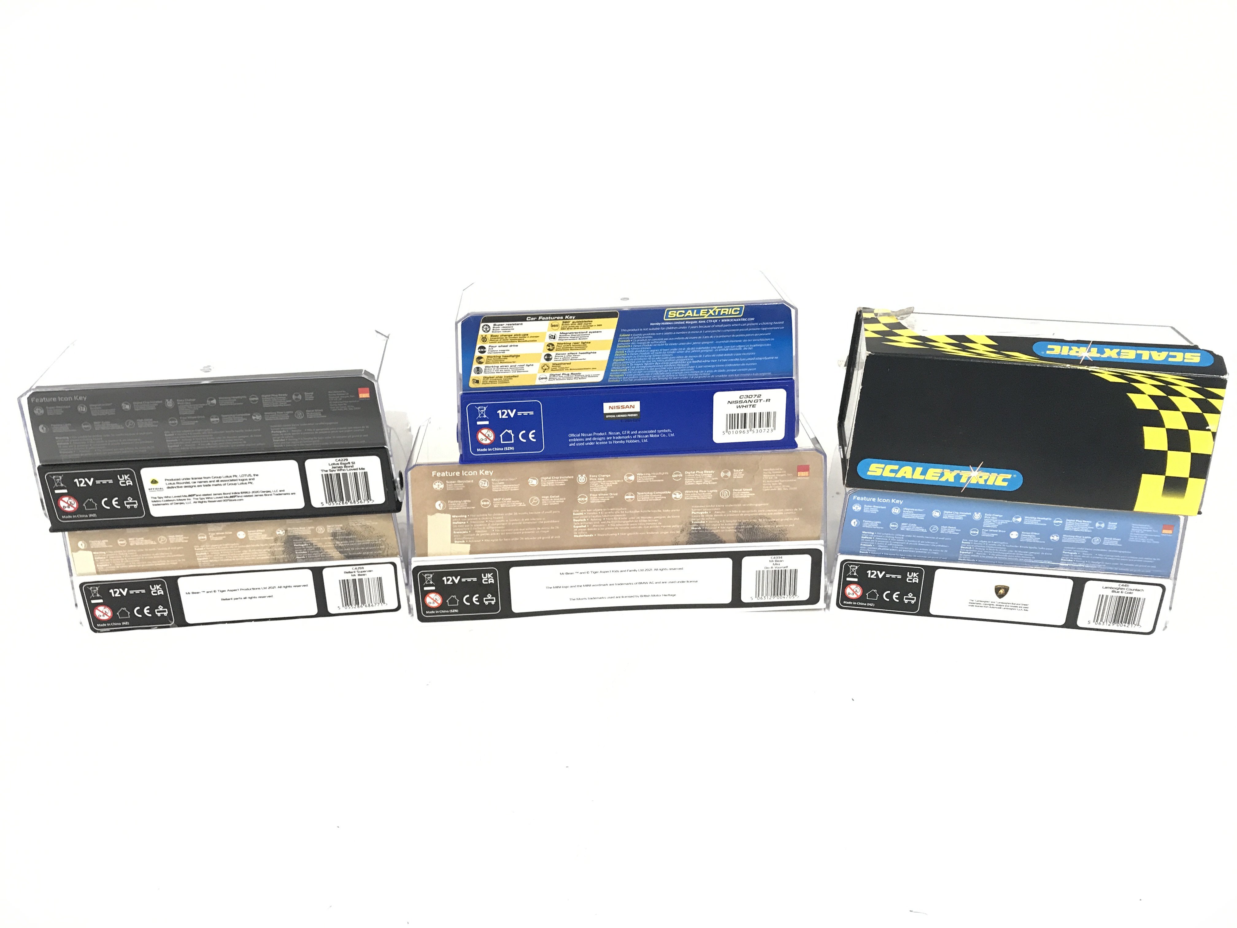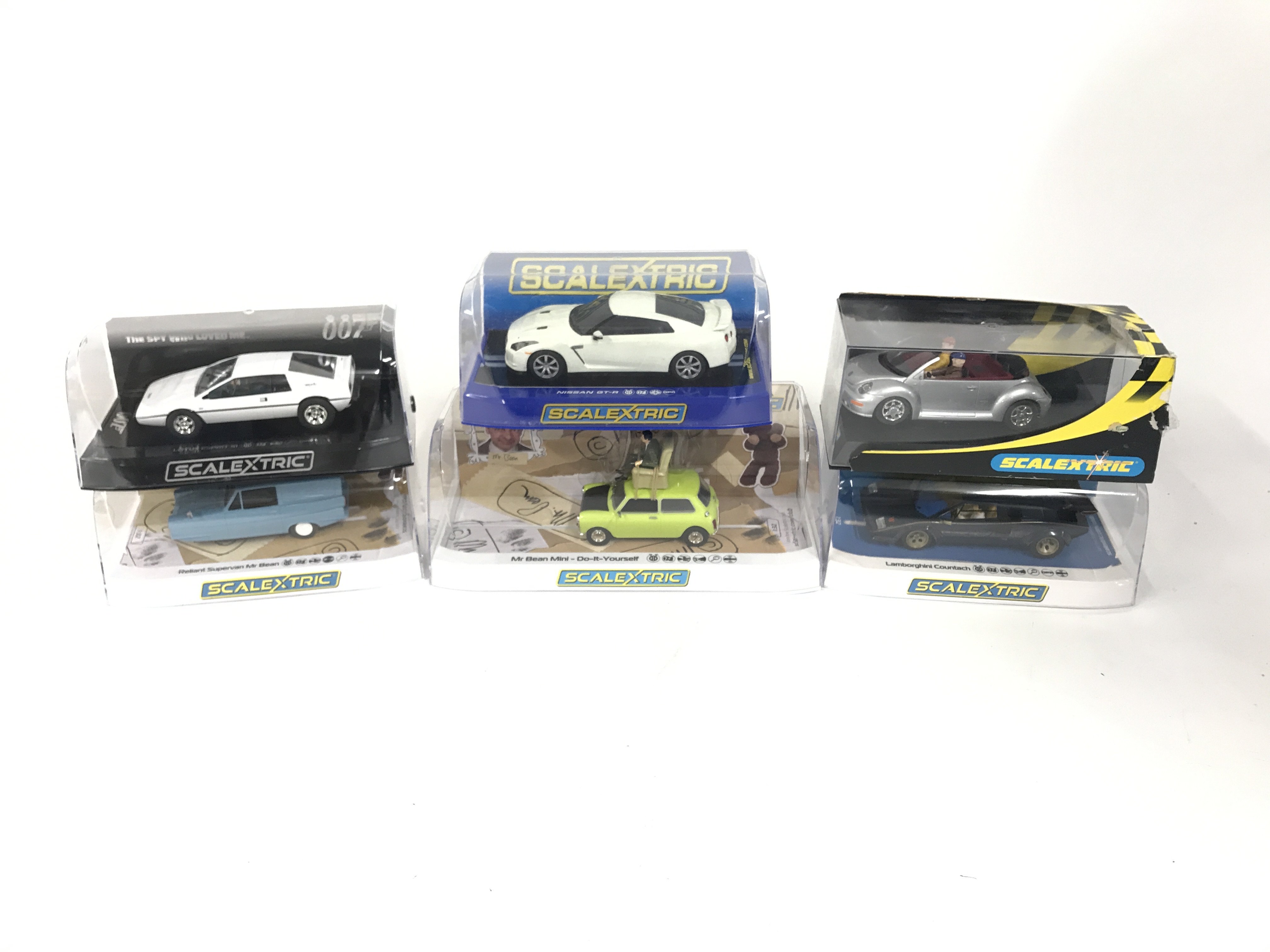 6 boxed Scalextric cars to include Mr Bean Mini. Mr Bean Reliant Supervan.Nissan GTR. Lotus Esprit. VW beetle. No reserve.