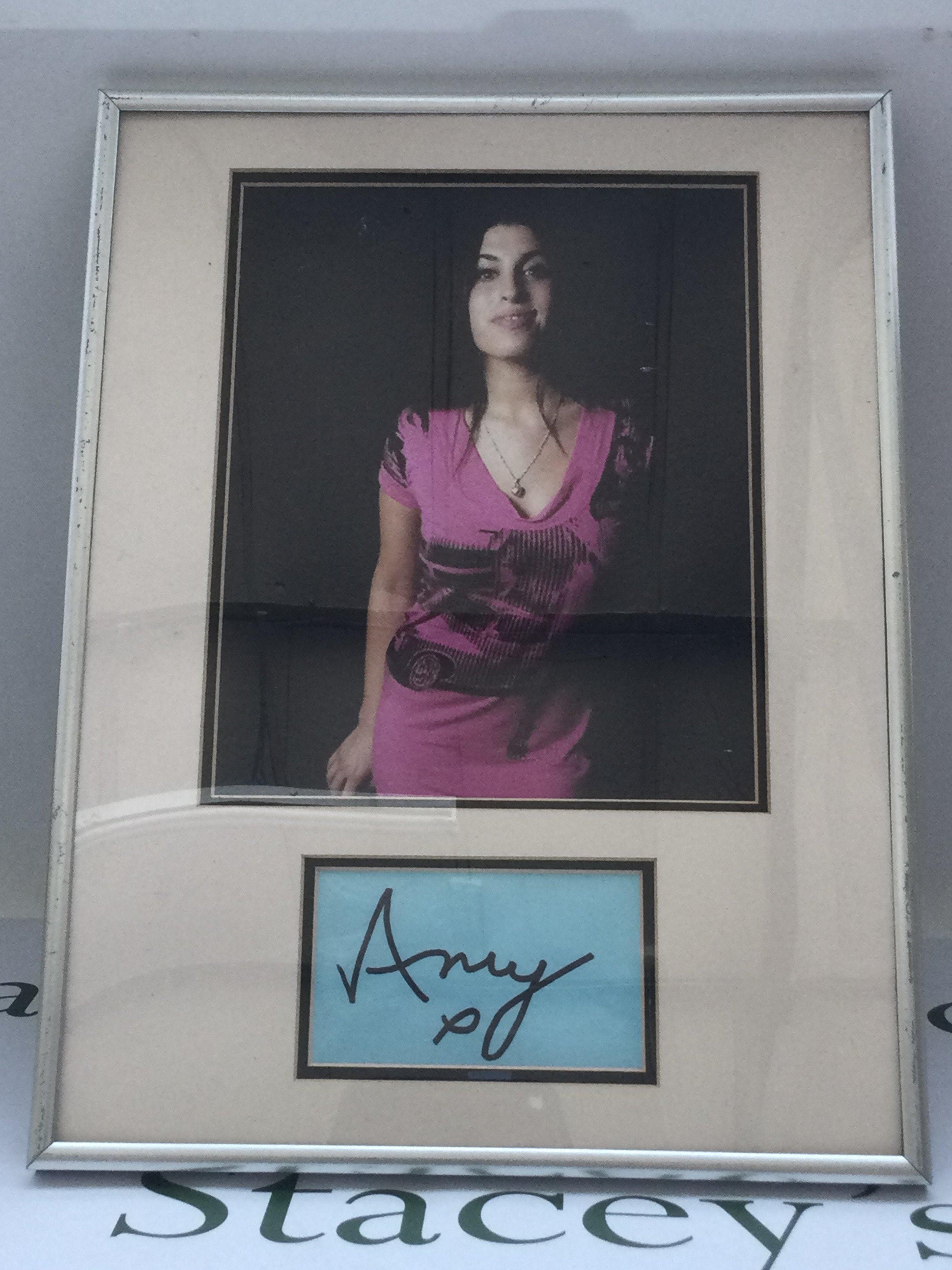 A framed and signed photo display of Amy Winehouse. No COA. Please note that we are not experts in this field and can offer no guarantees that these signatures are genuine and will not be held responsible should they prove otherwise.