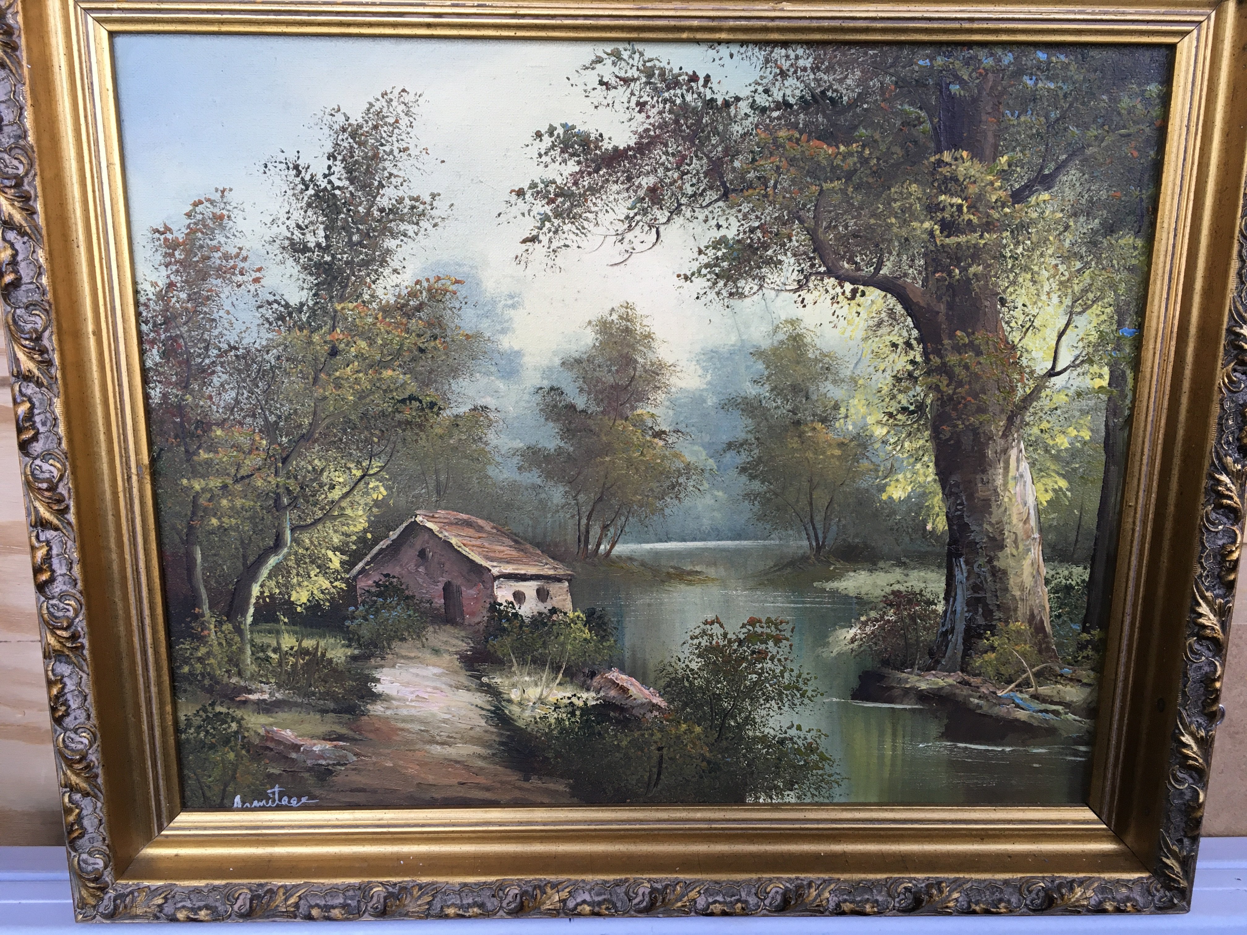 An original oil painting depicting a small house by a riverbank. Approx size 60x50cm.