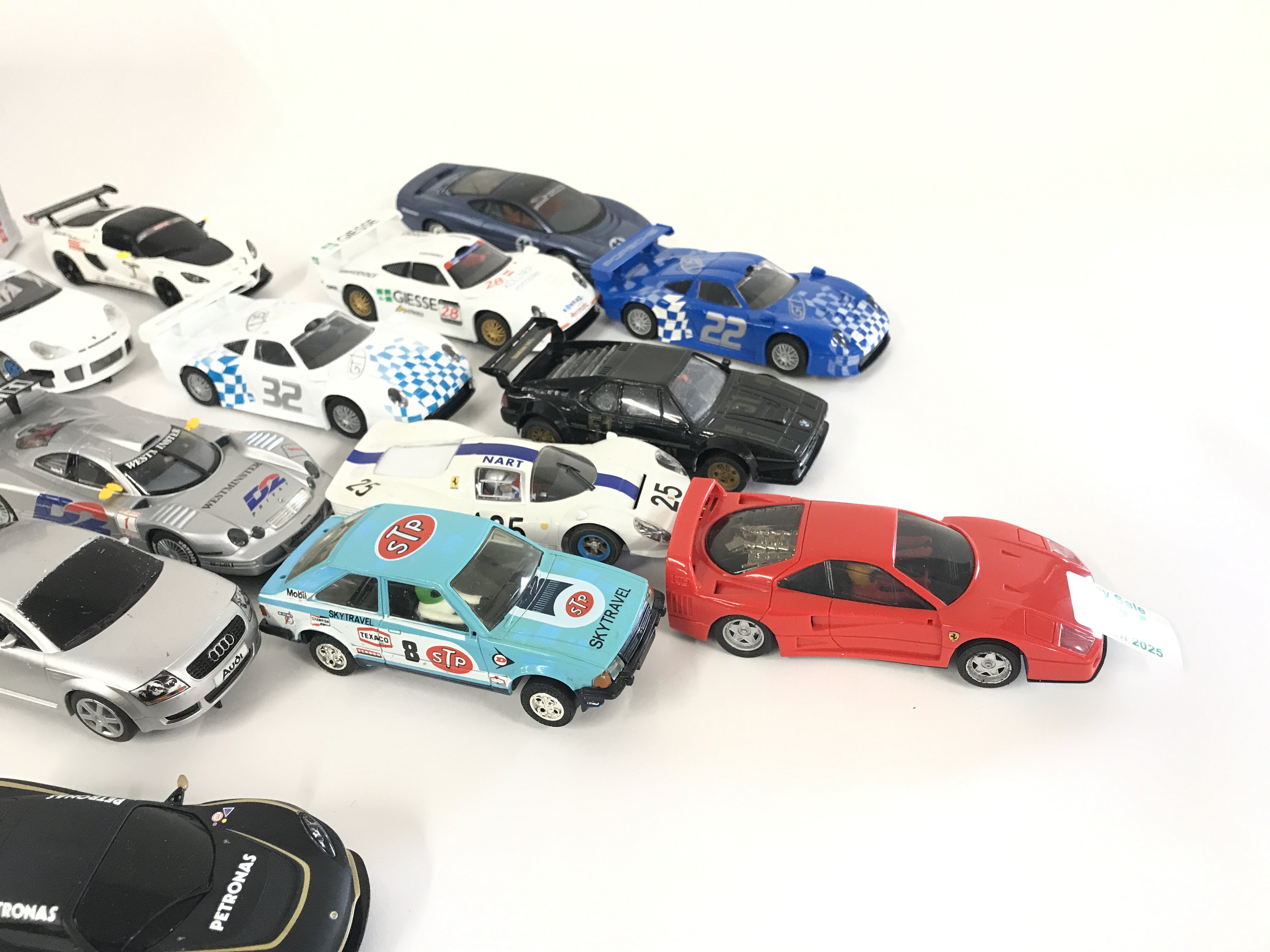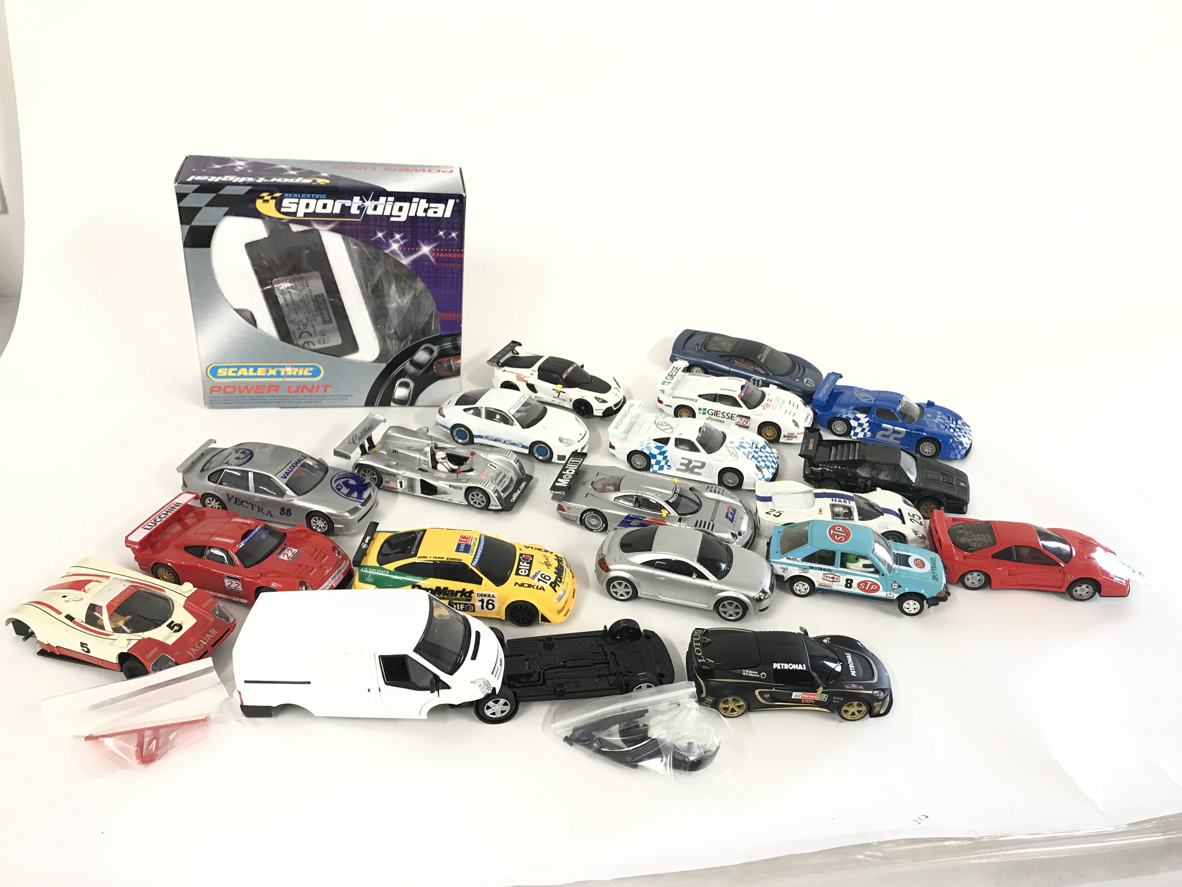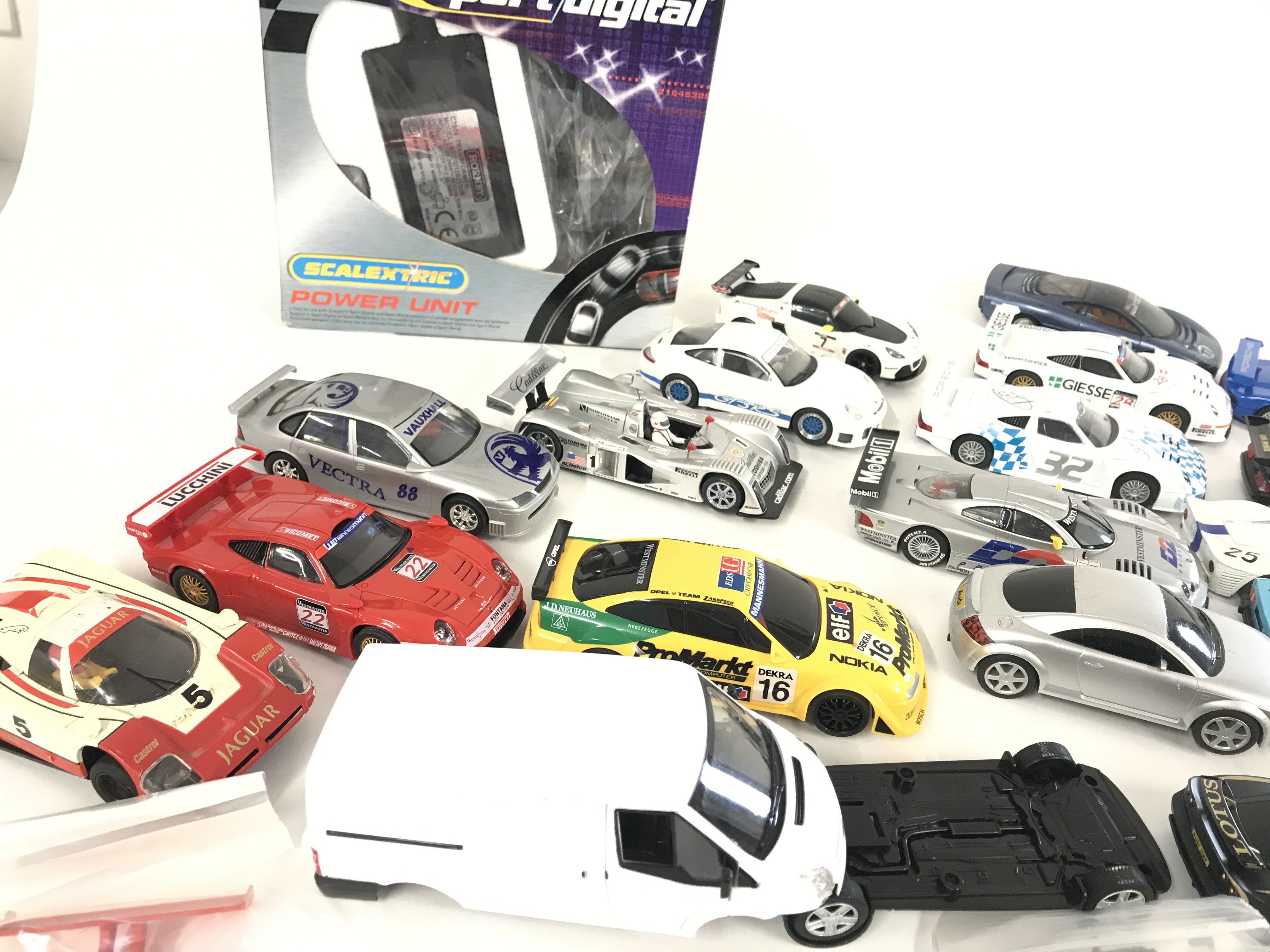 A box containing a quantity of Scalextric cars. Also to include some spares and accessories. No reserve.