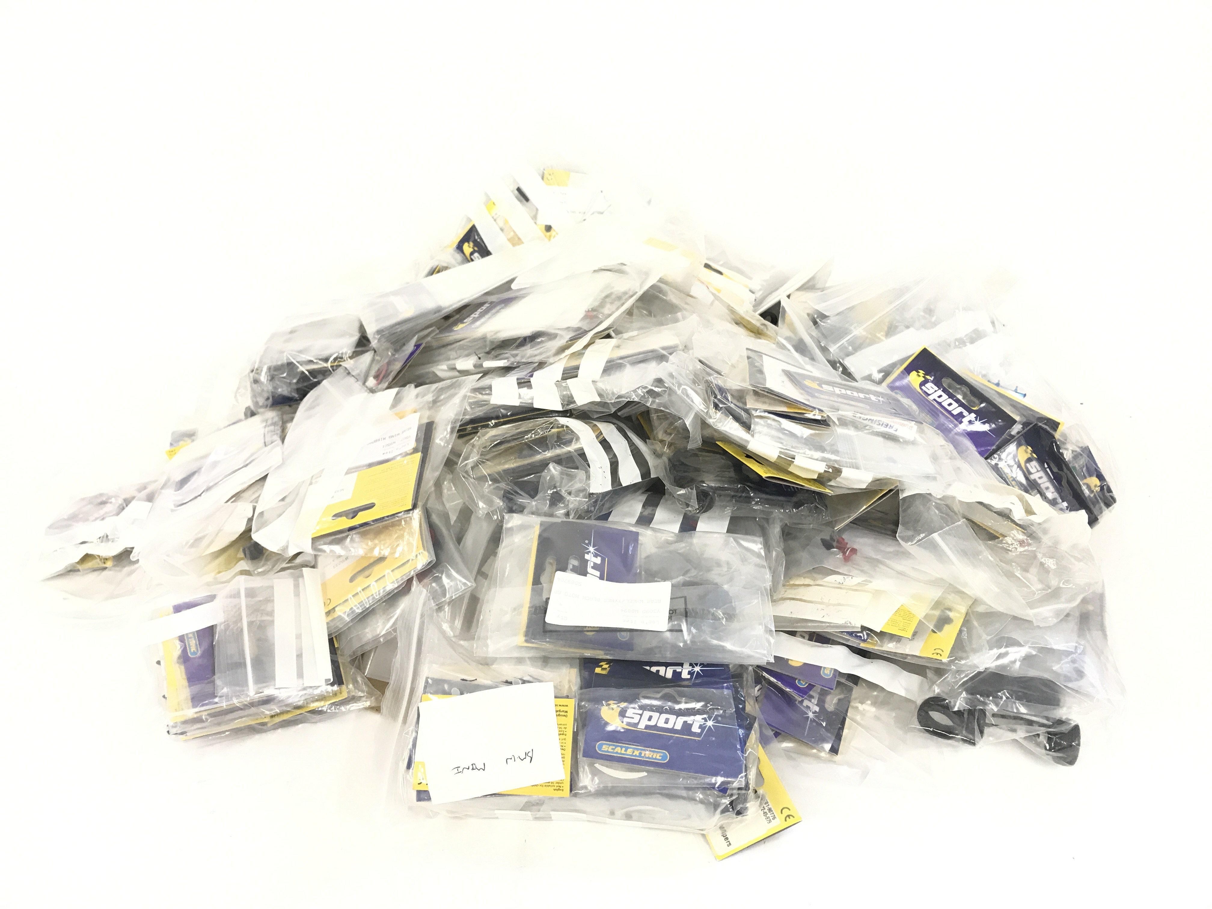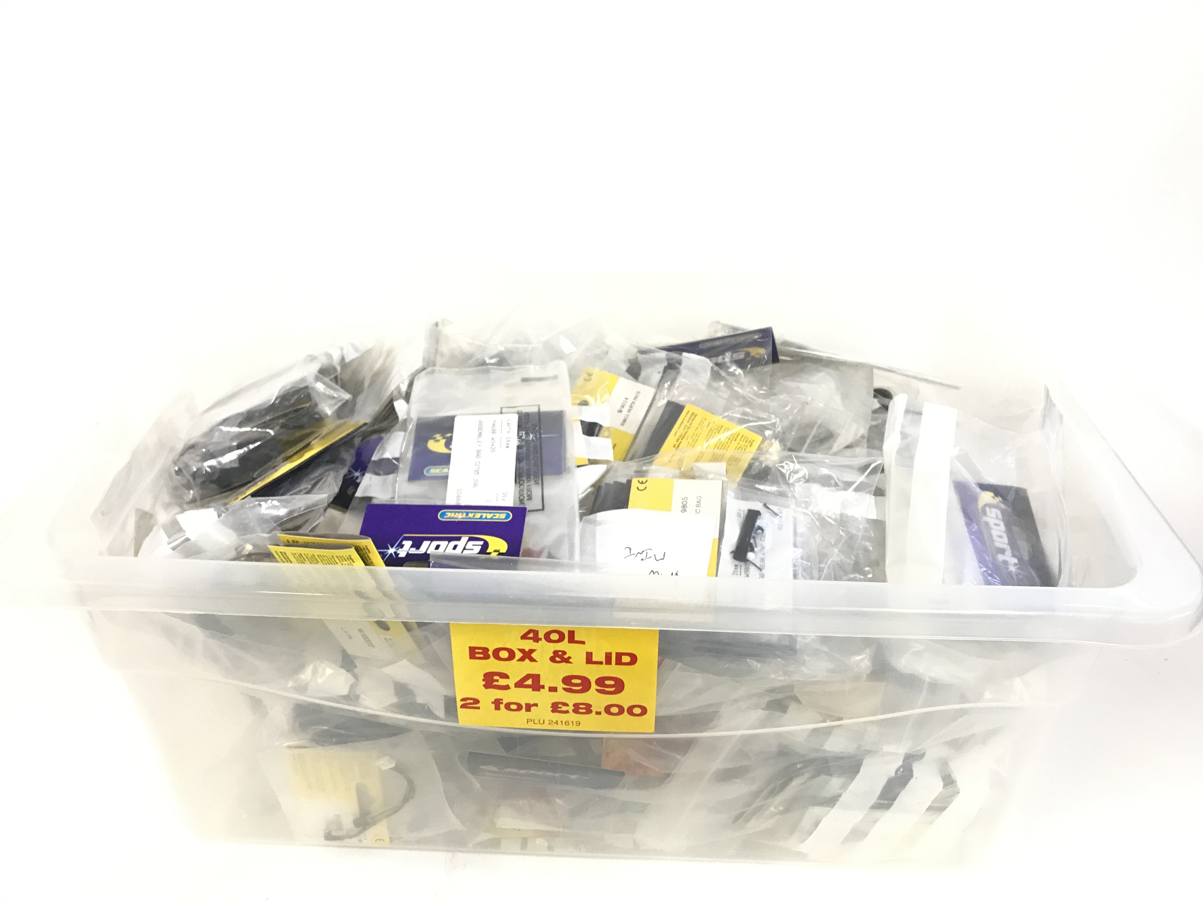 A box containing a large quantity of spare Scalextric parts. Mostly bagged and new. No reserve.