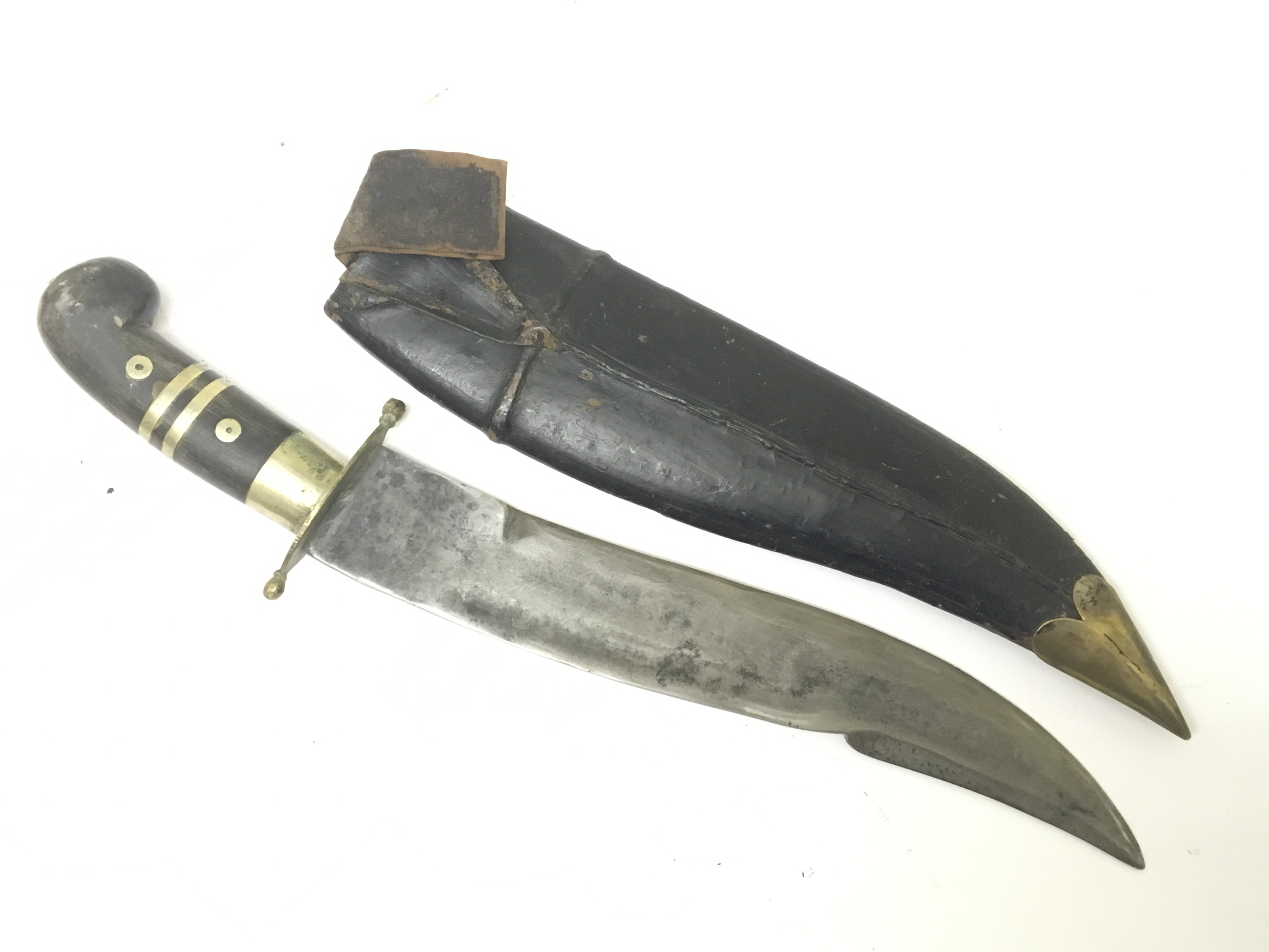 An Antique Indian dagger with an inlaid horn handle and leather and brass scabbard. length 40cm