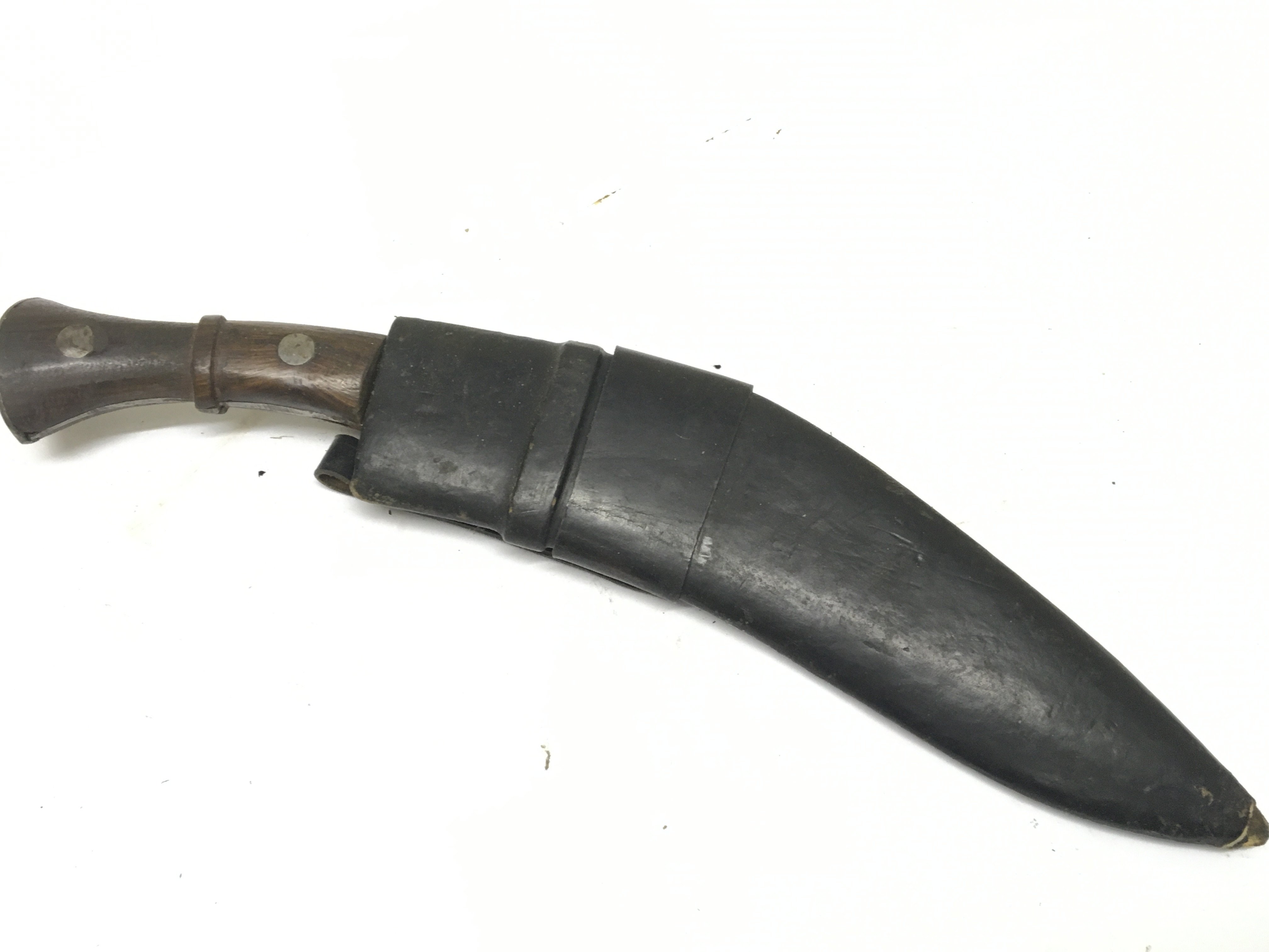 A Vintage Kukri Knife with a wood handle and leather scabbard.