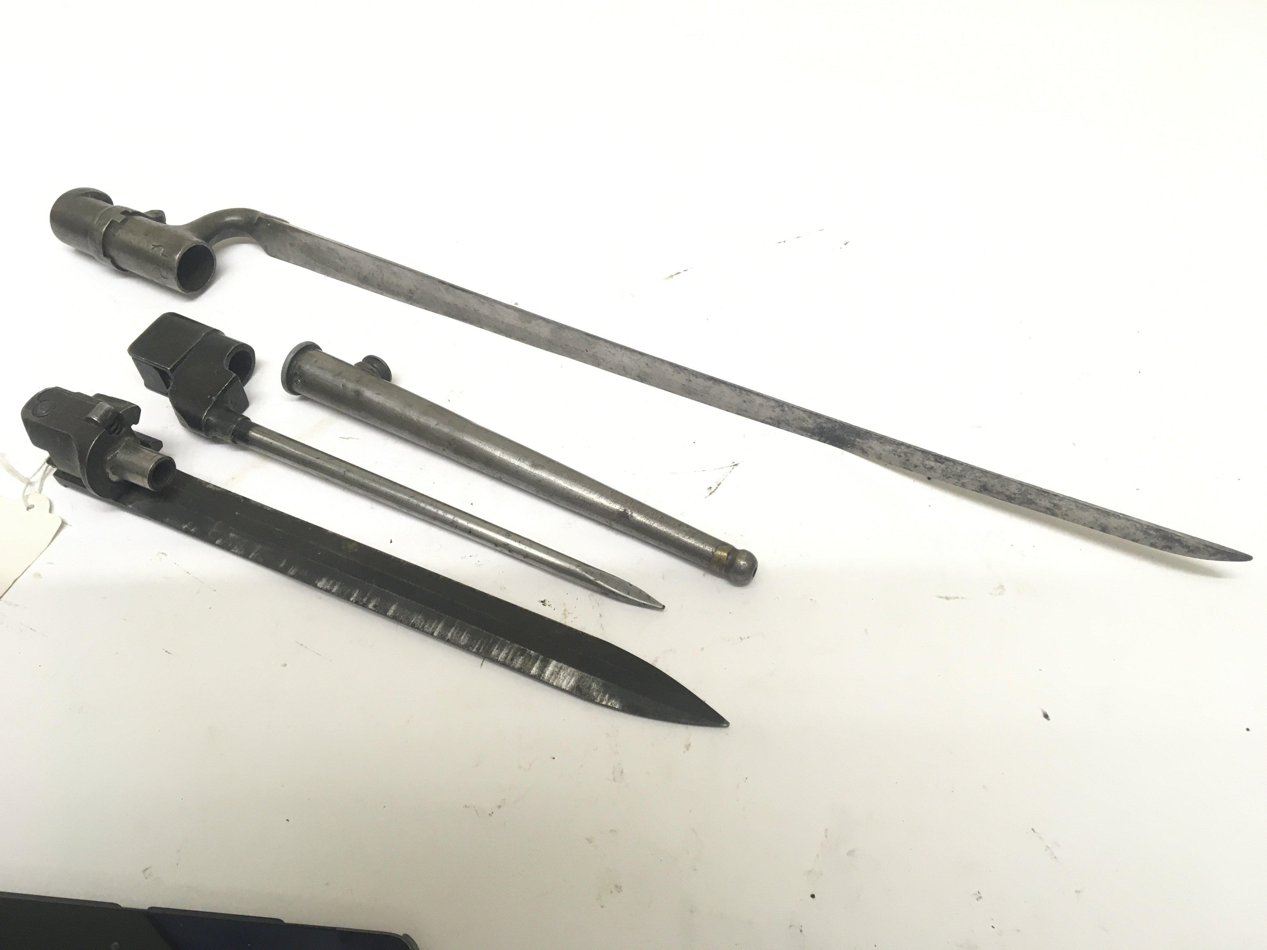 A 19th century spike socket bayonet with Middle Eastern marks a pig stick bayonet and scabbard and one other bayonet (3)