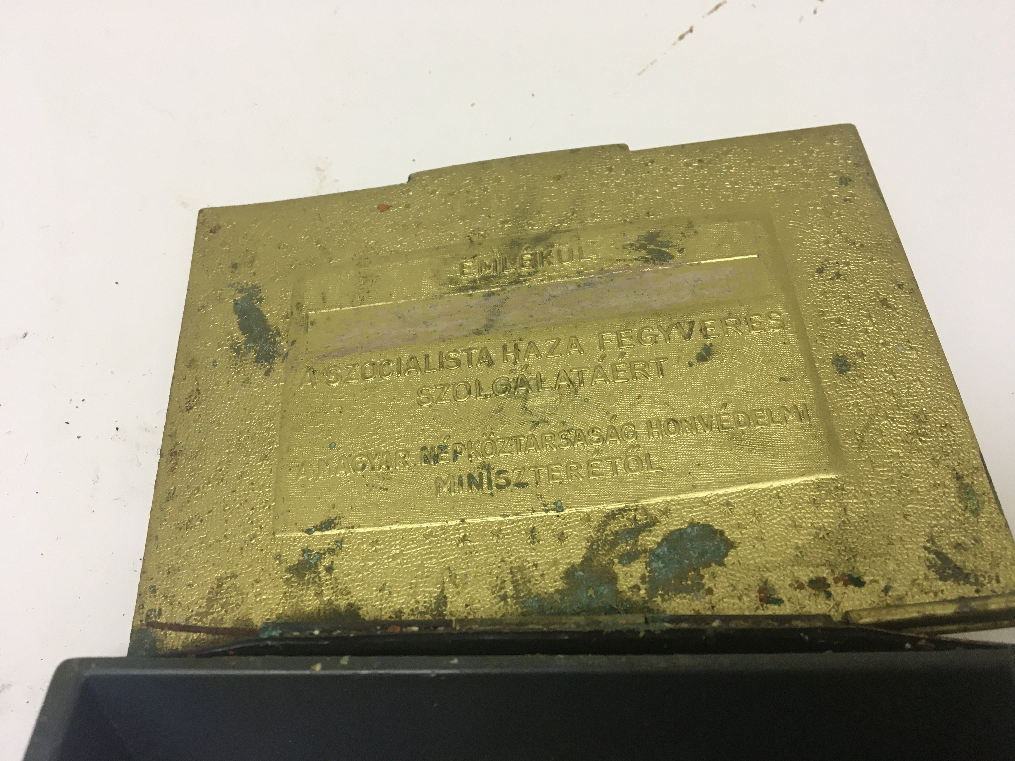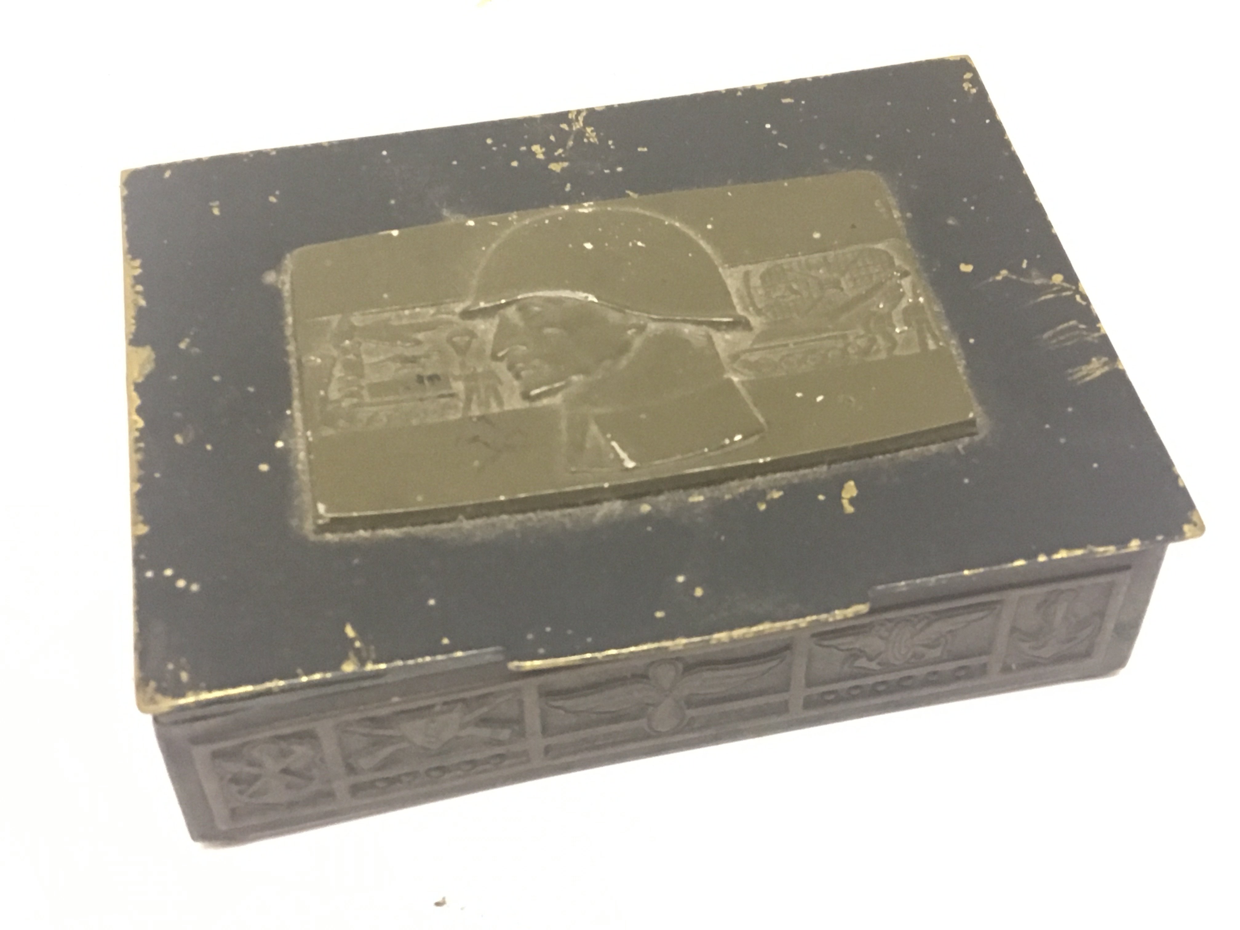An unusual Russian Military cigarette box the rectangular top with a raised plaque the underside of the lid with Russian inscription.12.5x9cm