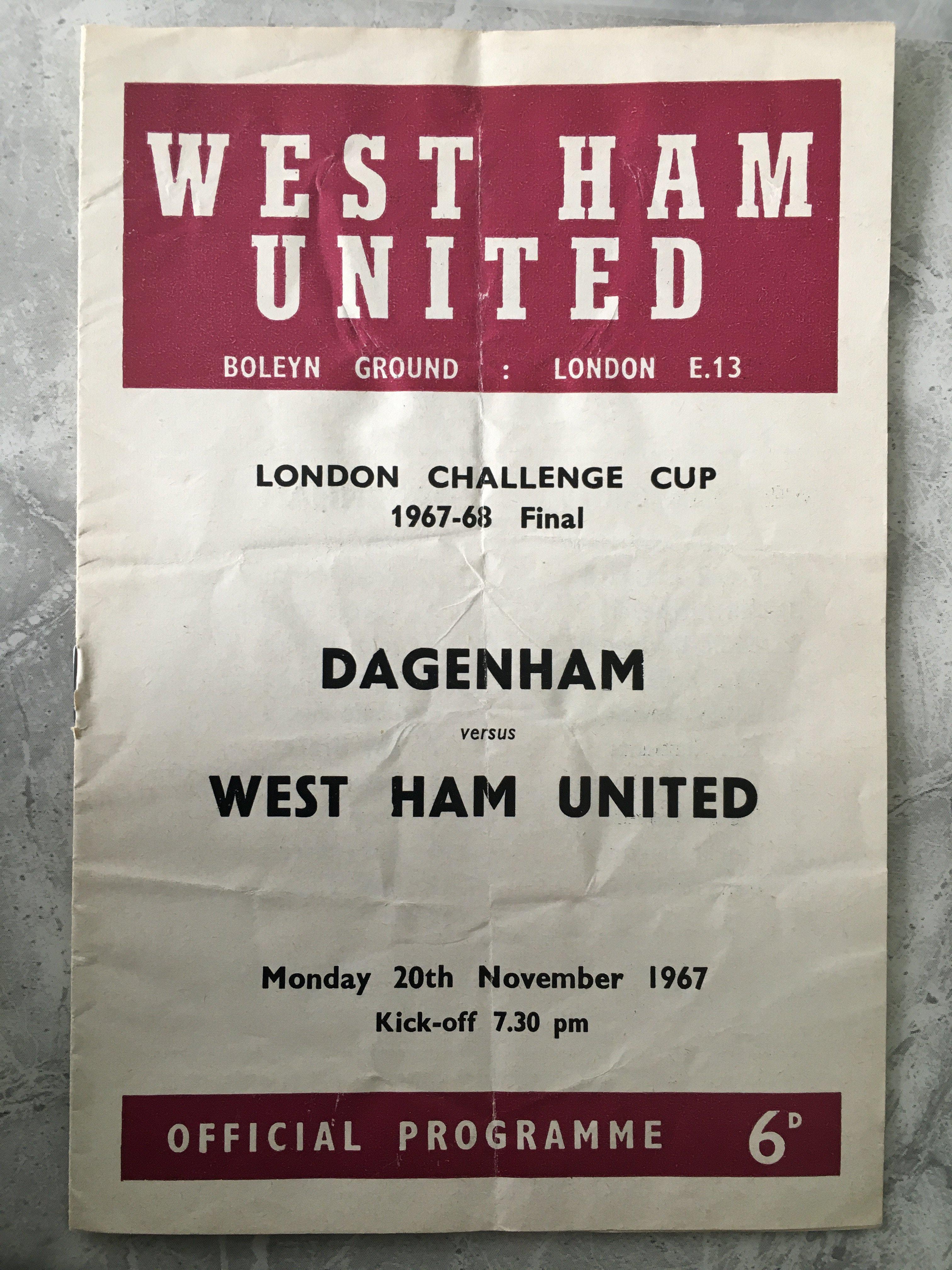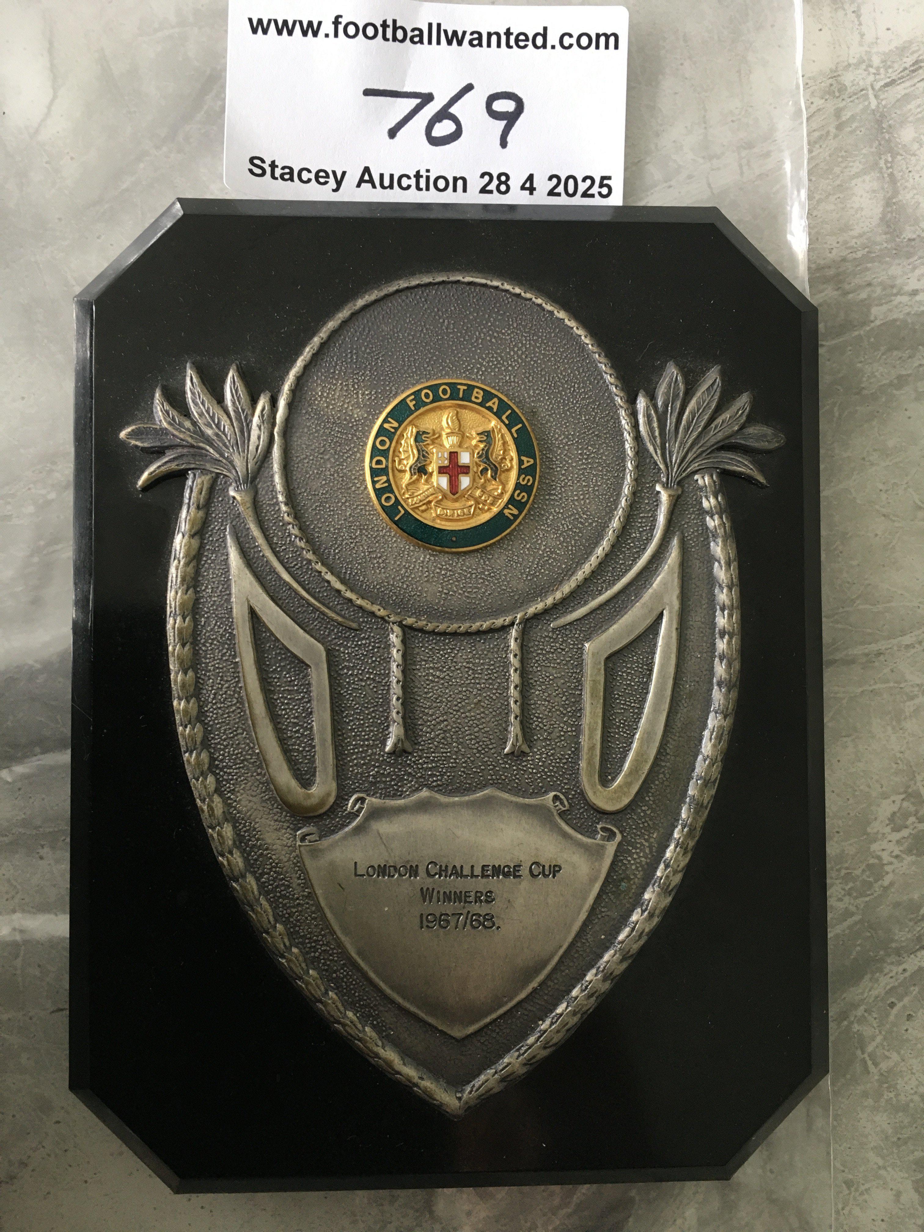 West Ham 67/68 London Challenge Cup Winners Plaque: Nice good condition plaque with London Football Association enamel badge with metal being engraved London Challenge Cup Winners 1967/68. Awarded to Colin Mackleworth who played in the final. West Ham defeated Hendon Enfield and Tottenham along the way.
