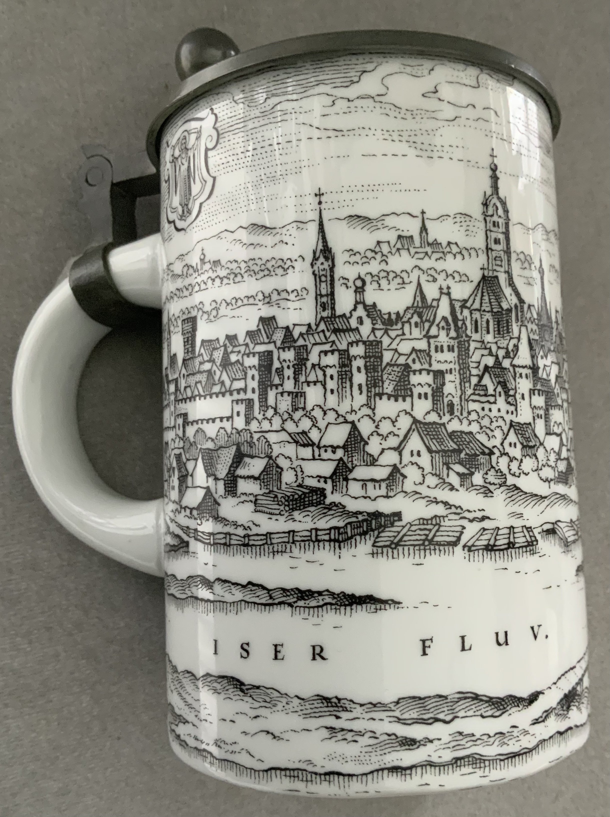 1965 ECWC Final West Ham Players Gift: Stunning top quality ceramic stein presented by TSV Munich to West Ham goalkeeper Ernie Gregory. Stein depicts Munchen Iser Fluv with decorative architecture. Lid is pewter and engraved In Freundschaft Finale Europa Pokal Spiel West Ham United TSV Munchen 1660 and date of match.