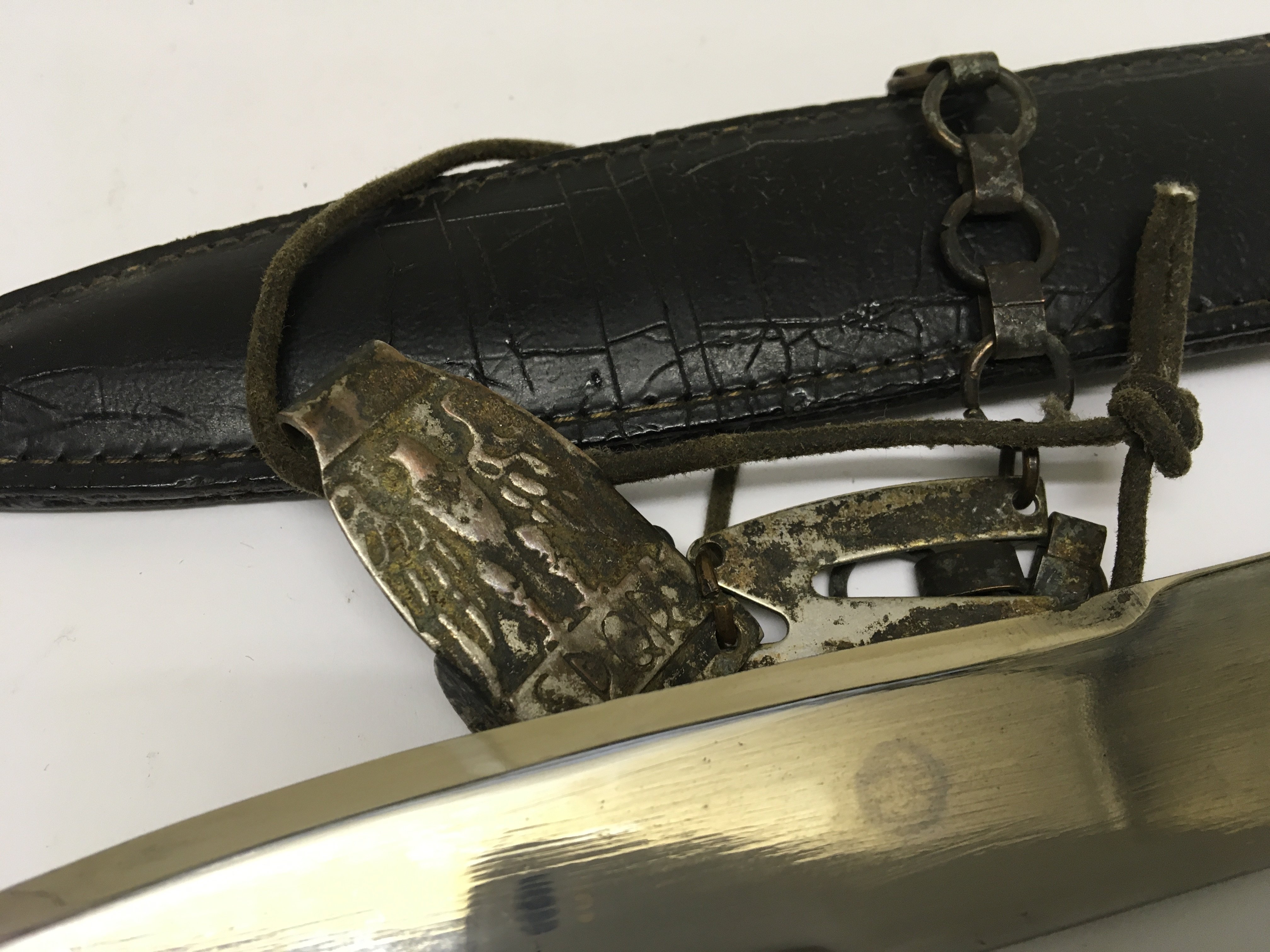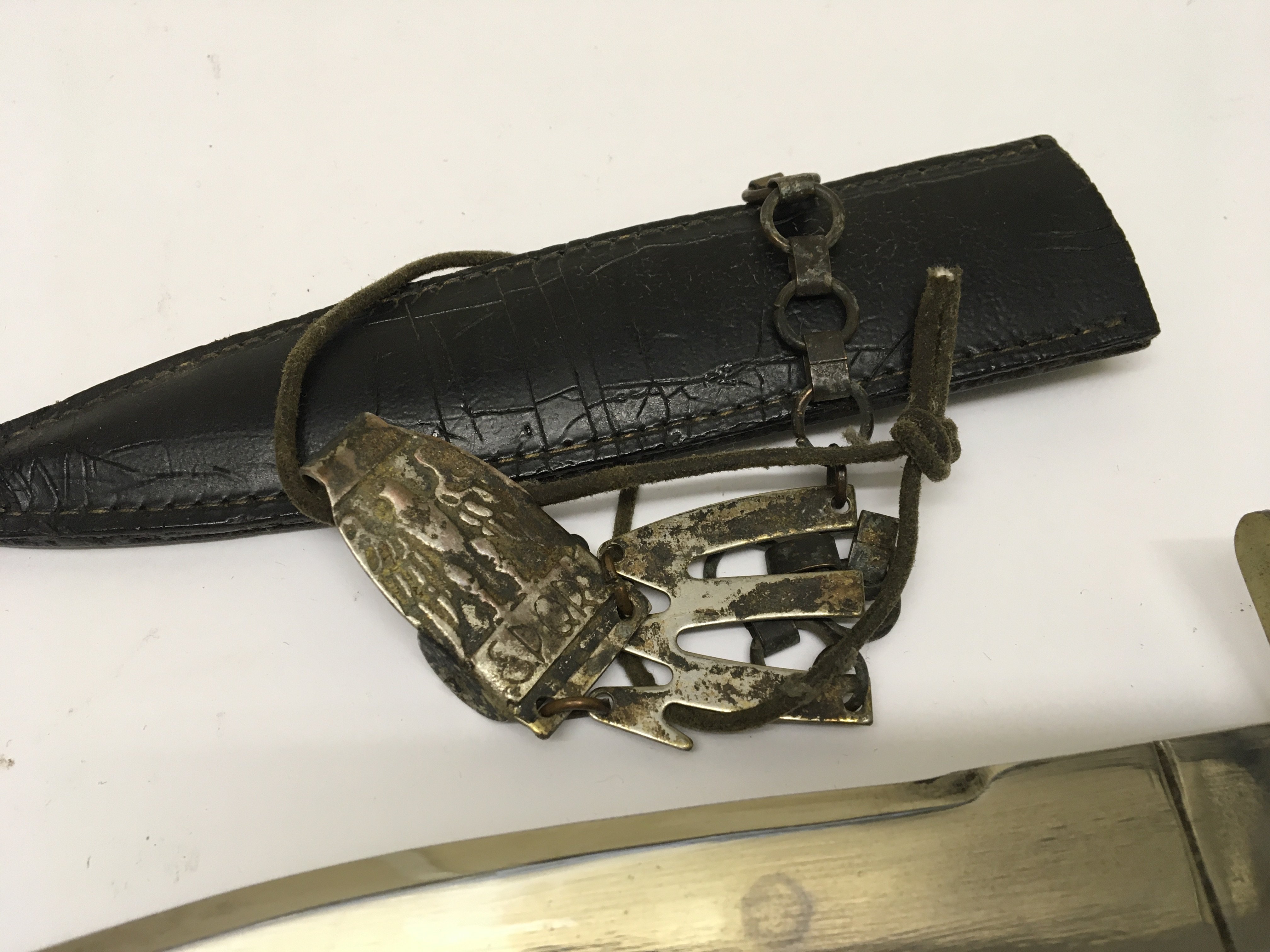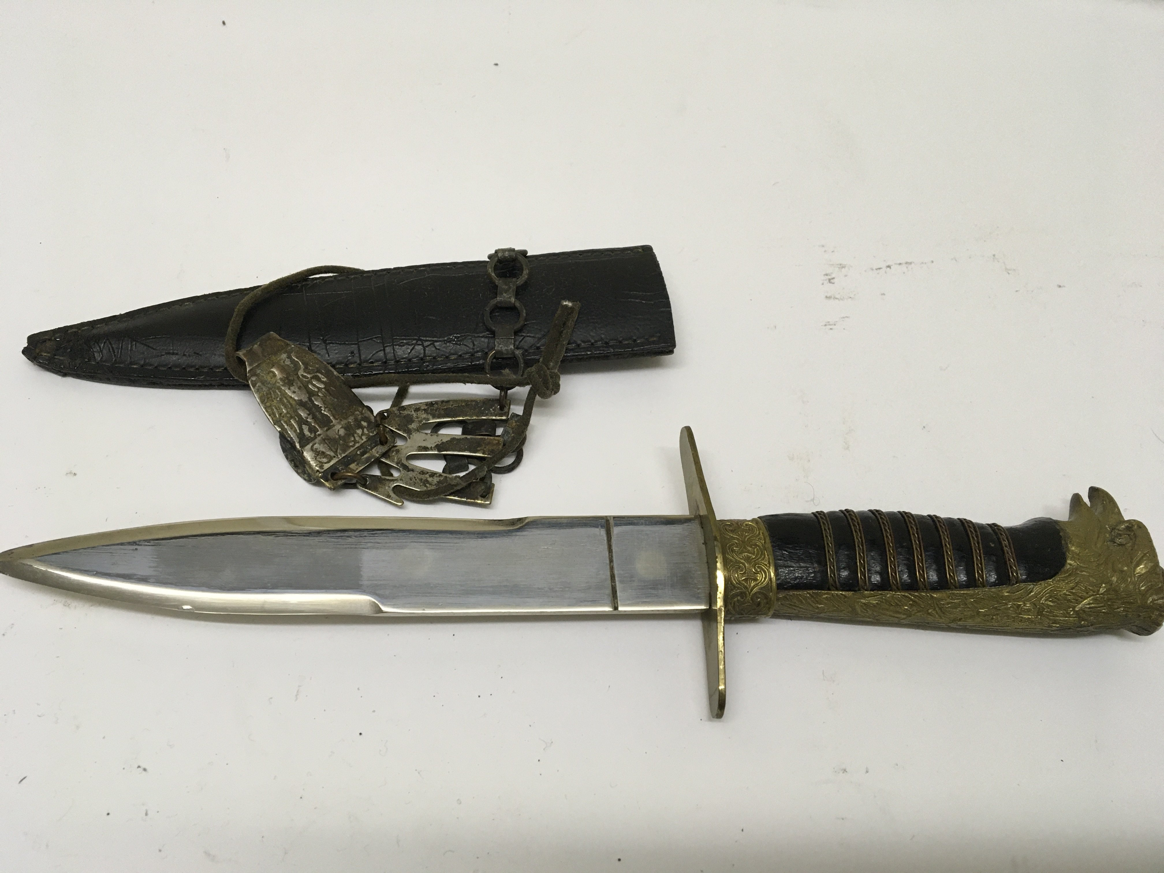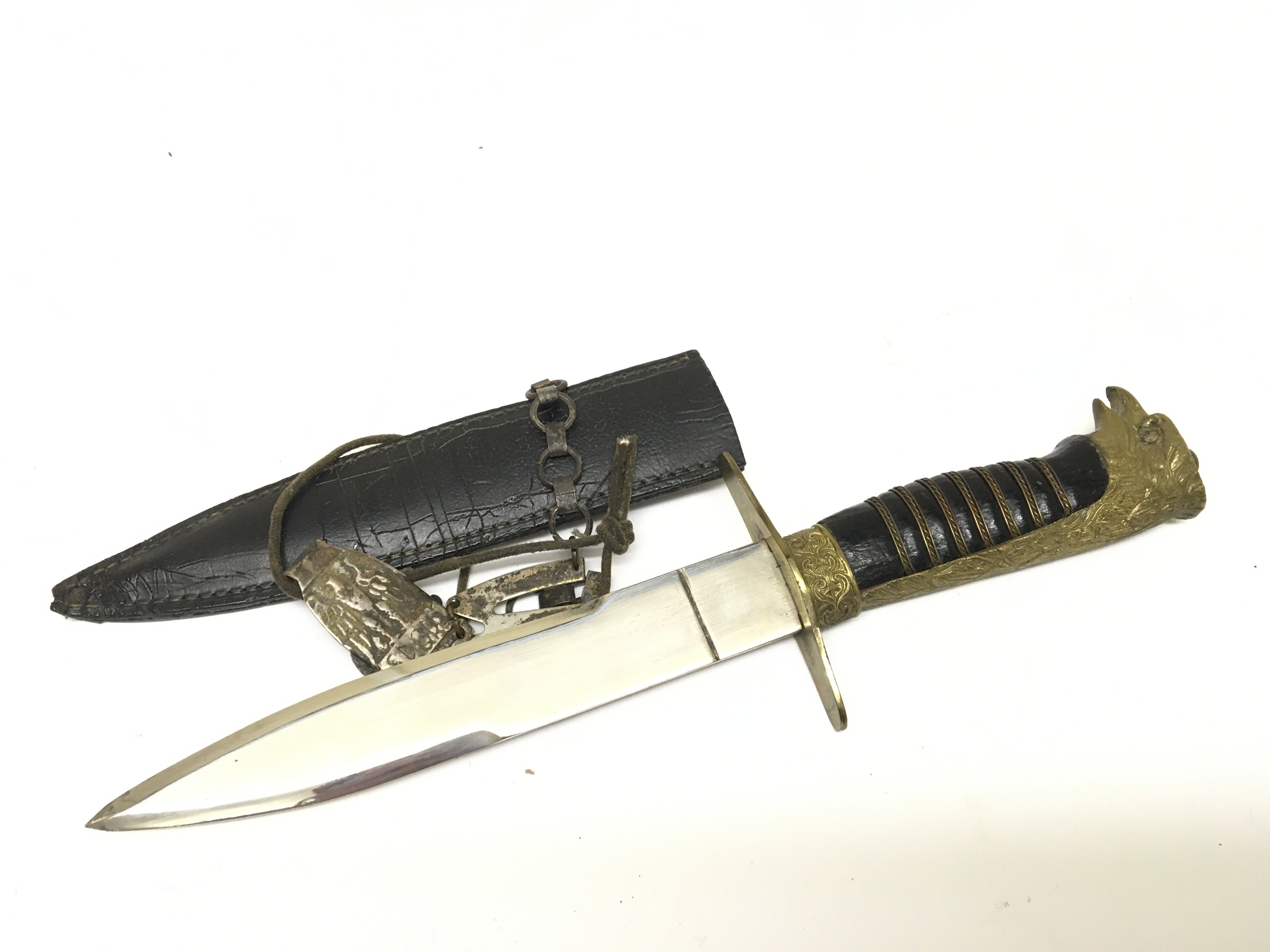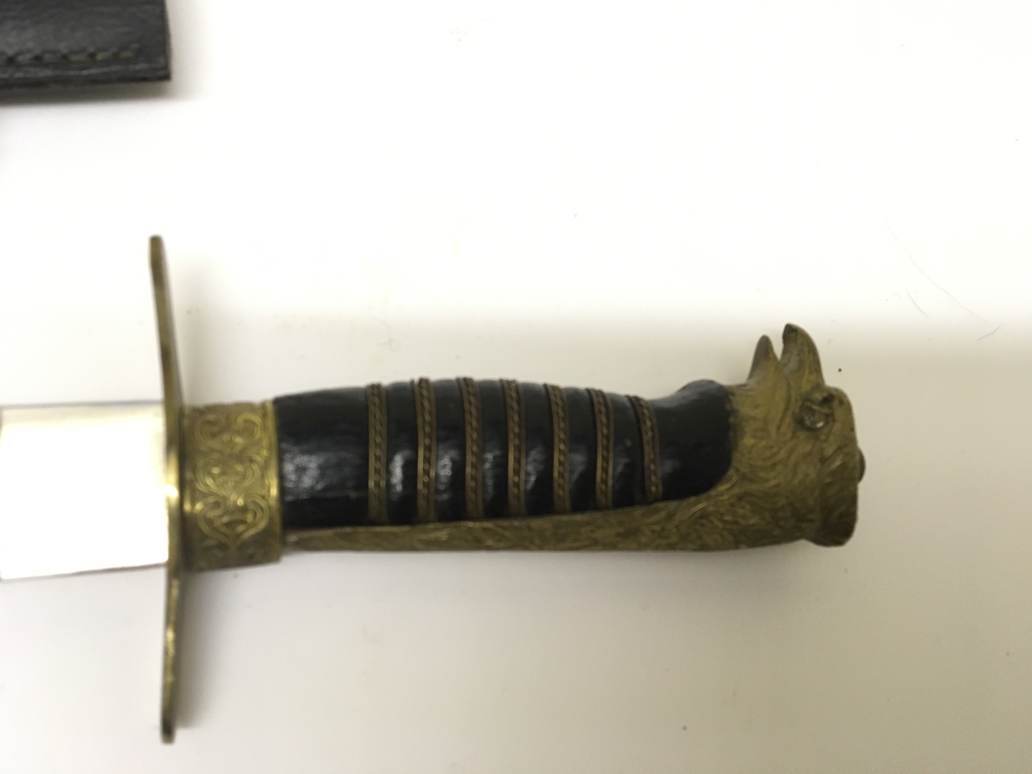 An unusual German Third Reich type dagger with an eagle head pomel with gilt metal glass eyes and wired grip with attached fitting leather scabbard. Length 29cm