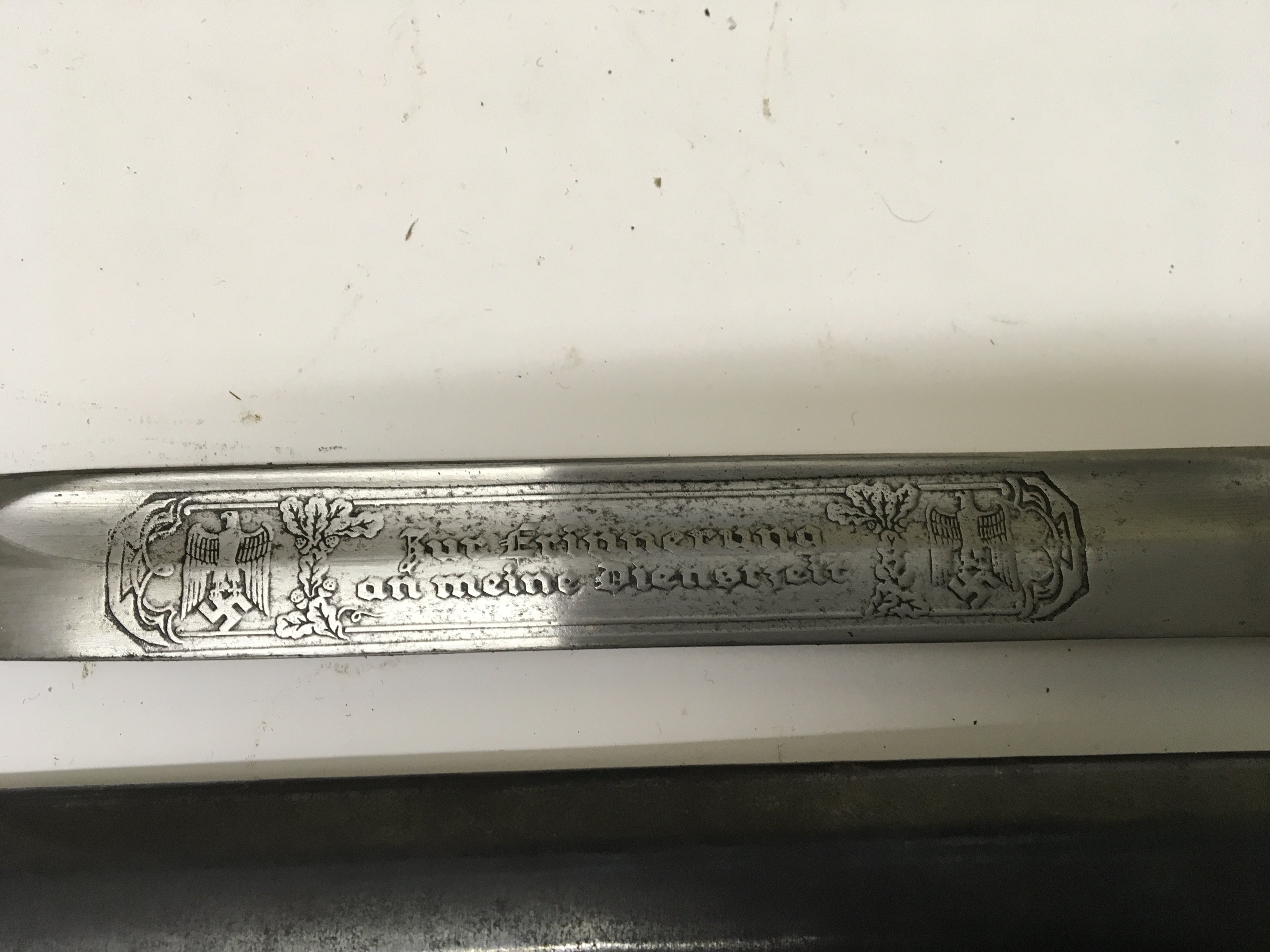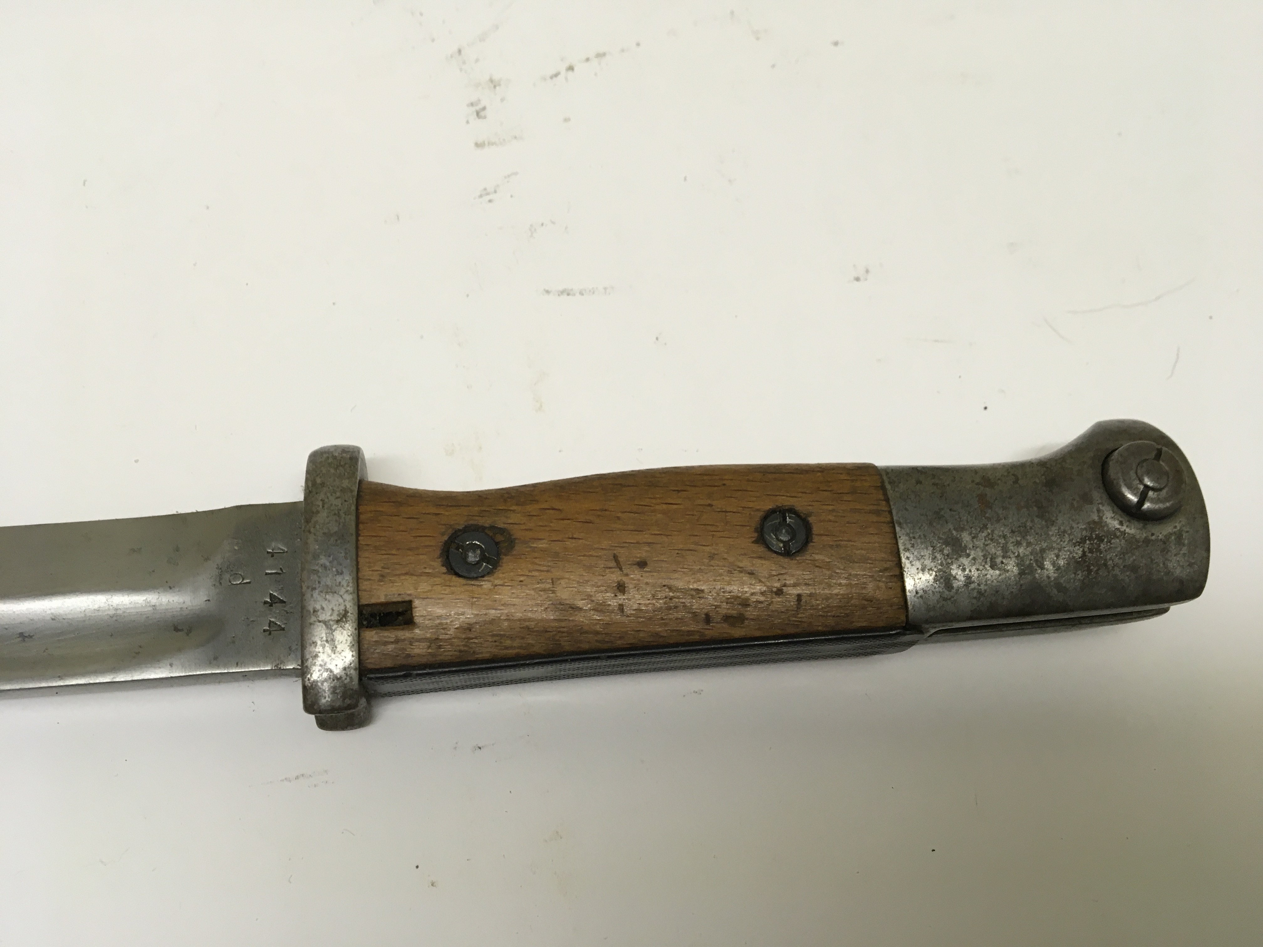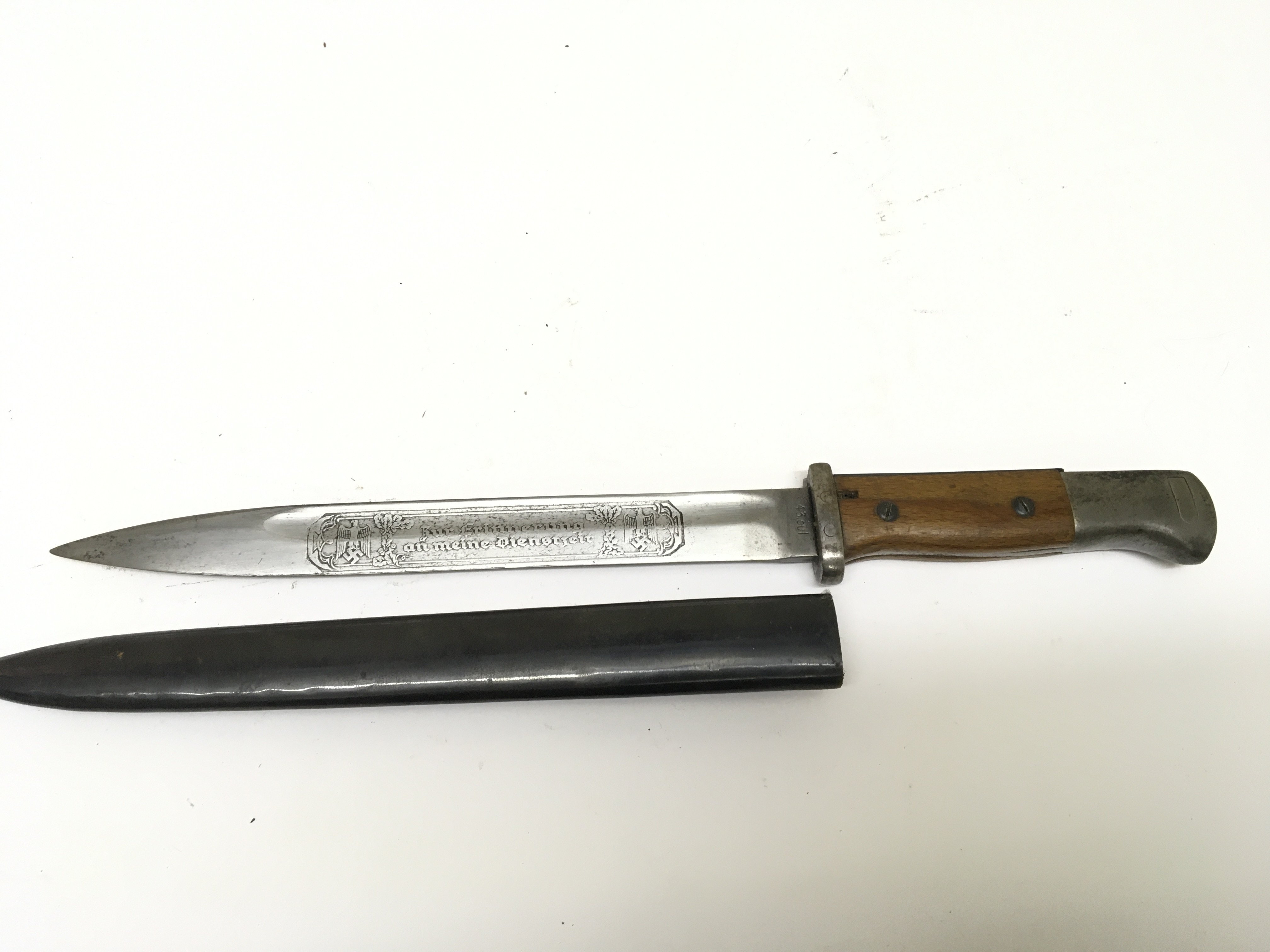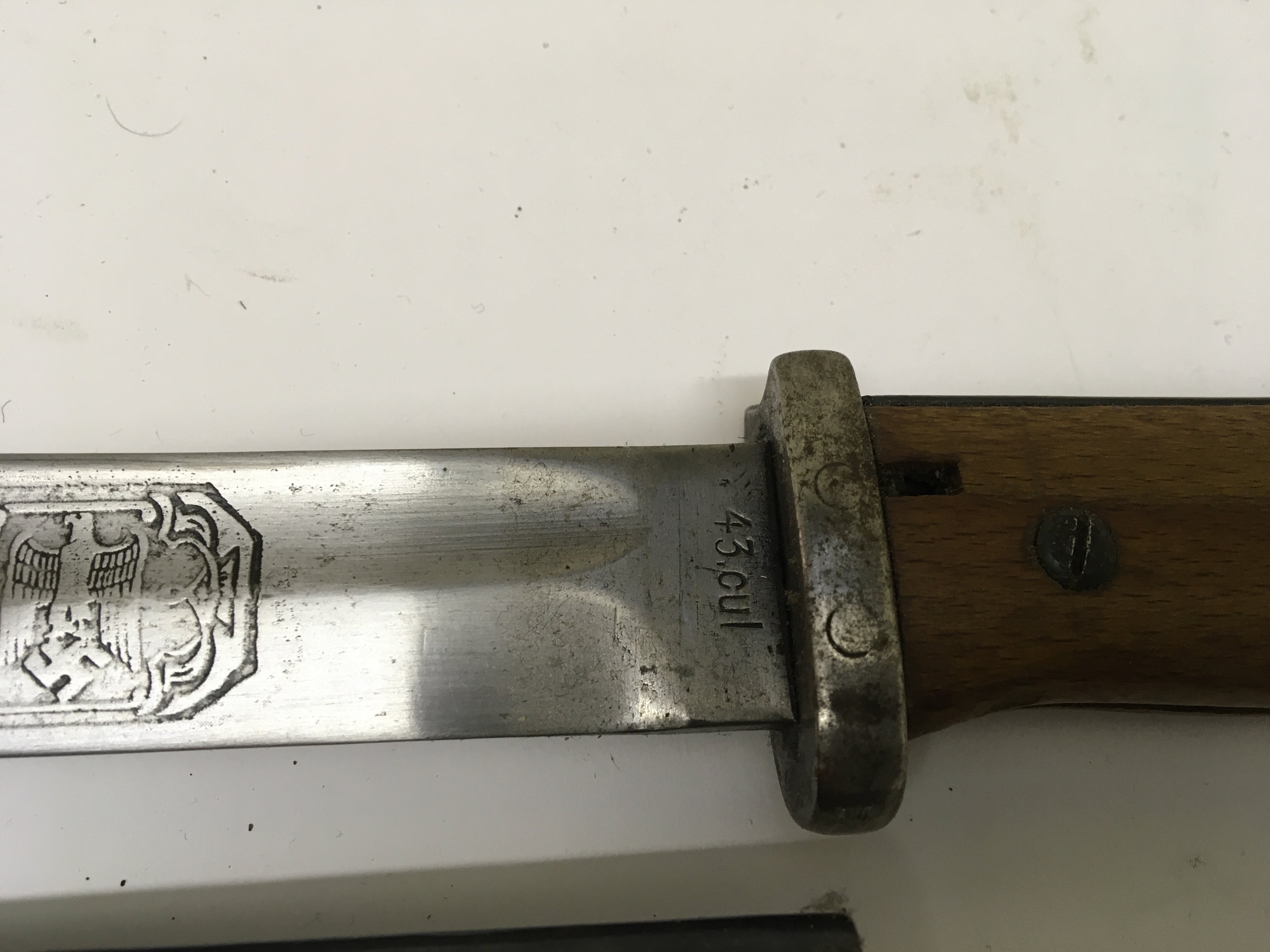An unusual German Third Reich bayonet K98 Waffen SS with etched blade and plain wood grip. Length 40cm