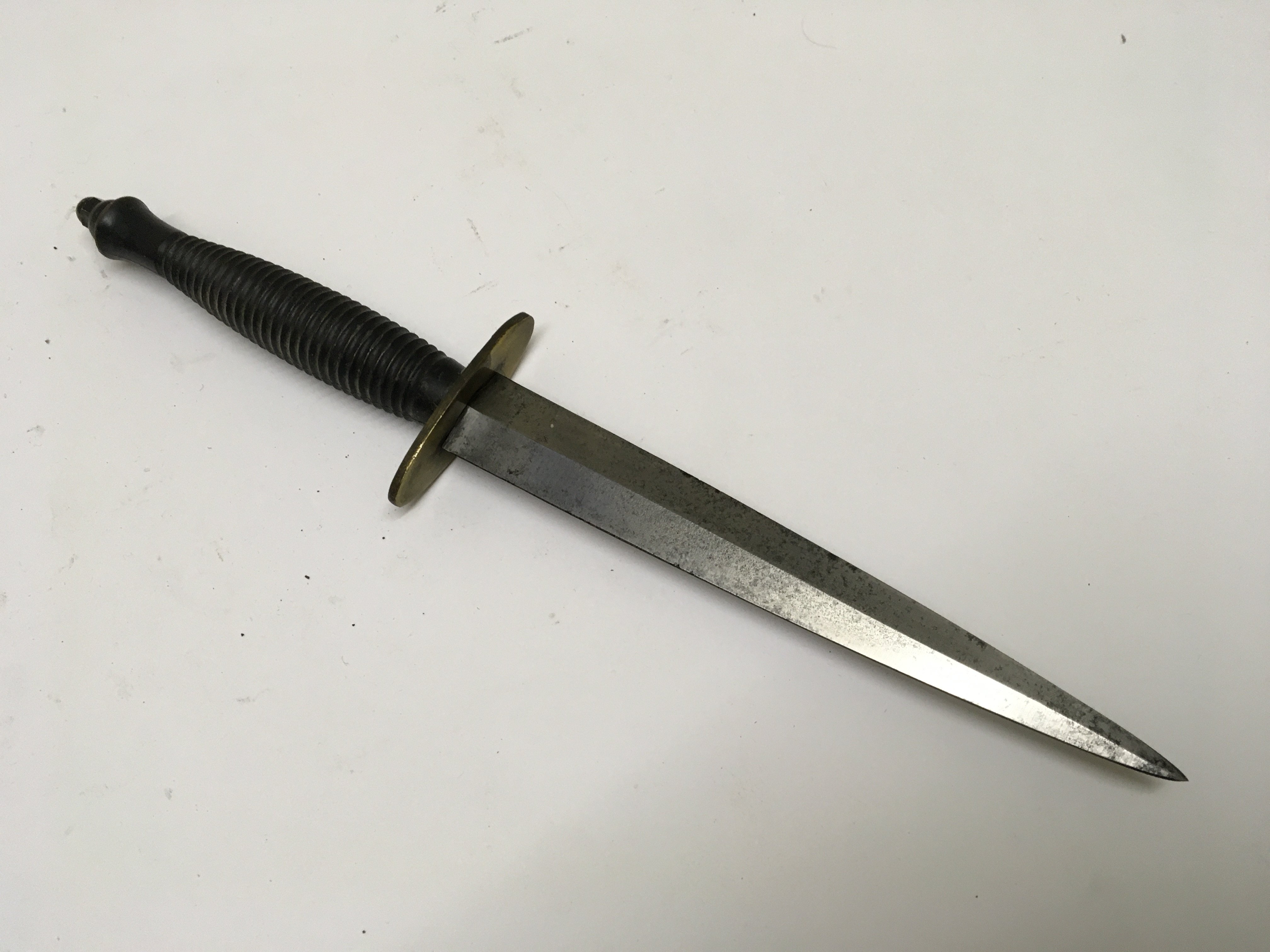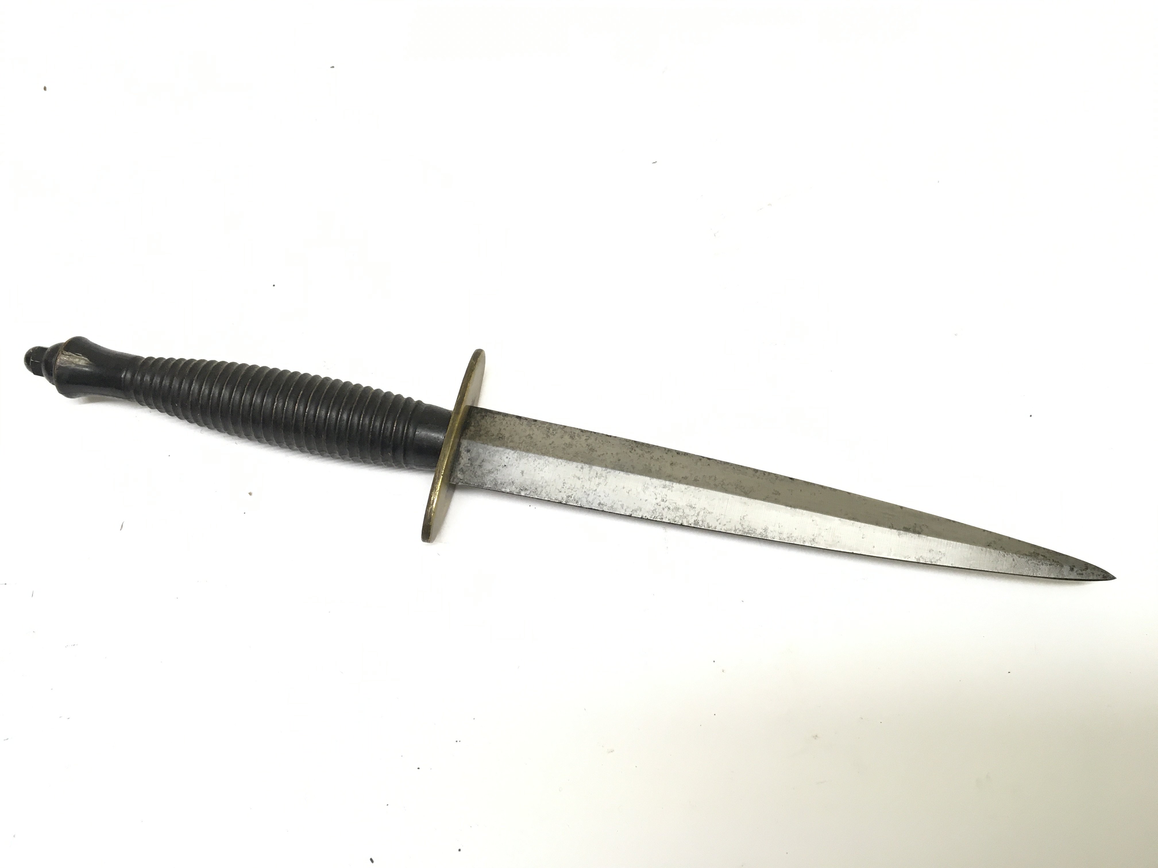 A Fairbrain Sykes commando British fighting knife with oval ended Brass cross guard blacked metal ribbed grip. Length 29cm