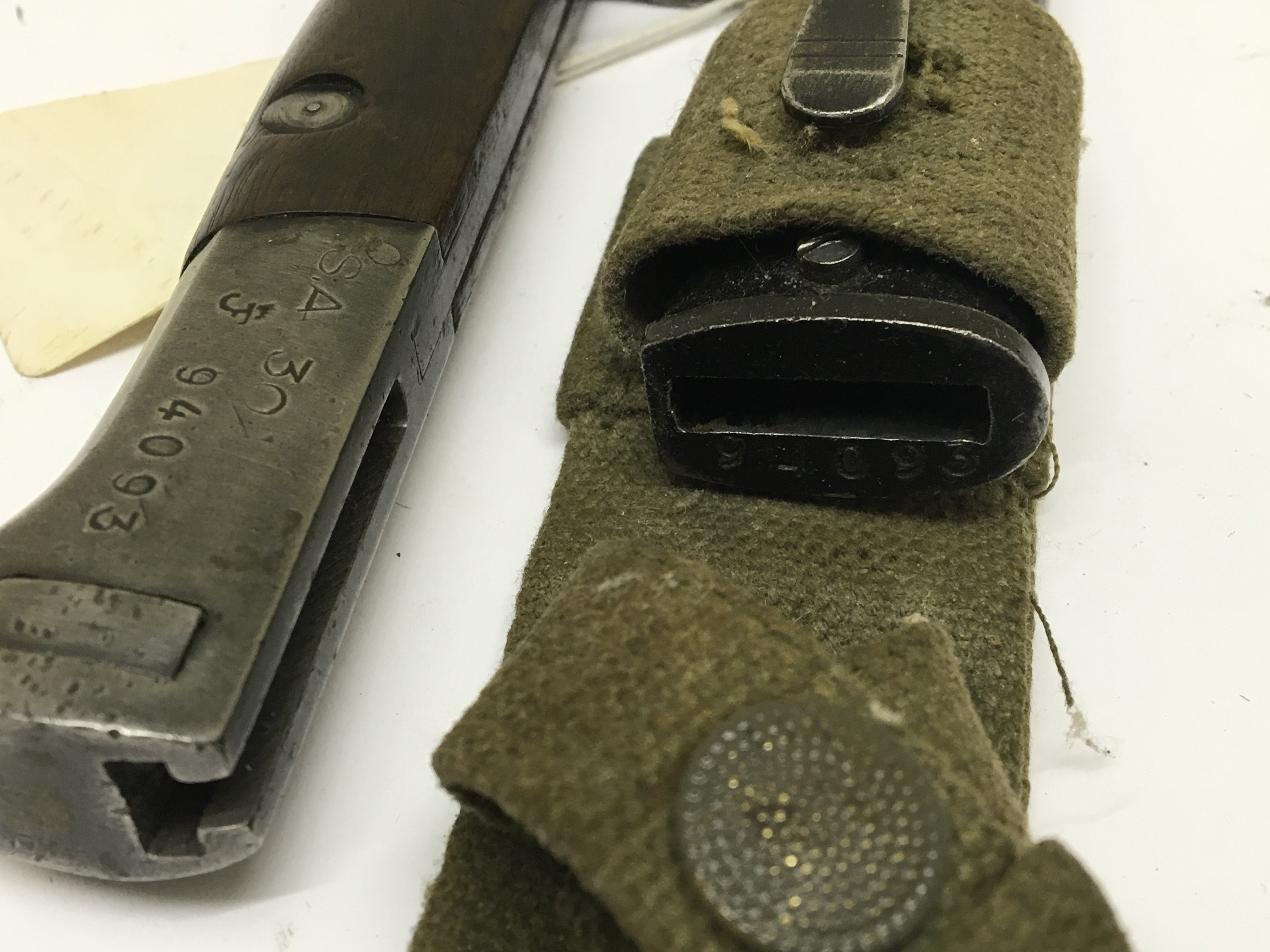 A German Imperial Colonial overseas forces bayonet S71/84 with a wood and steel grip stamped SA30 with a green canvas frog metal scabbard. Length 38cm