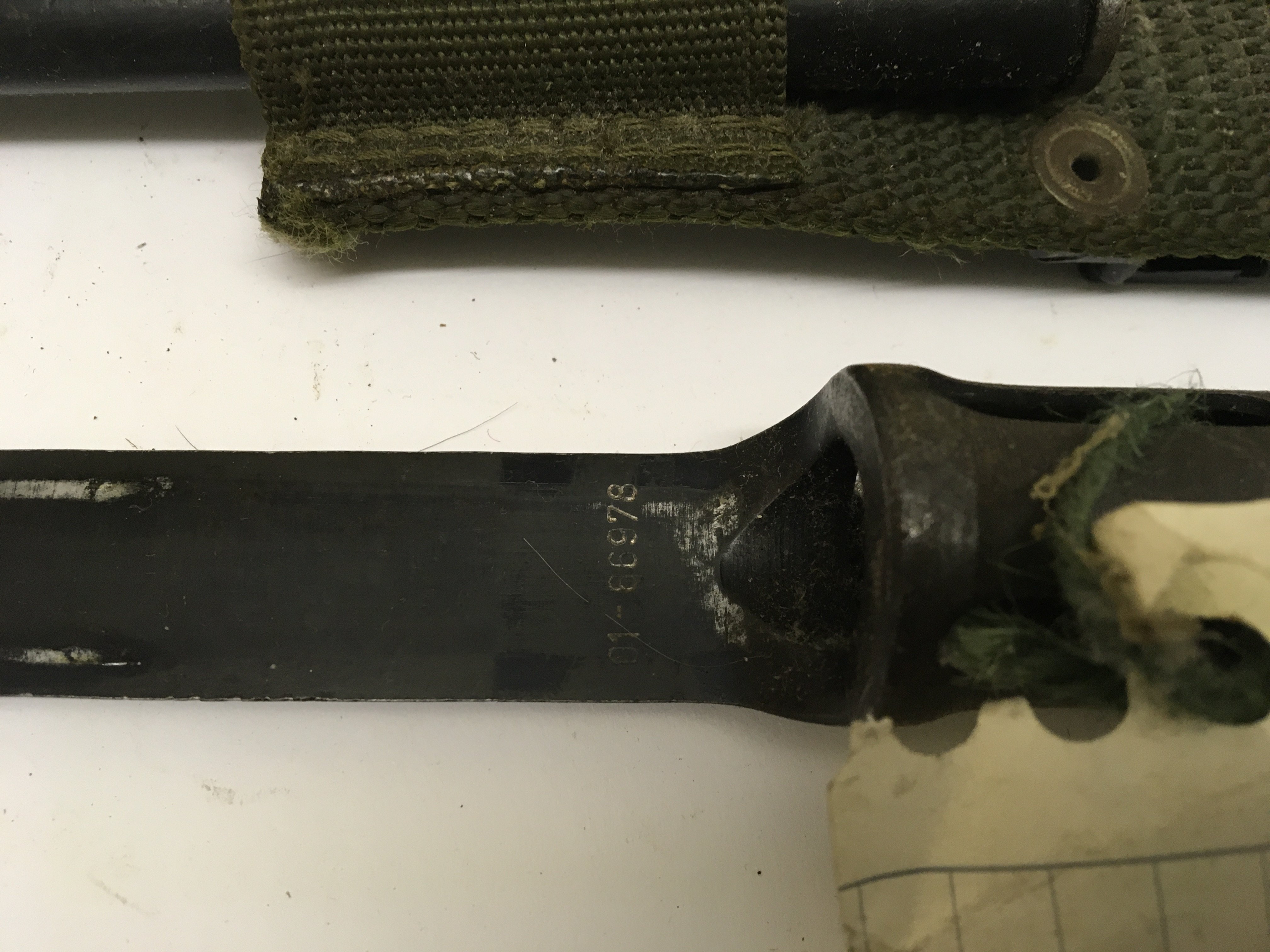 An Argentinian Falklands war relic bayonet Templex the blade with serial number and green woven fabric frog.