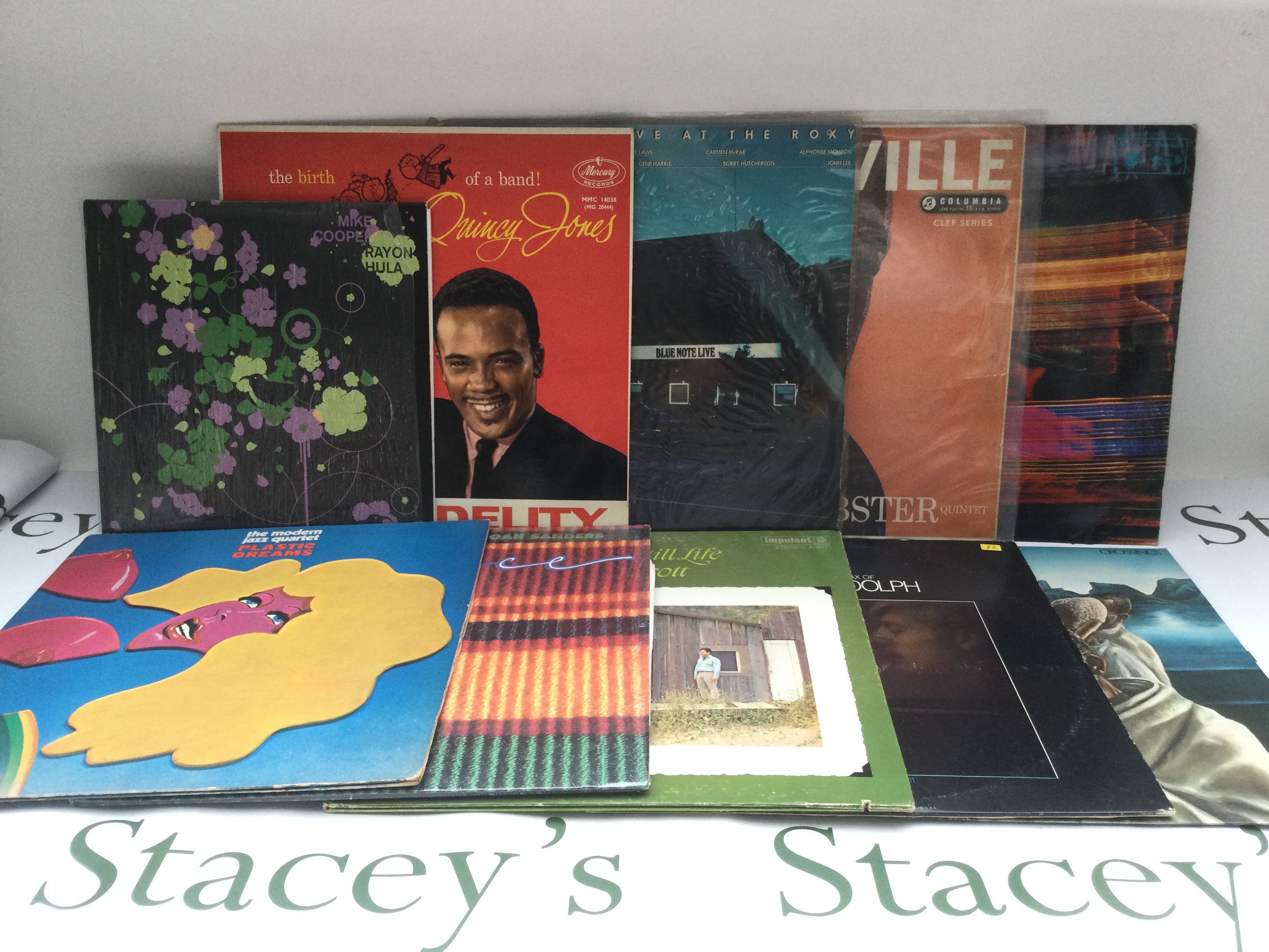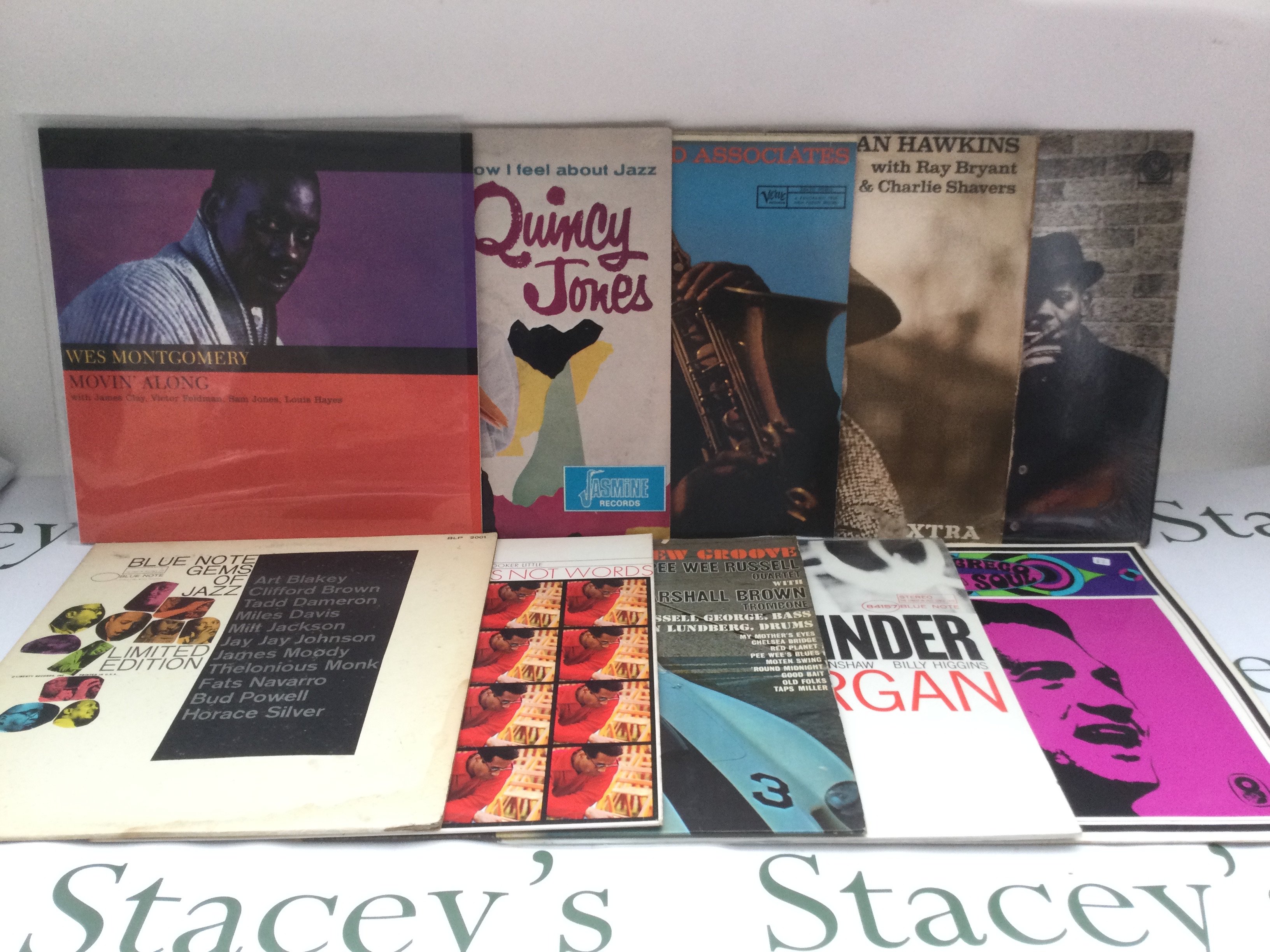 Two bags containing 20 jazz LPs by various artists including Coleman Hawkins, Quincy Jones, Wes Montgomery and others.