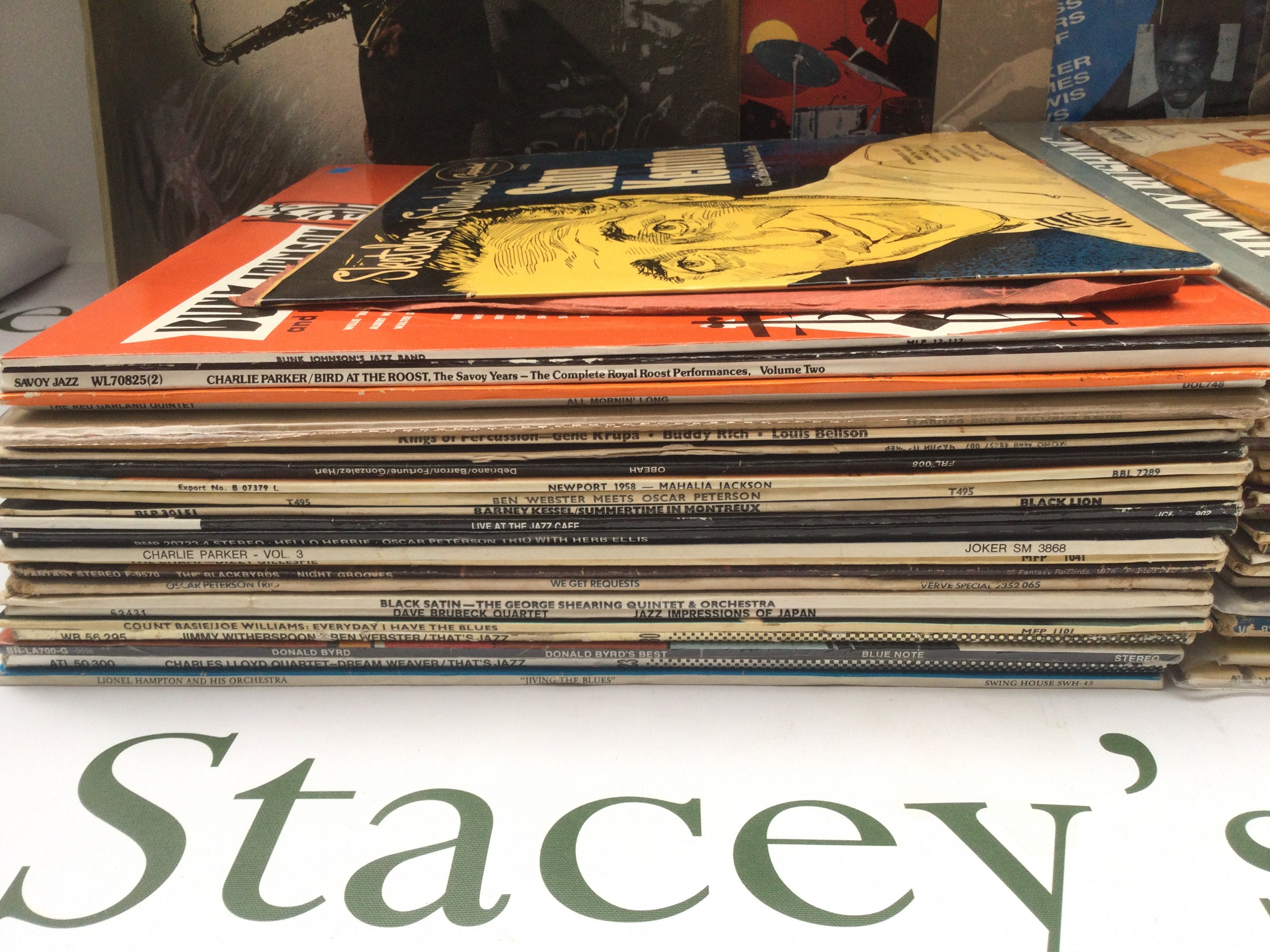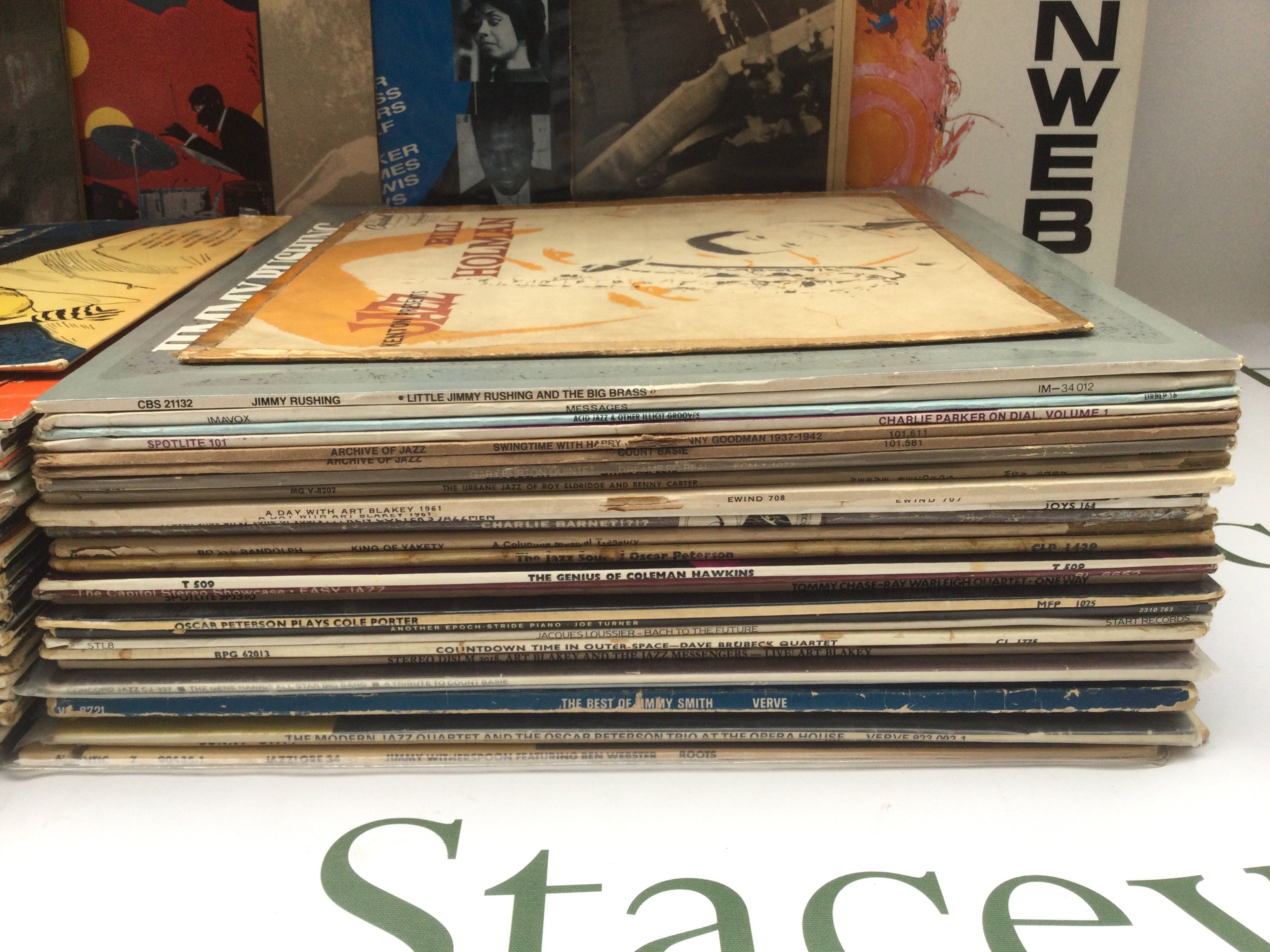 A collection of jazz LPs by various artists including Sonny Rollins, Donald Byrd, Jimmy Smith and others.