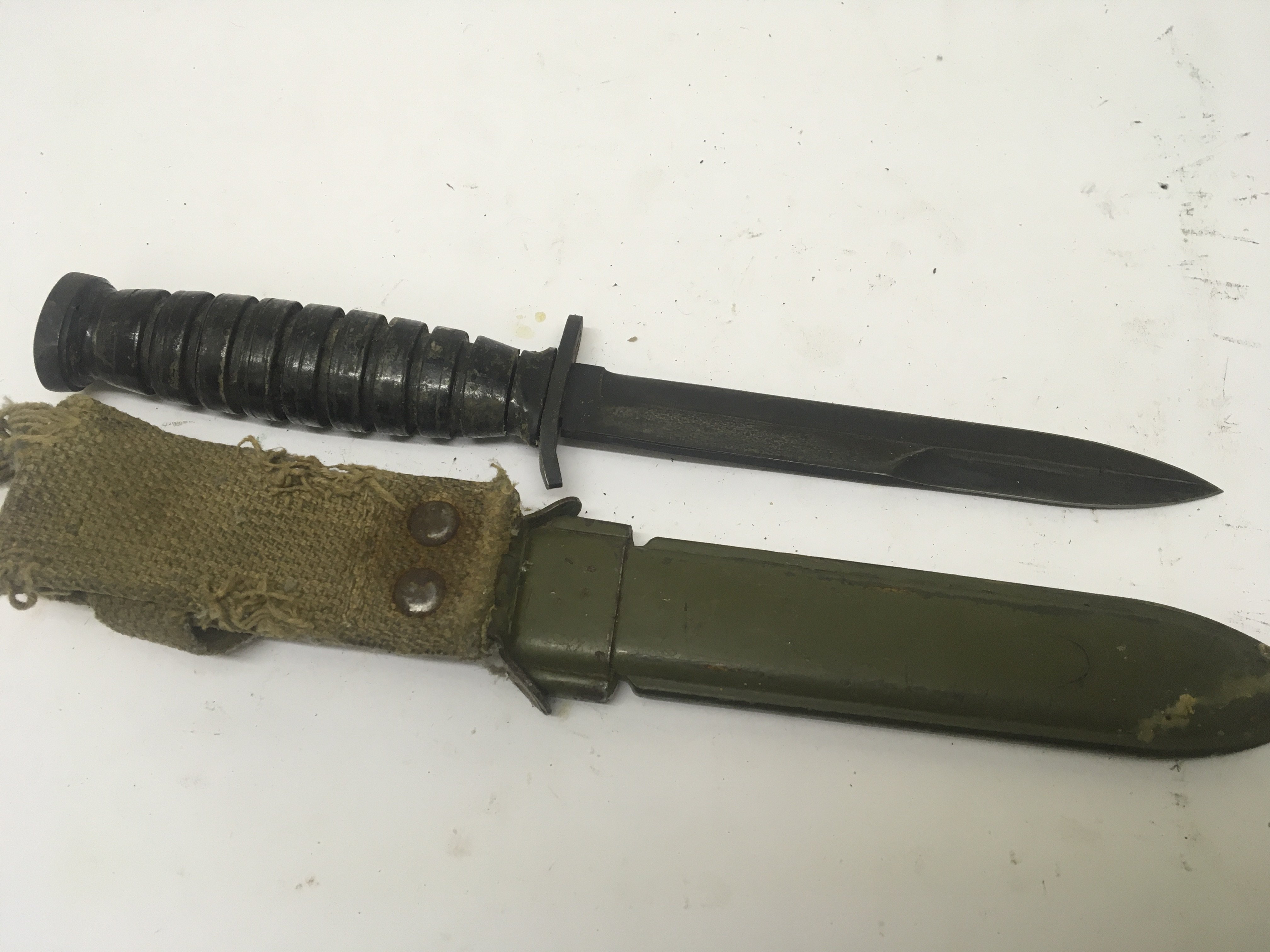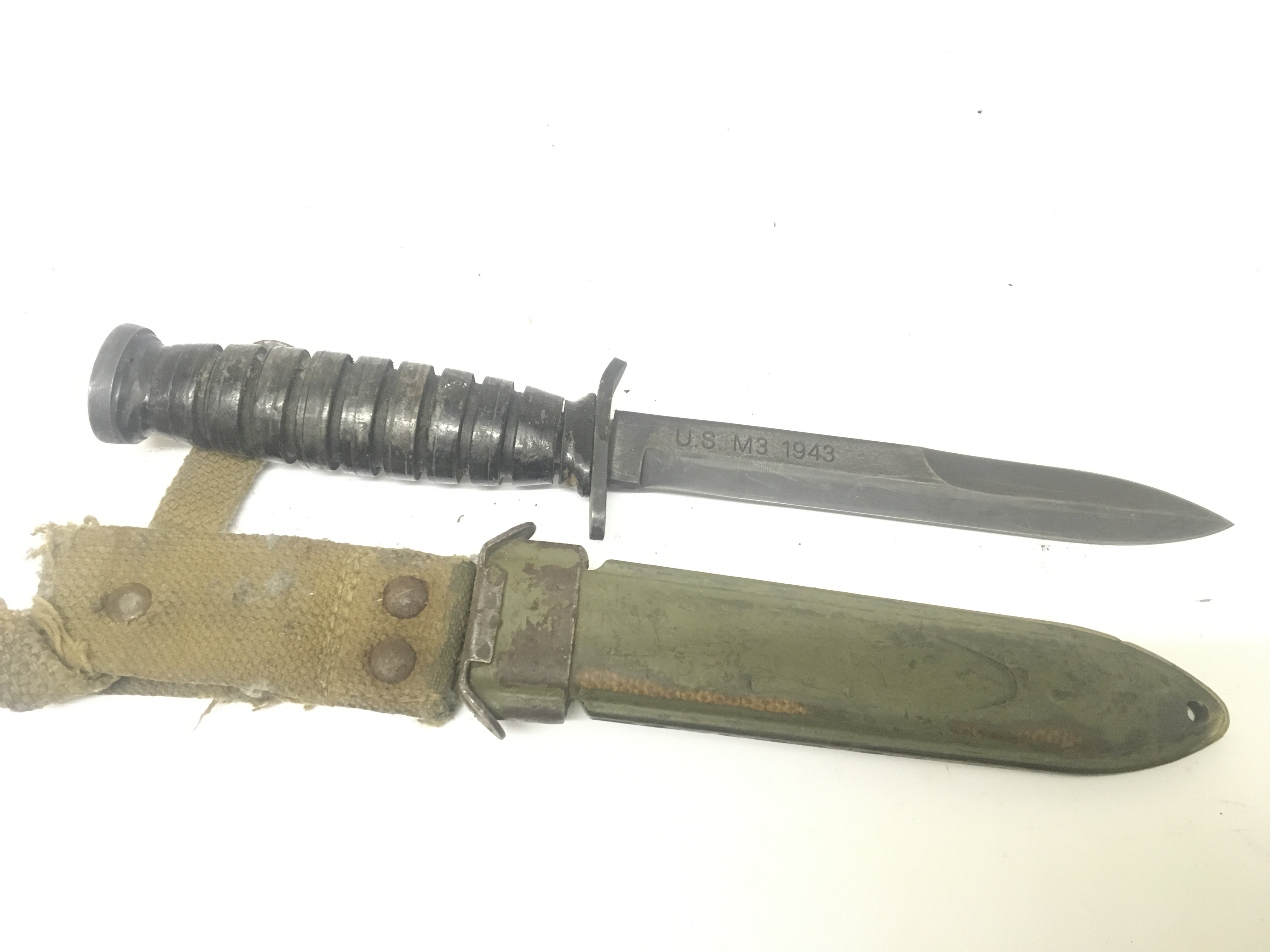 A US II world war fighting knife the blade stamped US M3 1943. Nice original example showing good wear in keeping with war use.with metal scabbard and woven belt frog.