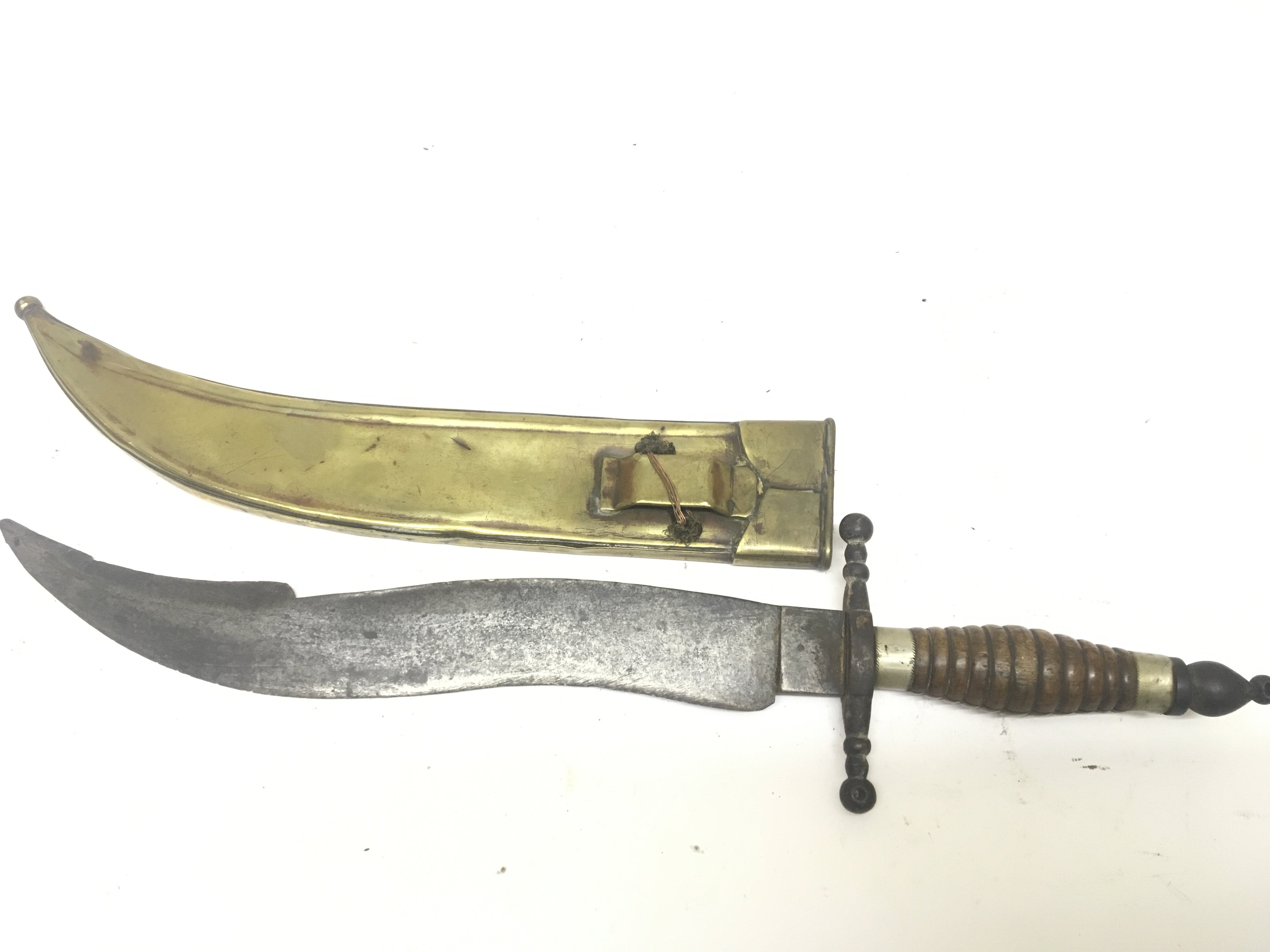 An Antique Knife with steel blade of Kris type with a turned wood grip and brass scabbard. length 45cm